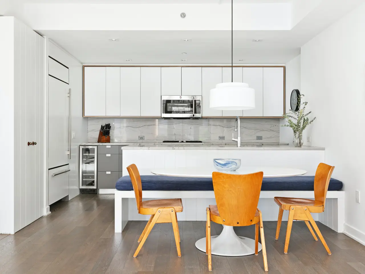 CONVERTIBLE THREE BEDROOM WITH HUGE PRIVATE TERRACE AND ON-SITE PARKING AVAILABLE! Formerly a legal 3 bedroom, (see original floorplan in media) this truly stunning, light-filled apartment has been thoughtfully reimagined as a magnificent 2 bedroom, 2 bathroom home with an expansive living/dining room. Featuring bespoke custom finishes throughout that add beauty and enhance function at every turn, the breathtaking interior could only be rivaled by the grand exterior terrace. (1,042 SF) A terrace that runs the entire width of the apartment and can be accessed from the living room and the master bedroom suite! This exquisite apartment is finished with 5" fumed white oak flooring and show stopping floor to ceiling black metal framed windows of double layered insulated glass that provide energy efficiency, pin drop quiet and pour light into the space. The open kitchen with abundant cabinet and counter space and large pantry features a large Luce de Luna Quartzite island with a built-in custom banquette for added storage. Additional kitchen features include a Thermador range, Insinkerater garbage disposal, wine fridge, Sub Zero refrigerator and a Bosch dishwasher. Journey down the hallway toward a charming sunny second bedroom on your left and a large spa-like second bathroom with a deep soaking tub to your right. Continue on and pass a large laundry closet that has been outfitted with built-in shelving that includes a folding table, a Bosch washer/dryer and plenty of extra room for household cleaning supplies. At the end of the hallway you'll discover a beautiful and bright master bedroom suite with large built-in closets and another direct access point to the magnificent private terrace. The en suite master bathroom features Carrera marble countertops, Italian porcelain tiles and a rain shower. Building features include a full-time attended lobby, live-in super, state of the art fitness room (with a Peloton bike!), bicycle storage, a common media lounge and two common outdoor spaces. 205 WATER was ground up new construction, (fully completed in 2012) and was uniquely designed for sustainability and achieved the prestigious LEED Gold Certification. On-site parking and two storage units are available for additional purchase!