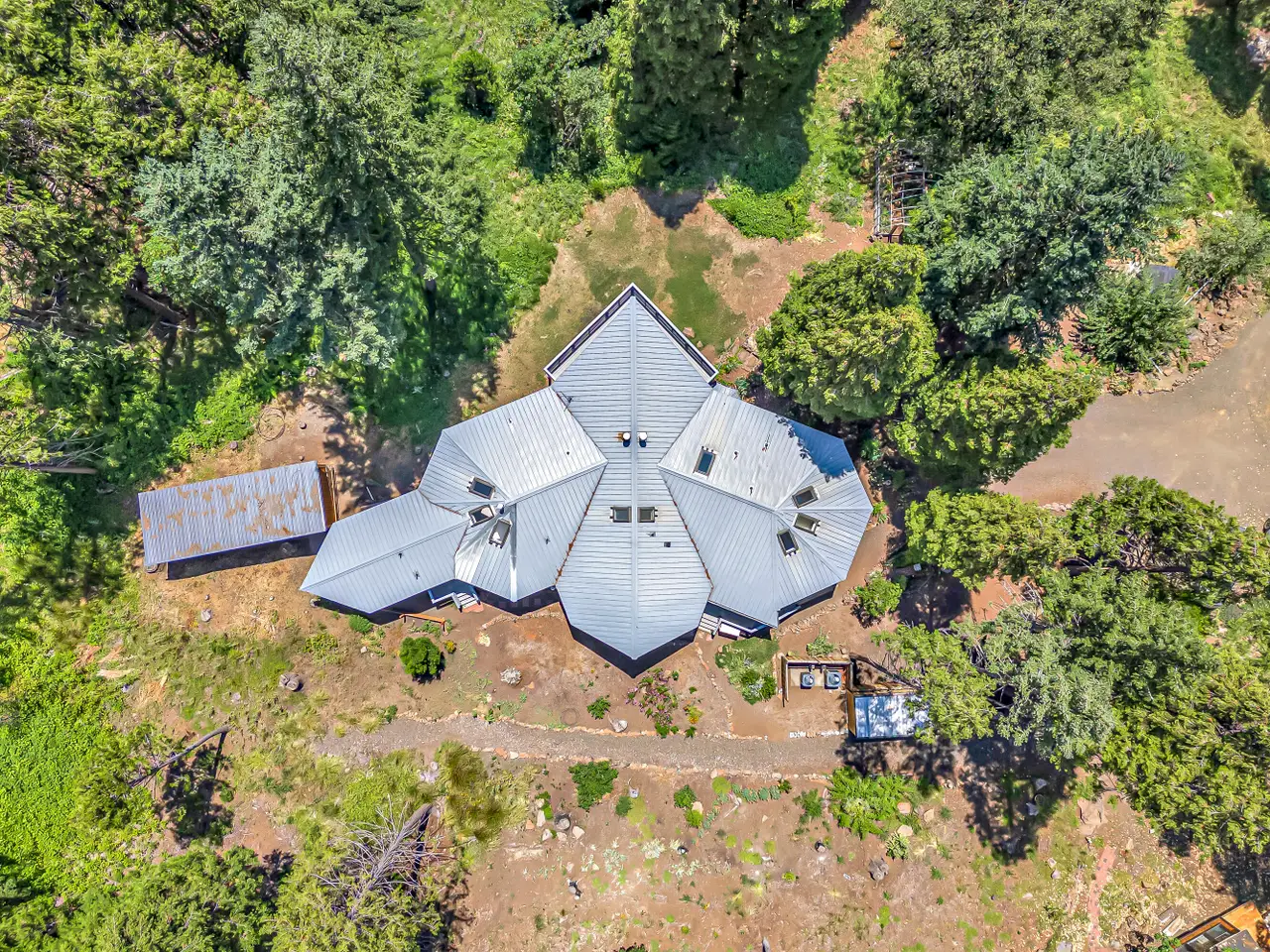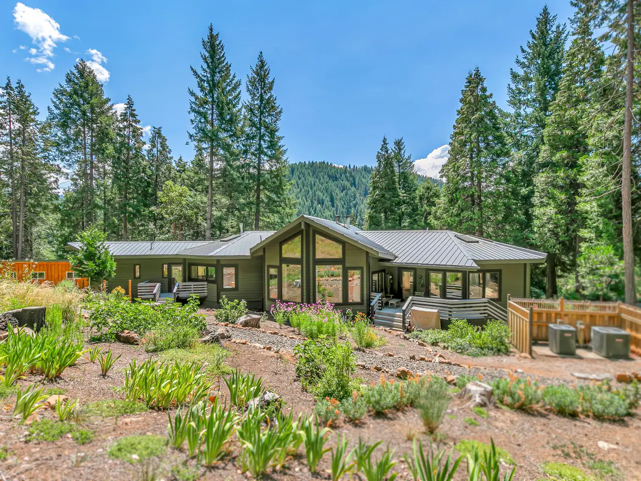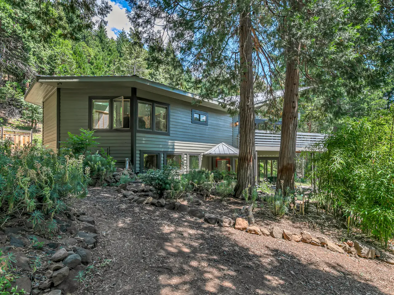 Private country estate with rare potential multi-family setup on serene acreage with North Fork Little Butte waterway flowing through property - just 25 minutes to Eagle Point! Extensive renovations over the last five years include all new Andersen windows and sliding glass doors, upgraded electrical with underground service, and new HVAC systems. Main level with abundant natural light and air flow, high ceilings with unique architectural vaults, exposed beams, skylights, curved walls and archways, three very spacious bedrooms, two full baths, formal dining, living, family room, and laundry mudroom. Lower-level apartment with full kitchenette, separate living and dining areas, large bedroom with walk-in closet, and full bath. Detached guest cottage complete with kitchenette, vaulted living area, loft, bedroom, full bath, and laundry mudroom. Property features ornamental and edible plantings, new chicken coop, woodshed, storage shed, and ~500 SqFt insulated studio. Inquire for details!