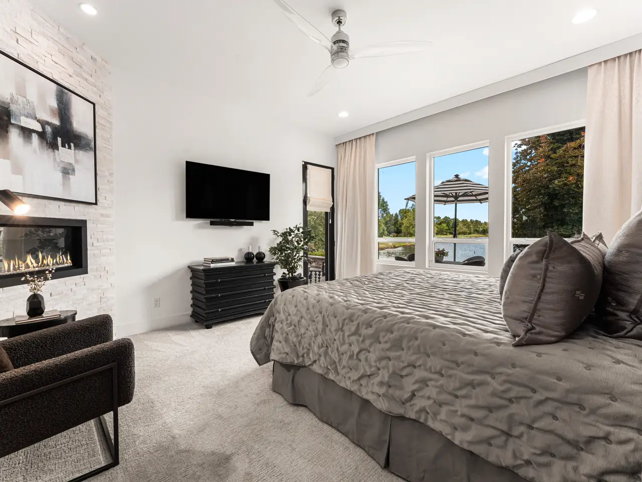 Experience refined living in this one-of-a-kind custom-built residence, set on a private waterfront lot within the prestigious gated Lakemoor community. Situated on a quiet, dead-end cul-de-sac with direct Greenbelt access, this prime location is just steps from the renowned Crave restaurant and the Lakemoor District shops. The sleek, modern interior is adorned with soaring double-height ceilings, rich hardwood flooring, and expansive windows that flood the home with natural light. The open-concept living space centers around a dramatic floor-to-ceiling stacked stone fireplace and flows seamlessly onto a covered patio equipped with a full outdoor kitchen. The kitchen features a curved granite island, Thermador and Sub-Zero appliances, a walk-in pantry, and a convenient dumbwaiter. The luxe master is set on the main level while the upper level hosts a large bonus room and full Jr. Suite. Enjoy exceptional amenities including two resort-style pools, sports courts, & walking paths with fabulous walkability!