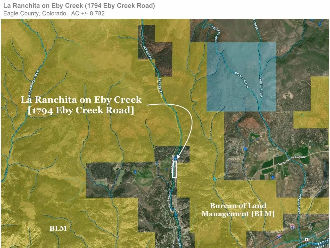 La Ranchita on Eby Creek (a.k.a. 1794 Eby Creek Road) is an 8.782 +/- acre 'live water' property in Eagle County, Colorado. La Ranchita includes a 5,559 square foot single-family home with seven bedrooms / eight bathrooms [one of the bedrooms / bathrooms being a lock-off apartment], an upper level living room, a lower level family room, a large 3rd floor flex [crafts] space, a mud room, covered decks, 'the turret', an oversized three vehicle garage, a chicken coop, an enclosed garden & yard [including a greenhouse and 'the She-Shed'], a horse barn, and a pole barn + shed. Eby Creek [with small pools for trout] runs year-round through the property. The 'Eby Creek' area is one of the most unique, beautiful, private, yet convenient locations in the Vail Valley. La Ranchita on Eby Creek is situated in unincorporated Eagle County [zoned rural residential] but is only 1.8 miles from City Market [Kroger] and 2.3-miles from the Town of Eagle. Other distances include 25-miles to Beaver Creek [skiing], 31-miles to Vail [more skiing], and 8-miles to the Eagle County Regional Airport & Jet Center [EGE]. The La Ranchita offering includes water rights. A custom interactive map of the property and the surrounding area is available upon request. Additional photos are forthcoming.