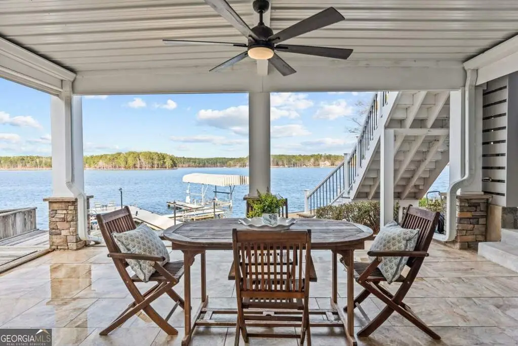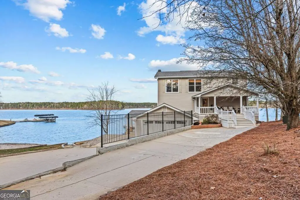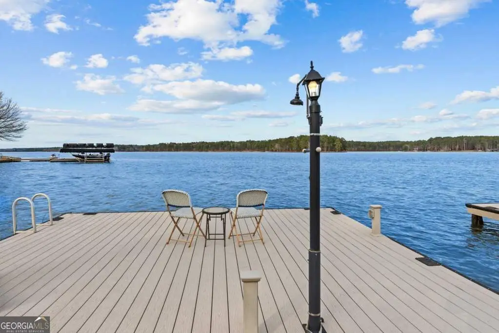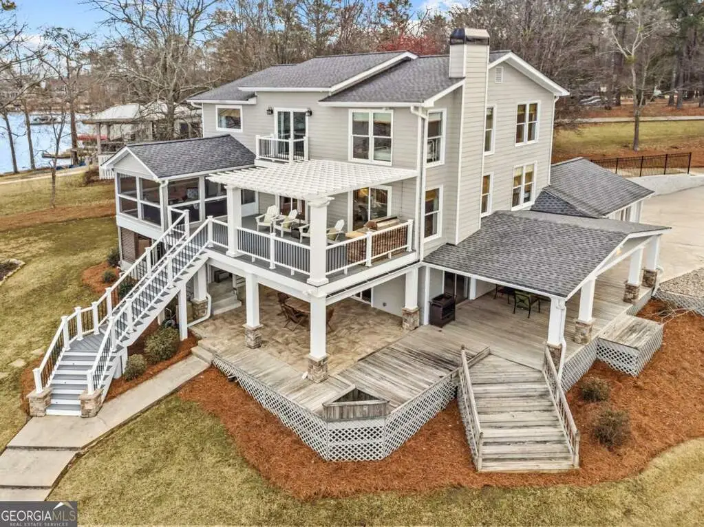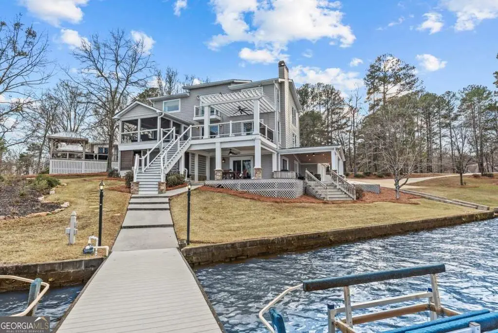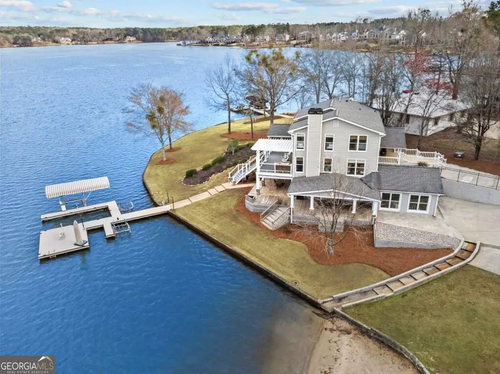 Welcome to this breathtaking 4-bedroom, 3.5-bathroom lakefront home, perfectly situated on a spacious lot with over 250 feet of pristine water frontage in Martin Oaks on the coveted shores of Lake Oconee. Offering unparalleled, panoramic views of the sparkling lake and surrounding natural beauty, this exceptional property is a true haven for waterfront living. The spacious living areas are designed to take full advantage of the lake views, with expansive windows that flood the home with natural light and provide stunning views from nearly every room. The open concept plan offers a beautiful living area with stone fireplace, gourmet kitchen with granite and stainless steel appliances, spacious pantry, dining room and inviting screen porch, all overlooking the lake! Finishing the main level is a generous guest bedroom and half bath. Upstairs you will find the owner's suite, a peaceful retreat where you can watch the sunrise from your bed. Offering a private balcony overlooking the lake, spa-like en-suite bath, and generous closet space, it is ideal for relaxing. Two additional bedrooms and full bath provide plenty of space for family or guests on the second floor along with a laundry room. On the terrace level you will find an oversized living space - perfect for an additional living room, bunk room or recreation room for everyone to enjoy! There is another full bath and laundry room plus extra storage for all of your boat and lake items. Step outside to your own private paradise. The property boasts a max dock with 10 feet of water depth along with two PWC lifts. It offers deep water access perfect for boating, fishing, and all your water activities. Enjoy the adjacent beach and cove, ideal for relaxing with family and friends by the water's edge. The home offers multiple outdoor entertainment areas - upper deck with pergola that has expansive views, two lower level porches, one overlooking the private cove and one with Main Lake views. Whether you're seeking a year-
