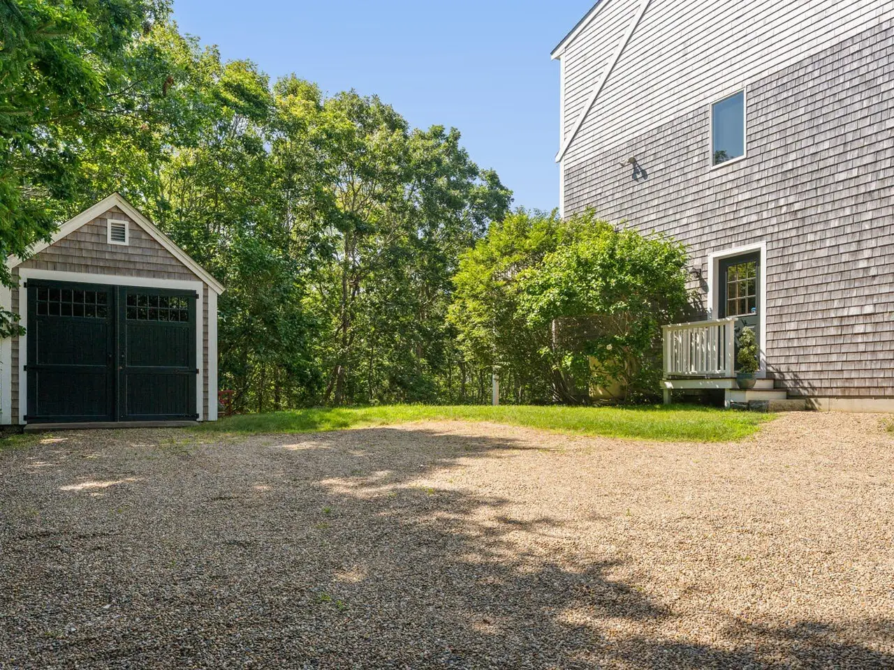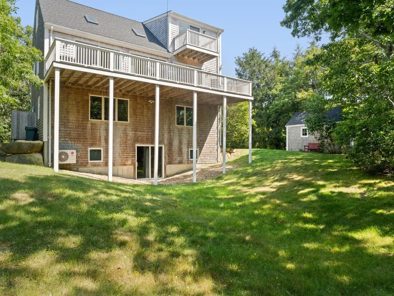Nestled in a tranquil residential neighborhood, at the top of a curved drive through beautiful trees, this well-maintained home in move-in condition offers an idyllic Martha's Vineyard lifestyle. Custom-built for quality and convenience by a prestigious Island builder, every detail was thoughtfully planned for exclusive use by the family as a cherished year-round vacation home. The open floor plan centers around the bright second-floor great room illuminated by skylights in the cathedral ceiling, and a wall of sliding doors leading to a large deck overlooking lush green treetops with grill and dining areas for al fresco entertaining. A third-floor loft provides overflow for guests or a lounge area with its own balcony for sunbathing or stargazing. The entry level includes a large primary bedroom with an en-suite bath, a convenient laundry alcove, and two additional bedrooms with a shared bath and soundproof insulation. New mahogany outdoor shower and shingles, recent carpet, roof and skylights are just a few of the improvements. A generous .92-acre lot offers peace and privacy, and the walk-out basement allows for future expansion within the existing footprint to take full advantage of the 7-bedroom capacity with permitting and a tie-in to the available sewer connection. Cycle easily to Edgartown Village or up-island on the nearby bike paths including the Meetinghouse Way bike path leading to South Beach. A detached Salt Spray car barn and a beautiful landscape with lawns, giant blue Hydrangea and a trellis with flowering Clematis vine complete the property.