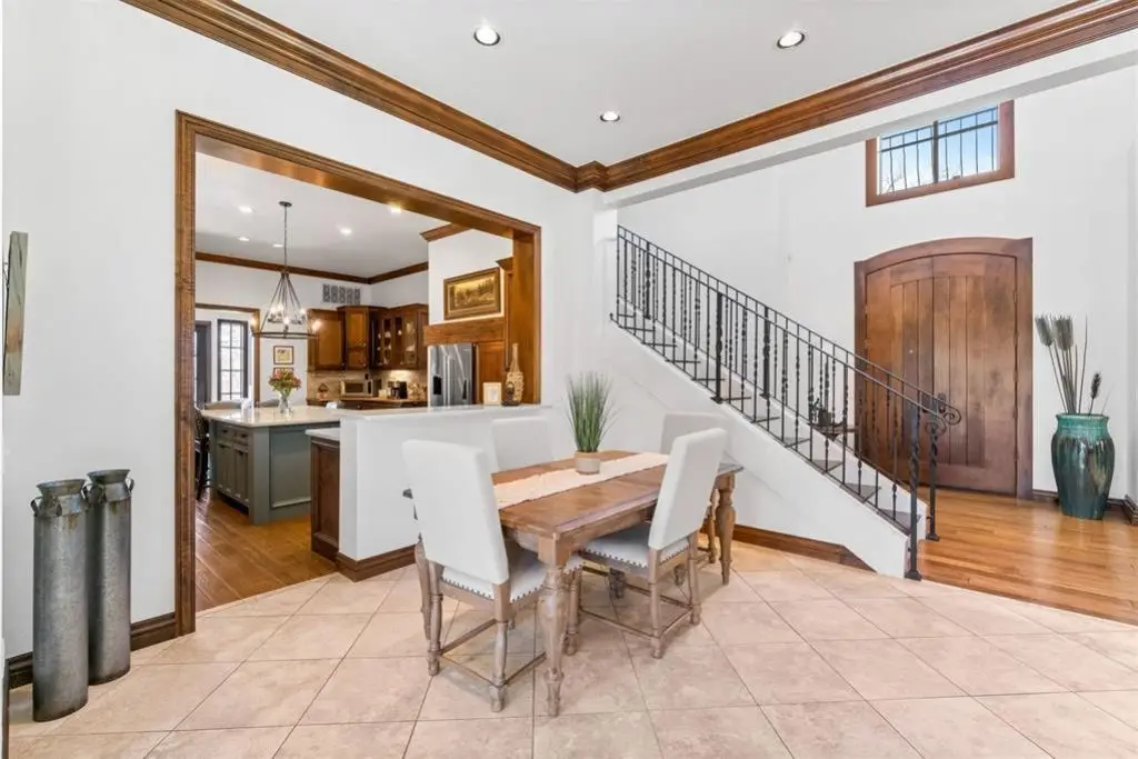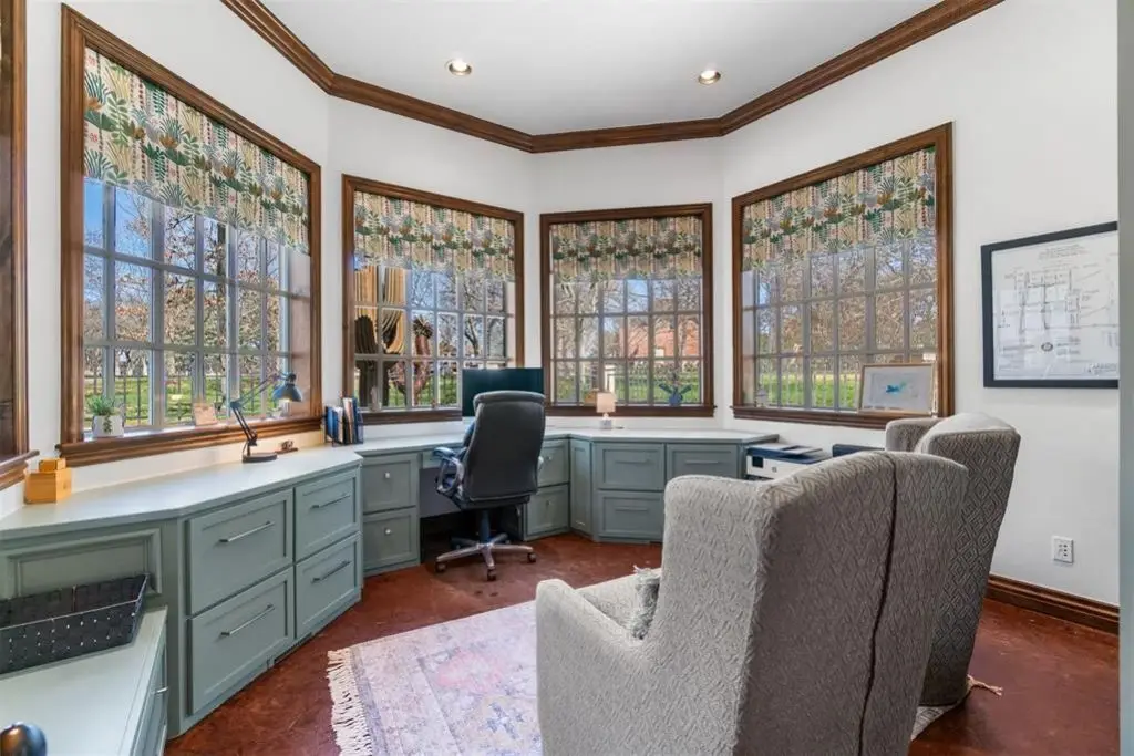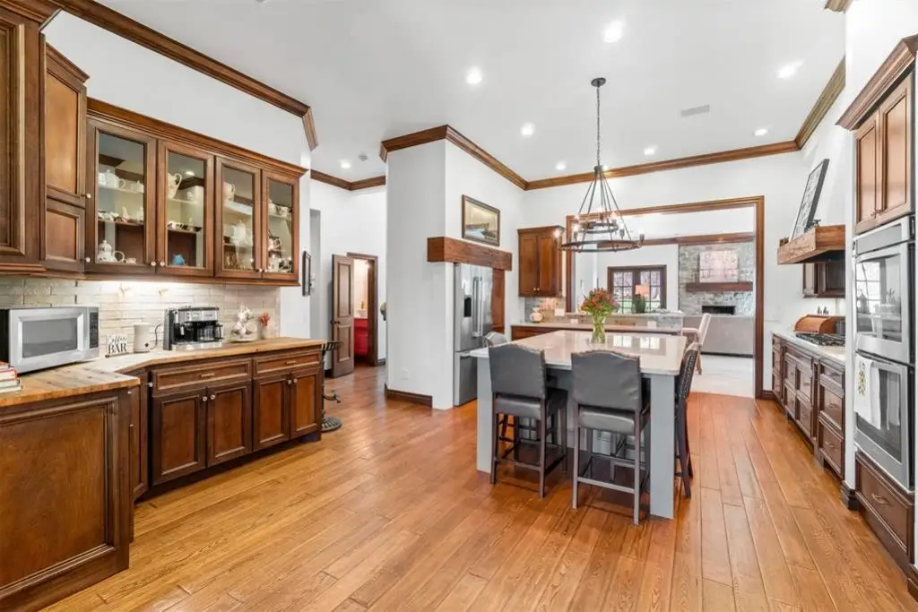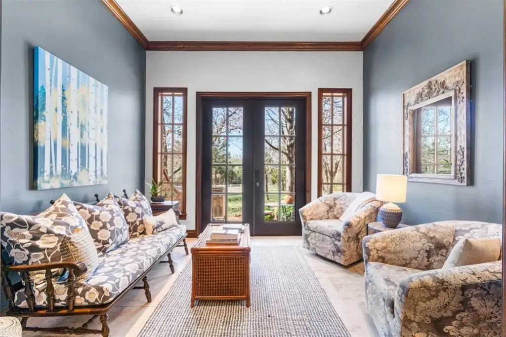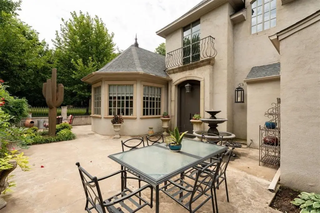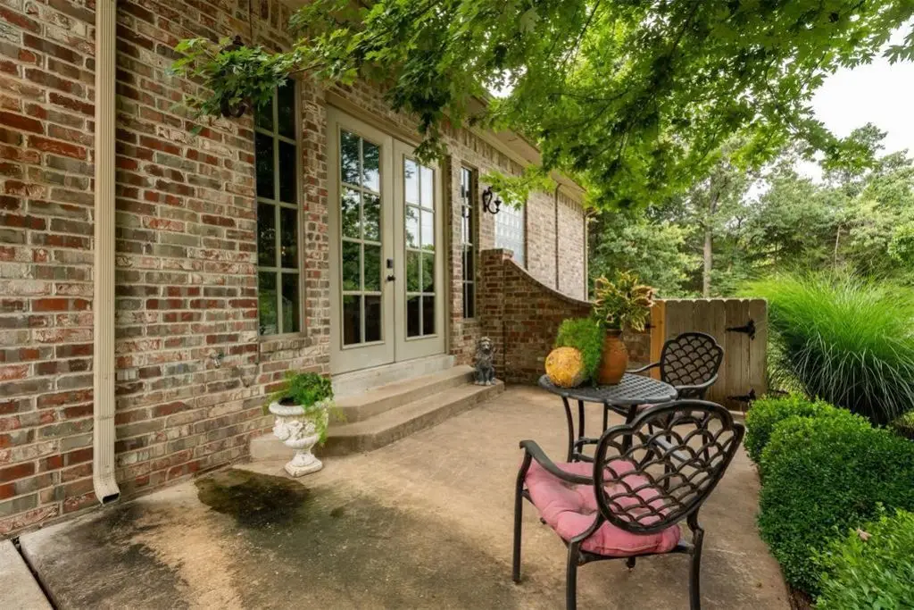 Exceptional custom home in the exclusive gated Edinborough Pointe Community. This Edmond home with its exquisite curb appeal is beautifully situated on a wooded private 14 acre lot As you approach the front entryway the beautiful manicured gardens lead into a private brick and rod iron courtyard Entering through the grand front doors you are welcomed by an open living concept with large windows that drench the home with natural sunlight tall ceilings and french doors that lead out to the wraparound patio The living area features a custom wet bar and stone fireplace Dining room leads into the upscale gourmet kitchen with eat in bar custom floor to ceiling cabinets new granite tops a six burner gas stove double ovens and a coffee bar The primary suite features a large bathroom with two walk-in closets This home features a beautiful office with walls of windows and built-in shelving Off of the kitchen is a living room-morning room with french doors that open to the beautiful side yard The upper level includes two oversize bedrooms connected with a Jack and Jill bathroom and a fourth bedroom-flex room with full bath that is being used currently for a theater room There is additional storage in the upstairs area and large landing that overlooks the down stairs living area This home has been beautifully updated with granite-quartz countertops throughout the house new plumbing and electrical fixtures new paint added cabinets in office and kitchen refurbished wet bar new carpet upstairs tornado shelter and much more This house is a beautiful home for entertaining and relaxing a must have Seller Agent is owner