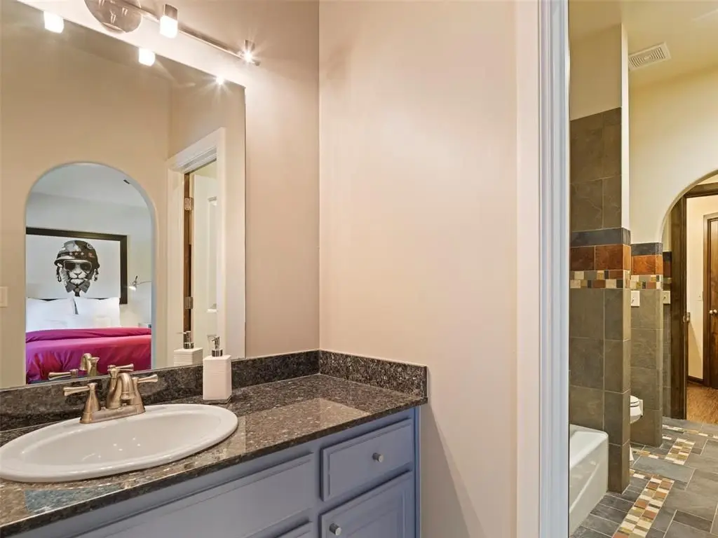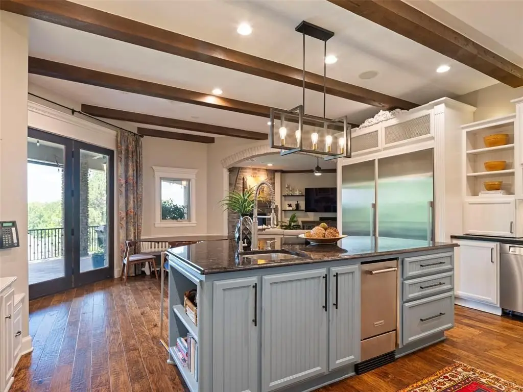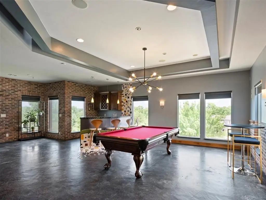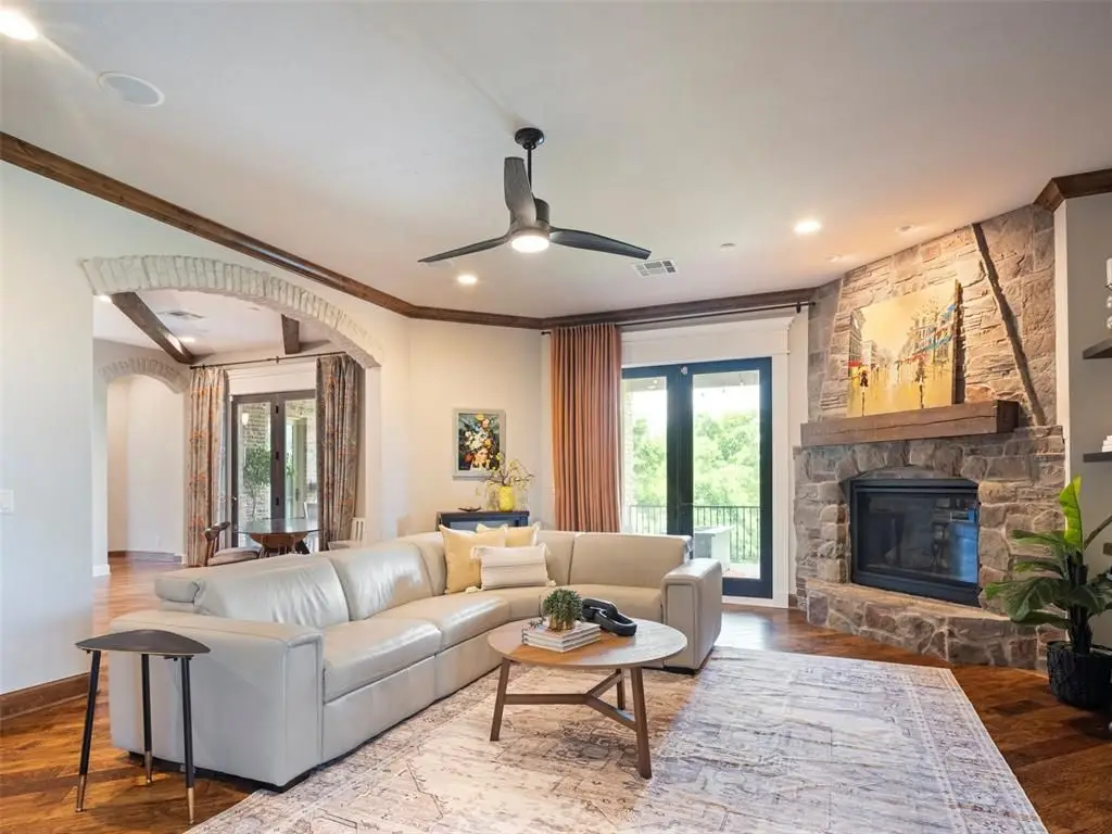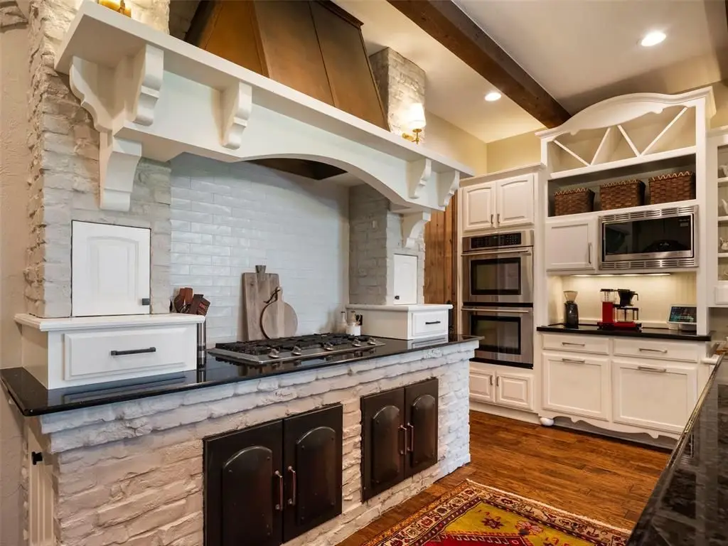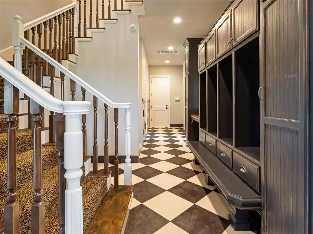 Nestled on a rare 77-acre corner lot in East Edmond's sought-after Creek Bend neighborhood this stunning Old English Tudor exudes timeless elegance and exceptional craftsmanship Mature landscaping and a stately presence set the tone for the grandeur within Upon entering the home you're welcomed into a dramatic foyer with soaring 20-foot ceilings and a sweeping custom iron staircase flanked by a richly appointed formal study and a refined dining room The study is a true showpiece wrapped in floor-to-ceiling stained woodwork and featuring a built-in desk bookshelves and a hidden door leading to a private desk area with discreet access to the primary suite The dining room is graced with custom wood moldings and a charming bay window overlooking the manicured front lawn The chef's kitchen is a dream for both everyday living and entertaining outfitted with double ovens a gas range a full-size Meile refrigerator and freezer and a built-in ice maker A Butler's pantry with custom cabinetry connects seamlessly to the formal dining space adding to the homes effortless flow The main living room with its warm stone fireplace and backyard views opens to a spacious game room complete with a bar and a private theater With a total of 6 living areas throughout there is space for everyone and every occasion The luxurious primary suite offers a serene retreat with treetop views dual vanities a makeup vanity jetted soaking tub oversized walk-in shower and an expansive walk-in closet Upstairs you'll find 3 generously sized bedrooms each with its own en suite bathroom and abundant walk-in closets The walkout basement adds even more versatility with its perfectly suited playroom with a built-in desk a workout room an additional bedroom with an en suite bath and provides access to an indoor sports court ideal for tennis pickleball or basketball This extraordinary home blends luxury functionality and entertainment in one impressive home