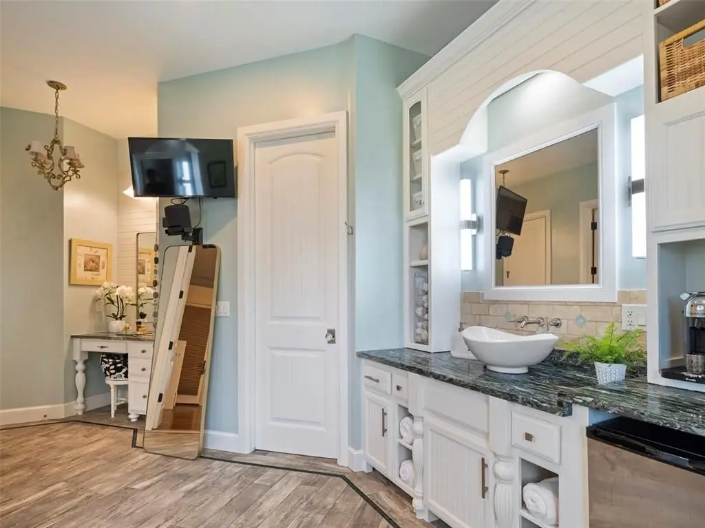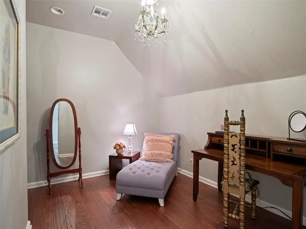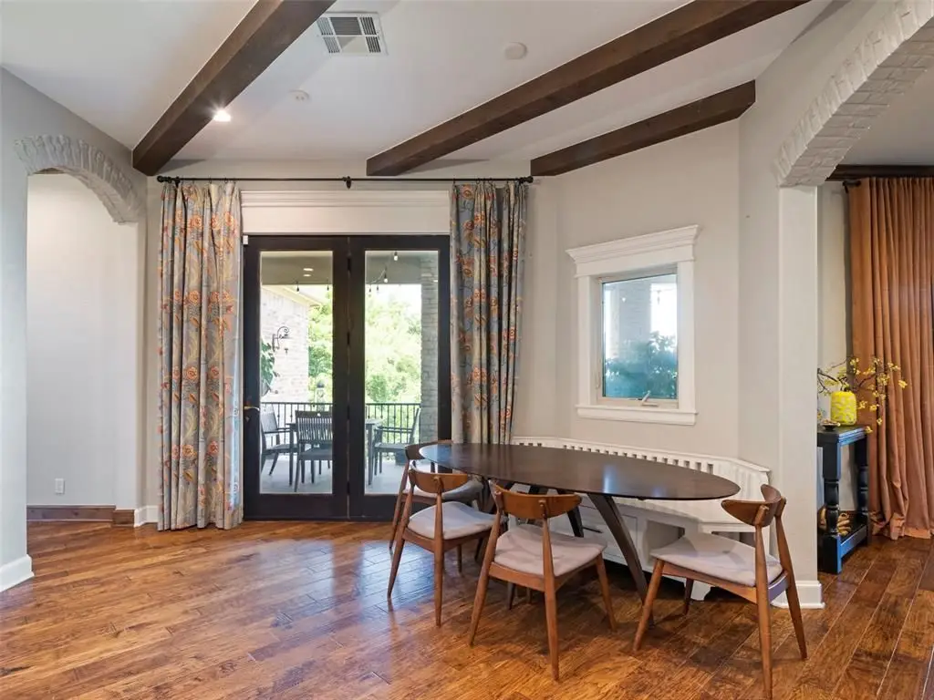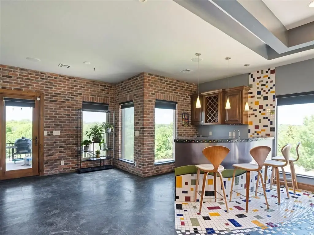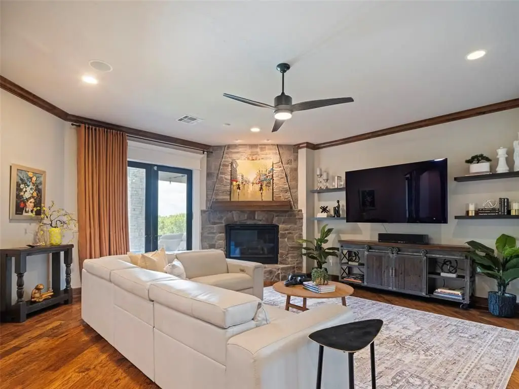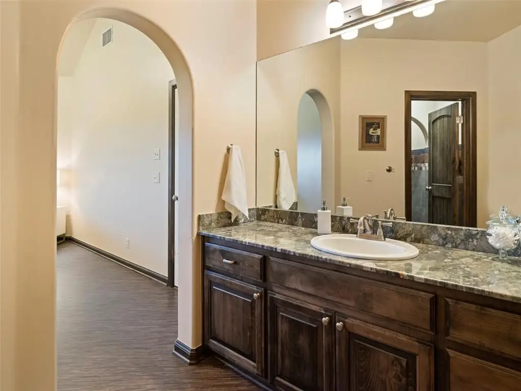 Nestled on a rare 77-acre corner lot in East Edmond's sought-after Creek Bend neighborhood this stunning Old English Tudor exudes timeless elegance and exceptional craftsmanship Mature landscaping and a stately presence set the tone for the grandeur within Upon entering the home you're welcomed into a dramatic foyer with soaring 20-foot ceilings and a sweeping custom iron staircase flanked by a richly appointed formal study and a refined dining room The study is a true showpiece wrapped in floor-to-ceiling stained woodwork and featuring a built-in desk bookshelves and a hidden door leading to a private desk area with discreet access to the primary suite The dining room is graced with custom wood moldings and a charming bay window overlooking the manicured front lawn The chef's kitchen is a dream for both everyday living and entertaining outfitted with double ovens a gas range a full-size Meile refrigerator and freezer and a built-in ice maker A Butler's pantry with custom cabinetry connects seamlessly to the formal dining space adding to the homes effortless flow The main living room with its warm stone fireplace and backyard views opens to a spacious game room complete with a bar and a private theater With a total of 6 living areas throughout there is space for everyone and every occasion The luxurious primary suite offers a serene retreat with treetop views dual vanities a makeup vanity jetted soaking tub oversized walk-in shower and an expansive walk-in closet Upstairs you'll find 3 generously sized bedrooms each with its own en suite bathroom and abundant walk-in closets The walkout basement adds even more versatility with its perfectly suited playroom with a built-in desk a workout room an additional bedroom with an en suite bath and provides access to an indoor sports court ideal for tennis pickleball or basketball This extraordinary home blends luxury functionality and entertainment in one impressive home