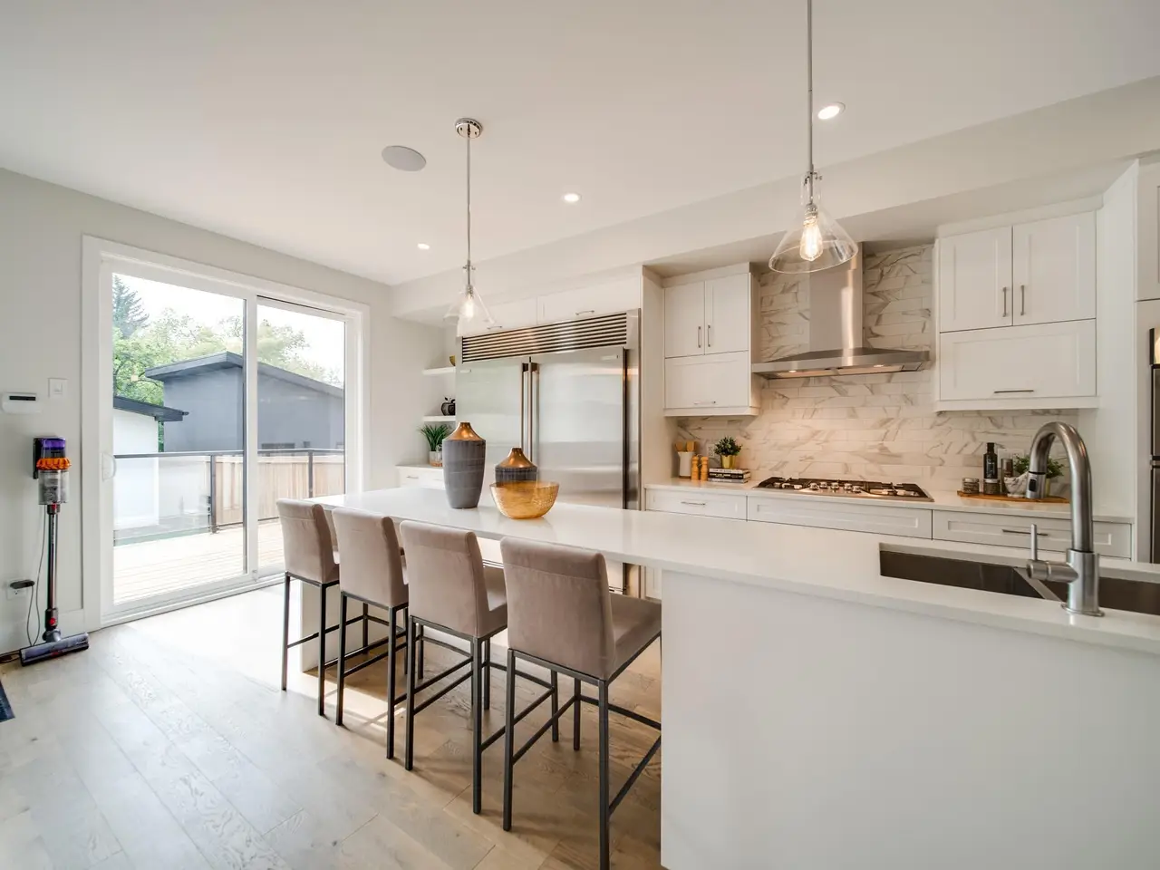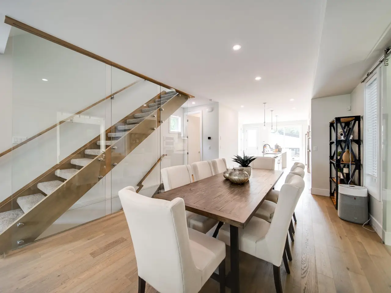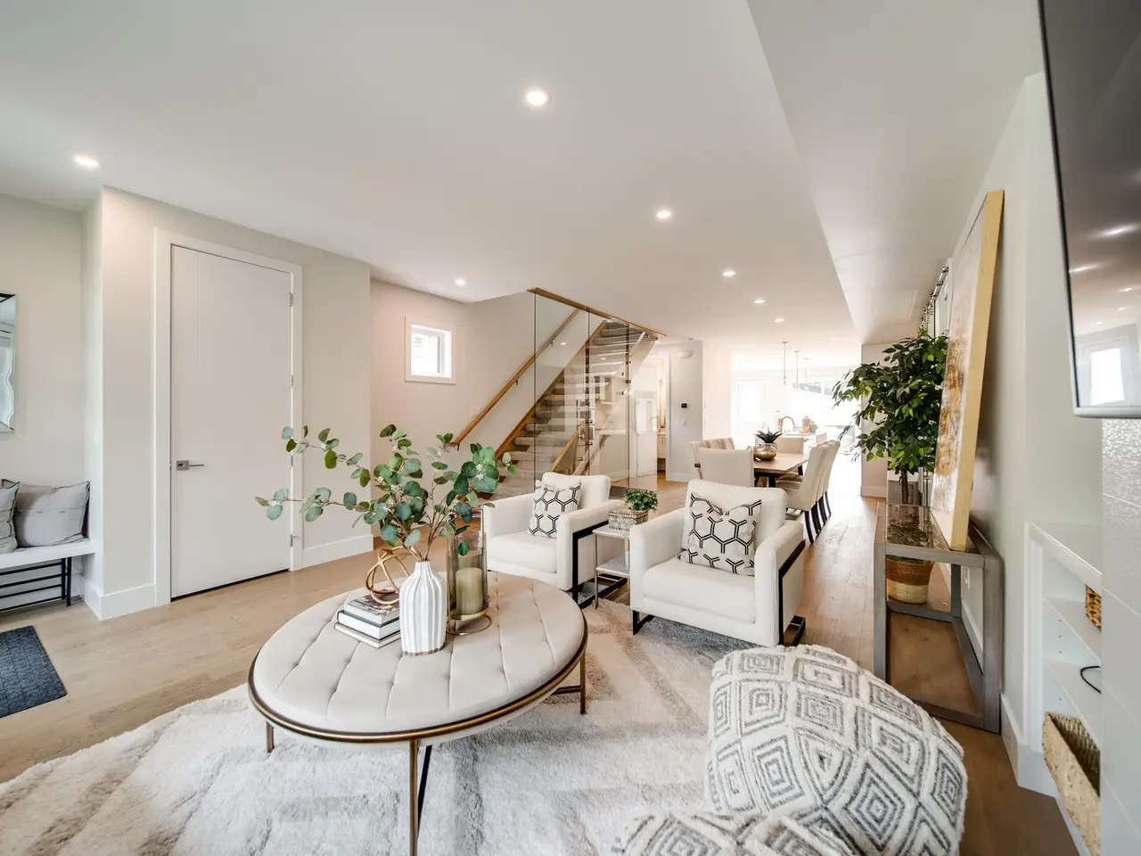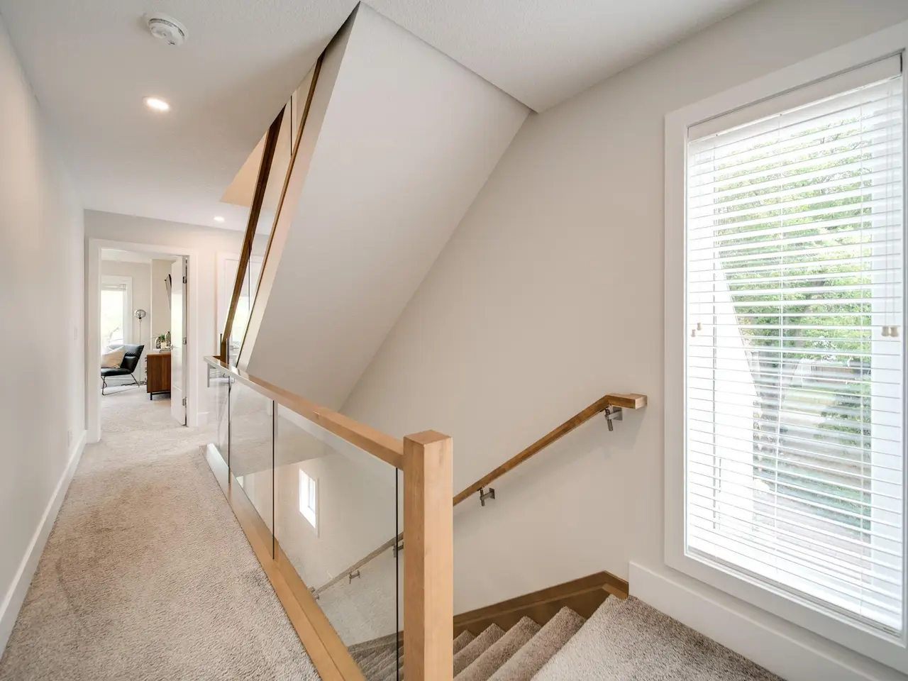 This 2,305 sq. ft. 2.5-storey stunner sits in Edmonton’s most coveted neighbourhood—GLENORA & features a total of 4 beds, 4 full baths & 2 half baths. Designed for modern living, it blends minimalism, comfort, & elegance with striking glass details throughout. The main floor showcases an open layout anchored by a 13-ft quartz island, complemented by a premium stainless steel appliance package. A floor-to-ceiling glass wine wall highlights the dining area, while an open-riser staircase encased in glass adds architectural flair. Upstairs, the primary retreat impresses with sliding glass barn doors leading to a spa-inspired ensuite with freestanding tub & custom shower. Two additional bedrooms, each with ensuites, plus handy same-level laundry complete this floor. The third level offers an urban lounge with seamless access to an indoor/outdoor rooftop patio boasting skyline views. Fully finished basement has rec area & 4th bed/bath. Built in sound + minutes from the River Valley, Ice District, and downtown.