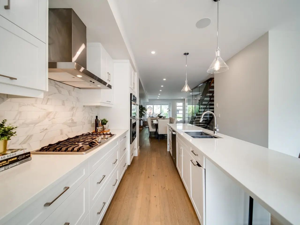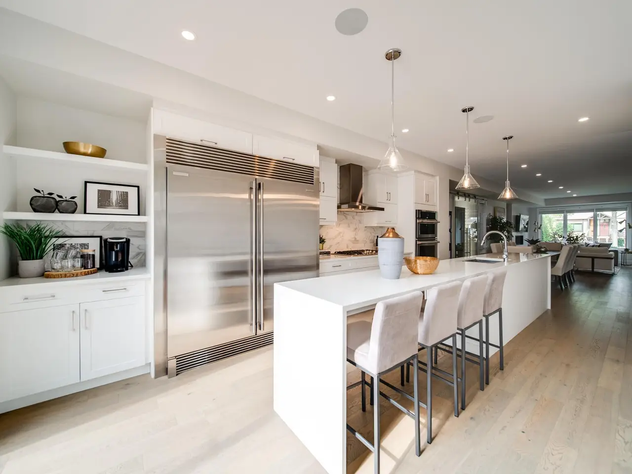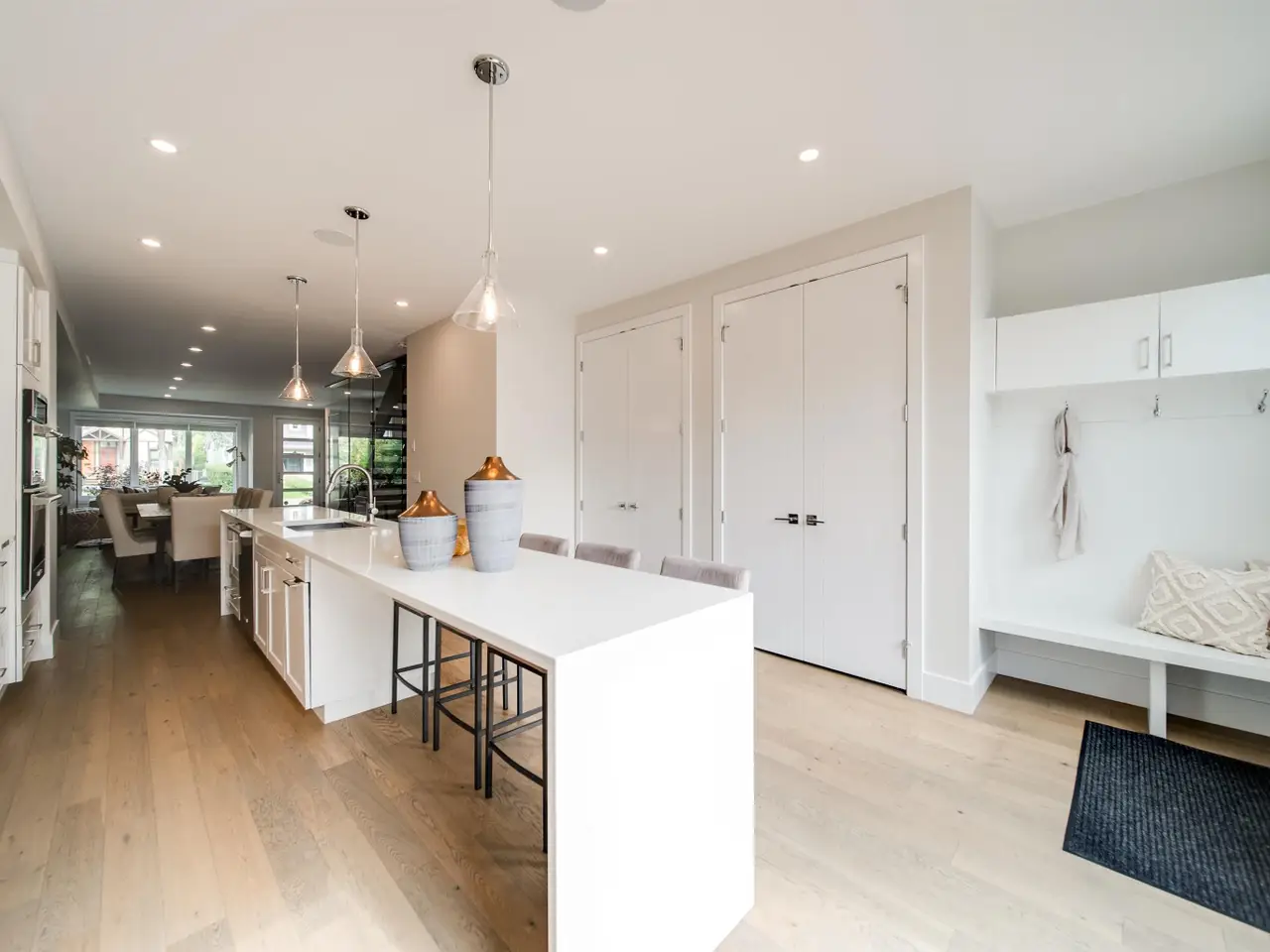 This 2,305 sq. ft. 2.5-storey stunner sits in Edmonton’s most coveted neighbourhood—GLENORA & features a total of 4 beds, 4 full baths & 2 half baths. Designed for modern living, it blends minimalism, comfort, & elegance with striking glass details throughout. The main floor showcases an open layout anchored by a 13-ft quartz island, complemented by a premium stainless steel appliance package. A floor-to-ceiling glass wine wall highlights the dining area, while an open-riser staircase encased in glass adds architectural flair. Upstairs, the primary retreat impresses with sliding glass barn doors leading to a spa-inspired ensuite with freestanding tub & custom shower. Two additional bedrooms, each with ensuites, plus handy same-level laundry complete this floor. The third level offers an urban lounge with seamless access to an indoor/outdoor rooftop patio boasting skyline views. Fully finished basement has rec area & 4th bed/bath. Built in sound + minutes from the River Valley, Ice District, and downtown.