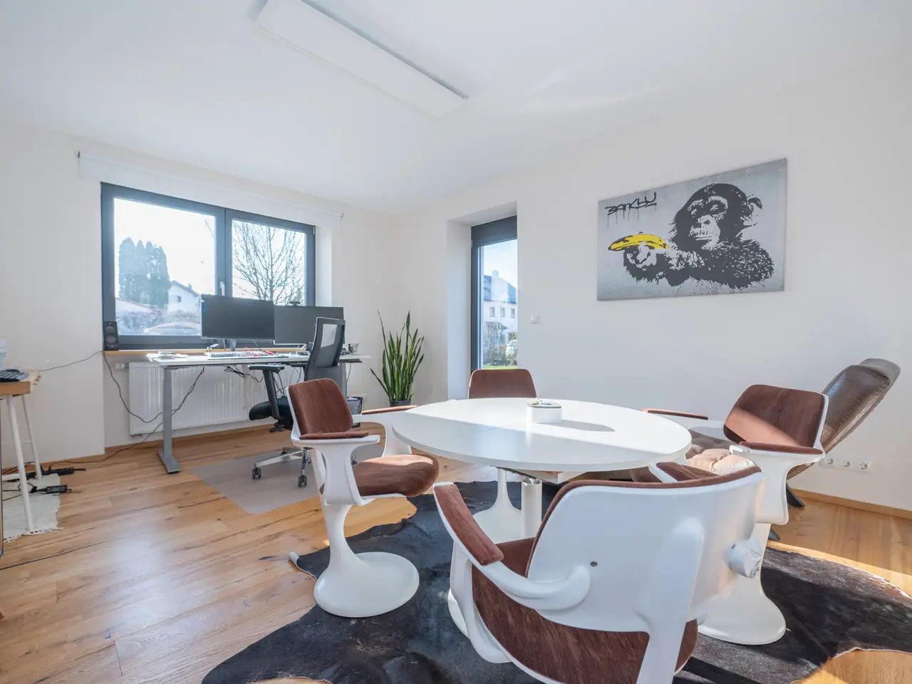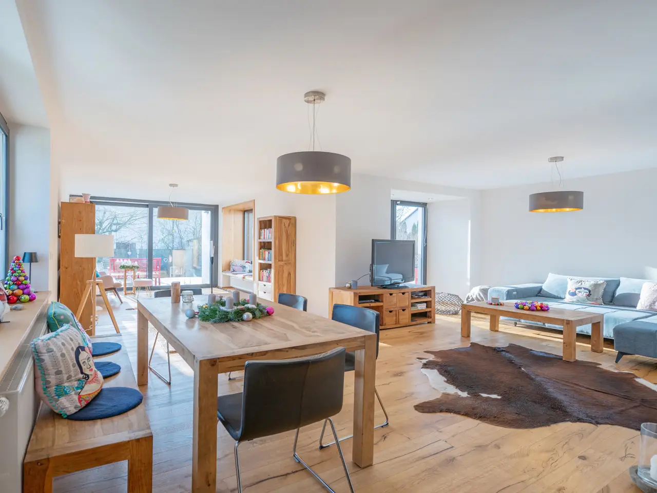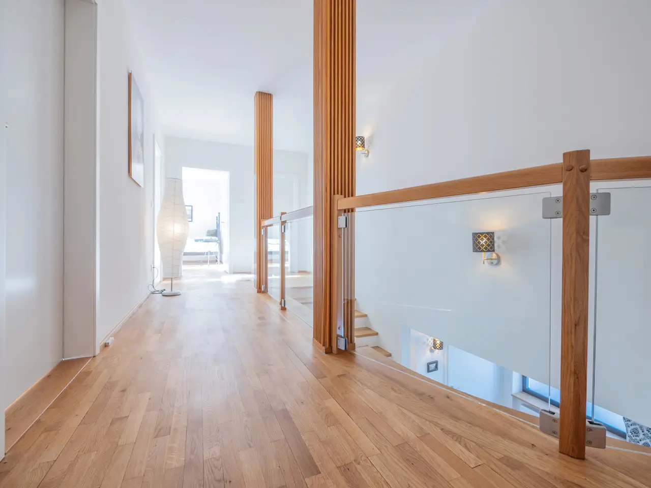 For sale is a high-quality renovated detached house with a spacious granny apartment that combines modern living with timeless elegance. The property, built in 1961, was extensively renovated in 2022 and is situated on a spacious plot of approx. 1209 m² in a sought-after and central location in Eggenfelden. With a living space of approx. 250 m², spread over a total of 9 rooms, the house offers plenty of space for a variety of uses. The first floor welcomes you with an inviting and representative foyer, which impresses with an open staircase in solid oak. The open-plan living and dining area of approx. 45 m² impresses with real oak parquet flooring and large window fronts that offer a generous view of the mature garden. From here, you can access the spacious terrace of around 100 m² with an outdoor fireplace. The terrace is planked with extra-thick larch wood and extends over the entire south and west side of the house. The modern fitted kitchen meets all requirements and is equipped with an induction stove, a Bora extractor fan, a dishwasher and a solid oak worktop. A guest WC completes the space available in the main living area on this level. On the upper floor, a gallery leads to the bedrooms. The master bedroom not only offers plenty of space on approx. 35 m², but also its own en-suite master bathroom with natural light, free-standing bathtub, separate floor-level shower area, double washbasin, WC and electric underfloor heating. Two further rooms, which are ideal as guest or children's rooms, as well as a separate dressing room and an additional shower room complete the upper floor. High-quality details such as refurbished solid oak parquet flooring and electrically operated skylights underline the high standard. The granny apartment on the first floor with separate entrance extends over approx. 70 m² and offers two rooms, a fitted kitchen and a bathroom with shower and electric underfloor heating. This unit is ideal as a practice, office or guest apartment. From here you also have access to the spacious garden, which offers numerous design options. The basement of the house, which has separate access, houses a wine cellar as well as several storage rooms. A carport with space for two cars and additional parking spaces in the driveway are available for vehicles. A modern balcony power plant on the carport supports the energy efficiency of the property, which is rounded off by a new pellet heating system and a decalcification system. This property combines modern living comfort with a well-thought-out room layout and high-quality fixtures and fittings. The central yet quiet location in Eggenfelden, just a 5-minute walk from the town square, offers an ideal combination of urban infrastructure and living close to nature. A viewing is essential to discover the full potential of this special home. Make an appointment today to see this unique offer for yourself.