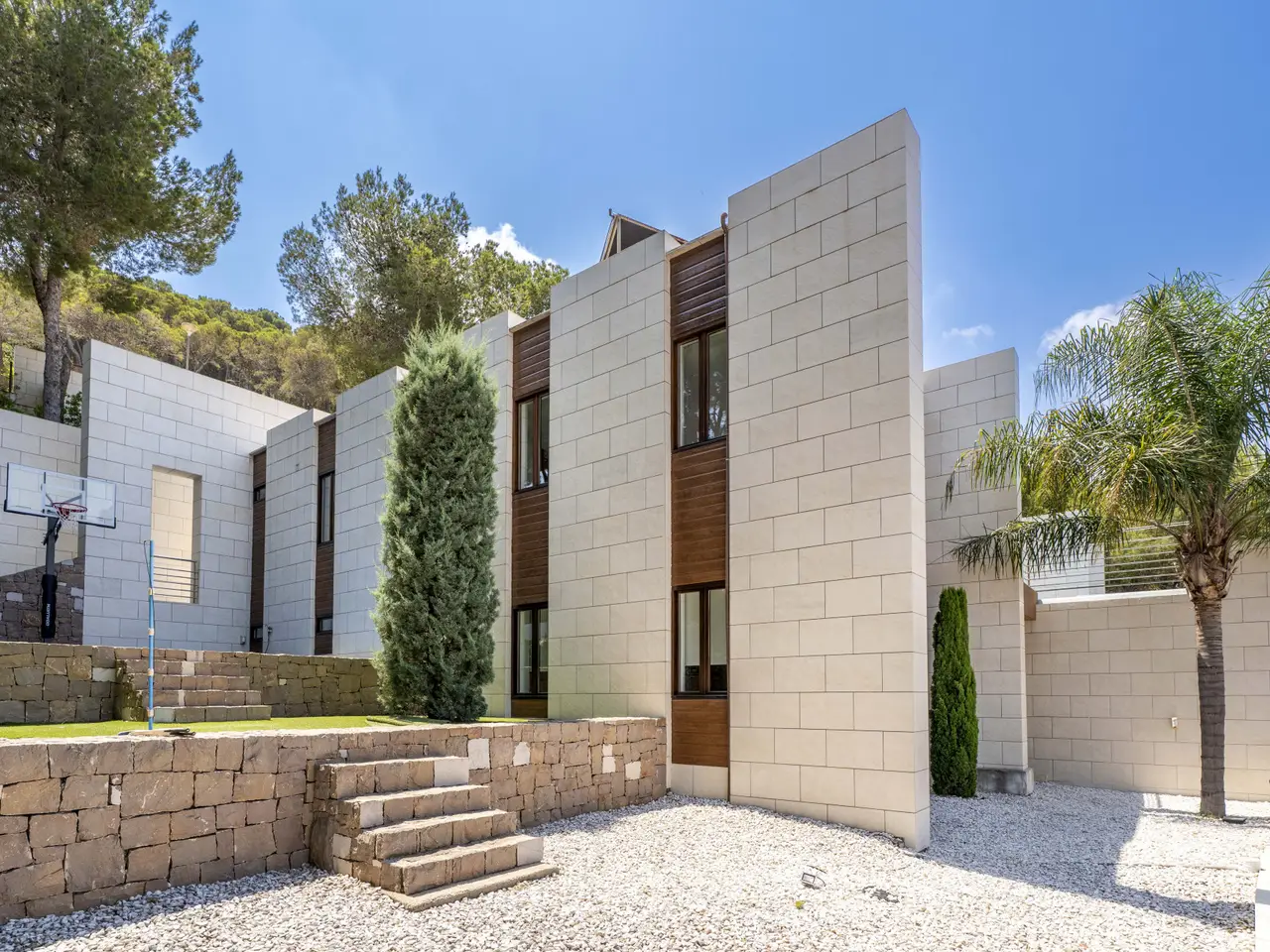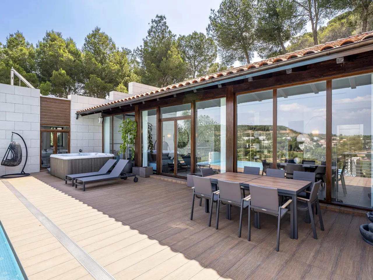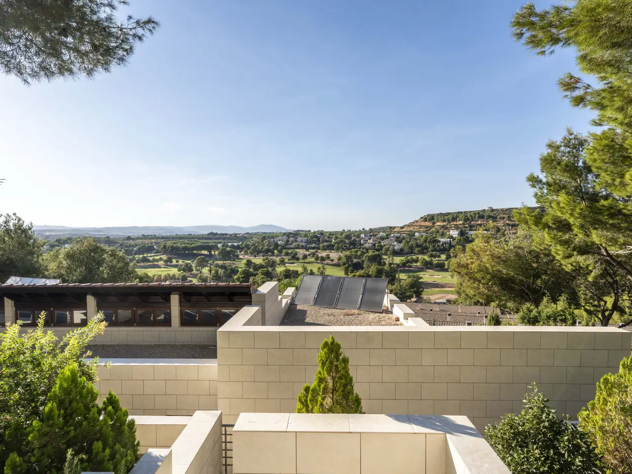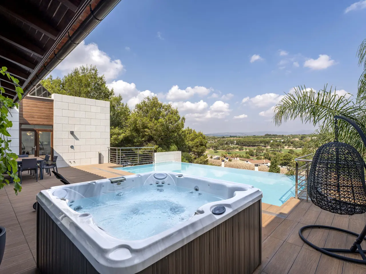 Located in the private urbanization El Bosque Golf, less than 25 kilometers from the city of Valencia, this modern villa offers a spacious and functional housing, within a natural environment with controlled access, 24-hour surveillance, golf course, social club and several catering services. The property is located on a plot of more than 1,300 m2 and has more than 550 m2 built. Distributed on two floors, it presents an efficient organization of spaces that facilitates a comfortable daily life. The main floor includes living room, dining room, kitchen, master bedroom and two other bedrooms. On the lower floor there are two additional bedrooms, a multipurpose room (cinema or games), service area, laundry room, machine room and storage spaces. The outdoor area, connected with the living room and the master bedroom, has a swimming pool with infinite edge, outdoor dining area and jacuzzi. From this area you can enjoy direct views of the golf course and the vegetation surrounding the house. The architectural design prioritizes natural light, cross ventilation and privacy. The property is located near an international school, supermarket, public transport and less than 15 kilometers from the airport. A luxury property for those looking for tranquility, proximity to Valencia and living next to a golf course.