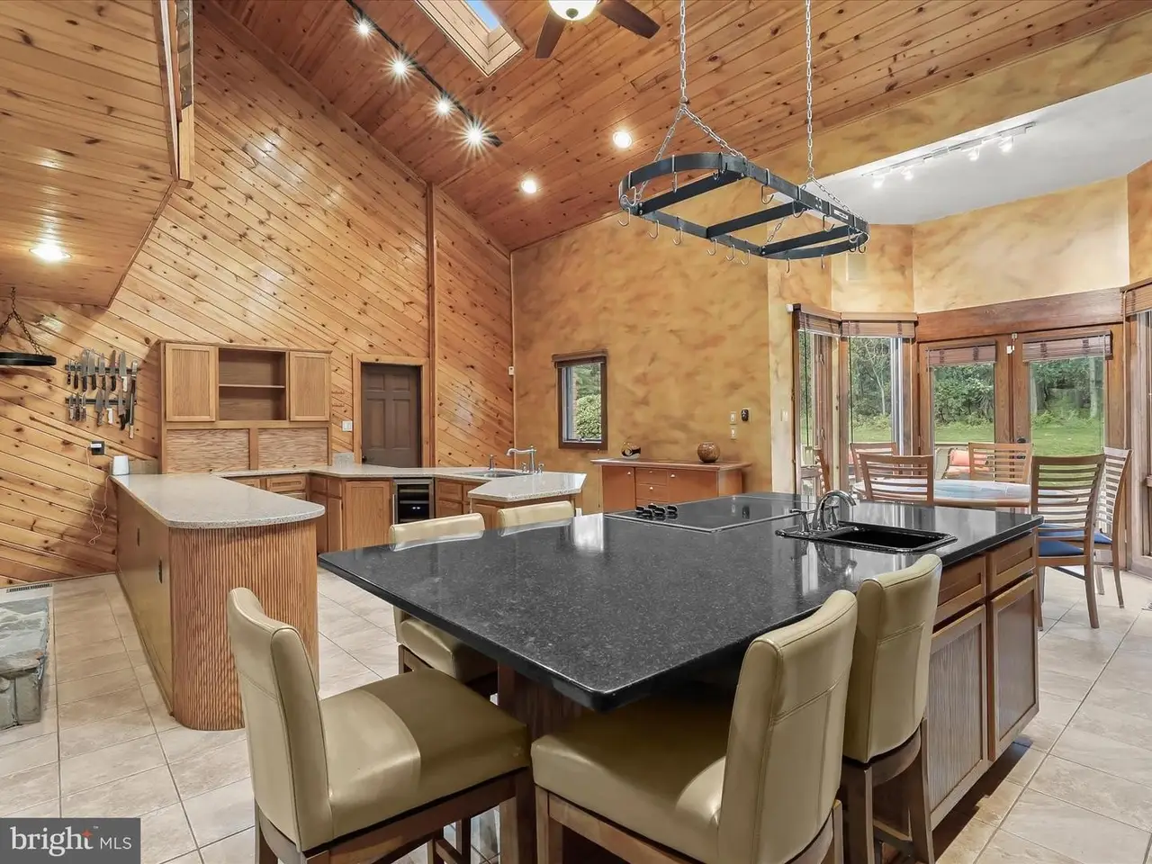 Welcome to your private retreat in one of the area's most sought-after communities! This one-of-a-kind custom home offers a truly unique living experience that will make you feel like you are on vacation every day. Featuring five bedrooms and three full bathrooms spread across four thoughtfully designed levels, this home provides generous space, flexibility, and privacy for every lifestyle. Nestled on over 4 acres of beautifully landscaped grounds that back to trees, the setting offers tranquility and seclusion while still being conveniently located near everything you need. From the moment you step inside, you are greeted by soaring vaulted ceilings with wood planks, skylights, and an abundance of natural light throughout. The main level features an impressive living room with a two-story stacked-stone wood-burning fireplace that is double-sided and shared with the kitchen, creating a warm, welcoming ambiance. A bar area off the living room is perfect for entertaining. The expansive kitchen is a chef's dream, fully equipped with stainless steel appliances, granite countertops, and a dining area with access to the deck overlooking the backyard and woods. Upstairs, the primary bedroom suite is a true escape, with a luxurious en-suite bathroom that includes a jetted tub and walk-in steam shower, along with a large walk-in closet and dressing vanity area. Three additional bedrooms and a second full bathroom complete the upper level. The lower level includes a spacious family room, a fifth bedroom, and a third full bathroom. A versatile bonus room on this level is ideal for an office, playroom, or even another bedroom. Downstairs, the basement provides even more flexibility with a recreation room and a large office with built-ins. Don't miss this rare opportunity to own a spectacular property that combines architectural distinction with a serene, resort-like atmosphere.