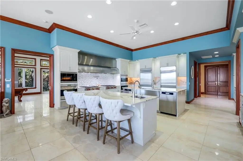 Set on nearly 3 private acres along Lemon Bay, this gated Mediterranean-inspired estate spans 12,789 sq. ft. of resort-style living with unmatched amenities on Florida's Gulf Coast, all within this private estate. Enter through grand gates and follow a sweeping driveway framed by mature oaks, tranquil ponds, waterfalls, and curated sculptures. The grounds include manicured lawns, a putting green, bocce and volleyball courts, and expansive outdoor recreation. A dramatic porte cochFre introduces a soaring two-story foyer with double glass doors, stained-glass transoms, and a glass elevator. Interiors showcase coffered and tray ceilings, stately columns, marble and travertine floors, extensive millwork, and eight fireplaces. The home offers six ensuite bedrooms, 9.5 total baths (primary bath has 3 bathroom sections but counted as 1 in the total), a library with wet bar, a media/family room with projector, fitness and meditation rooms, and rooftop terraces designed for sunset and Gulf views. The chefÆs kitchen features dual islands, Sub-Zero and Wolf appliances, wine fridge, ice maker, and walk-in pantry, flowing seamlessly into both formal and casual dining areas. The primary suite includes bay views from a private screened terrace, fireplace, sitting area, spa-like bath, and custom closets, while guest suites offer private balconies, walk-in closets, and baths. Outdoor living is highlighted by a 30+50 resurfaced saltwater pool and spa, full outdoor kitchen, shaded terraces, pool bath, and recreation courts. The property extends to a private dock with boat lift and deeded Gulf beach access. A tiled garage provides capacity for up to 30 vehicles, complete with 10 mini-split A/C systems and extensive storage, ideal for collectors or large-scale entertaining.