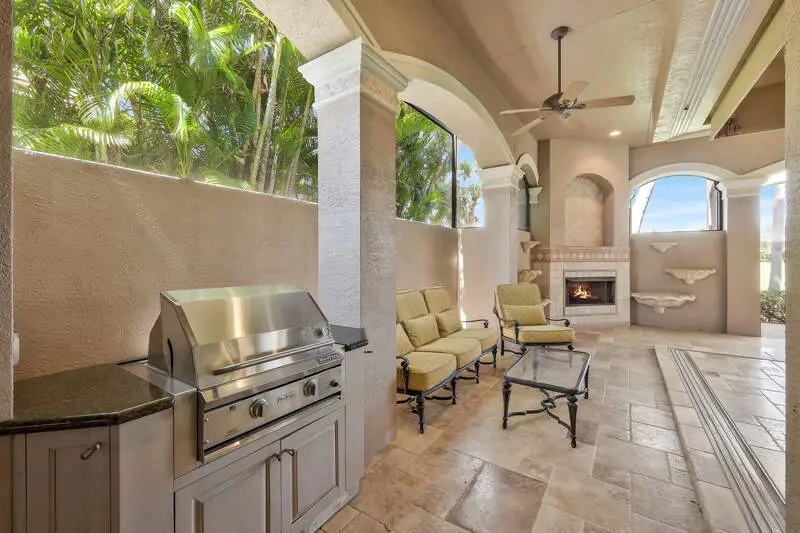 Outdoor kitchen with bar and fireplace