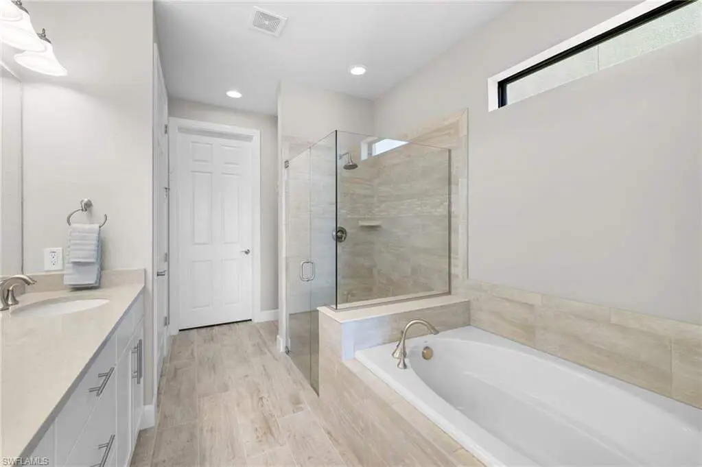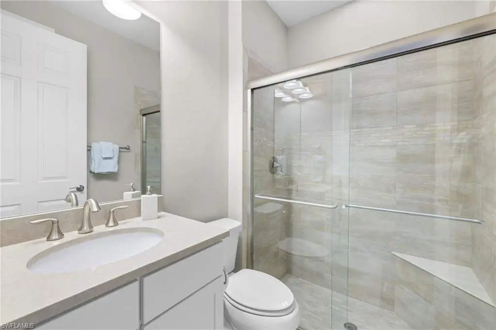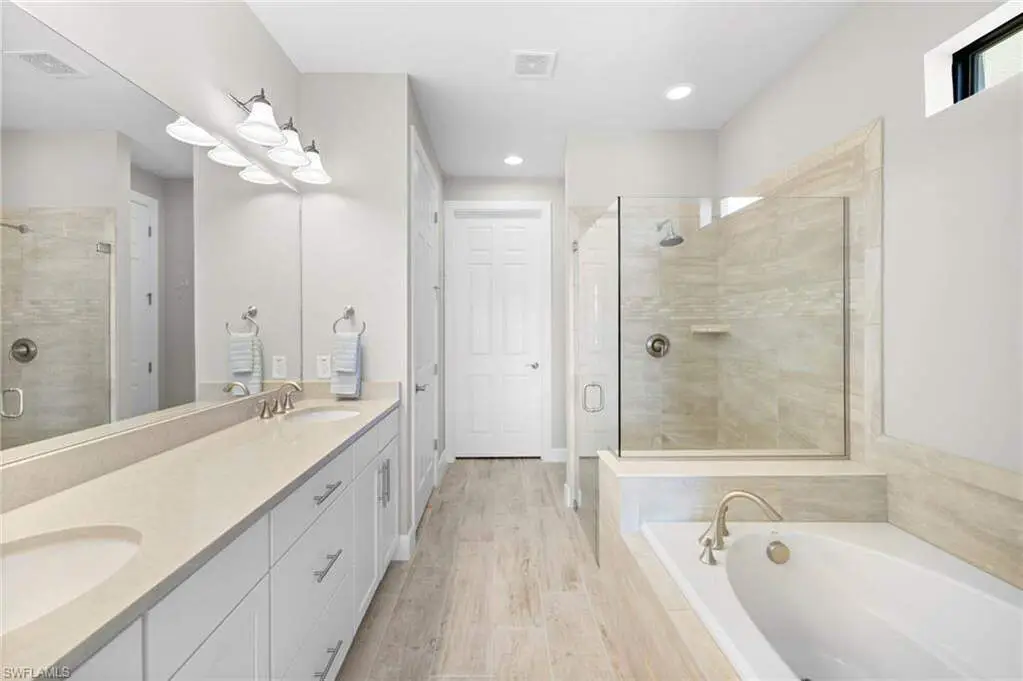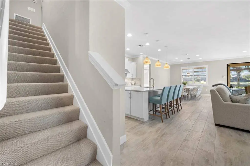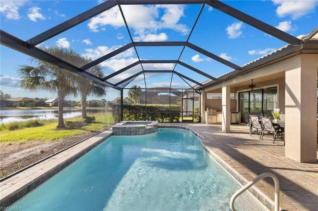 Experience resort-style living in the highly sought-after Corkscrew Shores community with this stunning home! This immaculate property boasts over 3,000 sq ft of light-filled living space, featuring 4 bedrooms, an office with French doors, and 3 full baths. The open floor plan highlights an attractive white kitchen with quartz countertops, a tumbled marble backsplash, and a large island perfect for entertaining. Enjoy seamless indoor-outdoor living with sliding glass doors leading to a covered lanai, outdoor kitchen, and screened-in heated pool with spa-all overlooking the sparkling lake and breathtaking SW sunset views. The second-floor flex room provides privacy for guests, while the owner's retreat offers serene water views, a spa-like ensuite bath, and a spacious walk-in closet. Additional upgrades include crown molding, wood-look tile floors, custom wood shelving, plantation shutters, and a surround sound system. Corkscrew Shores amenities include a zero-edge pool, on-site dining, tennis, pickleball, fitness center, and more-all with no CDD and no hurricane damage. Located close to FGCU, the airport, shopping, dining, and healthcare, this is your chance to enjoy Florida paradise!
