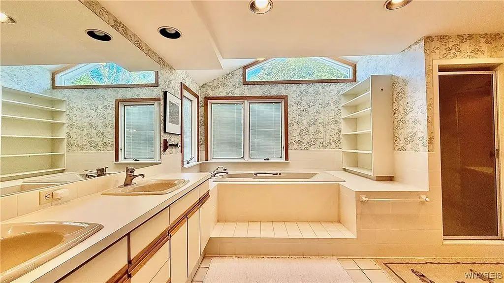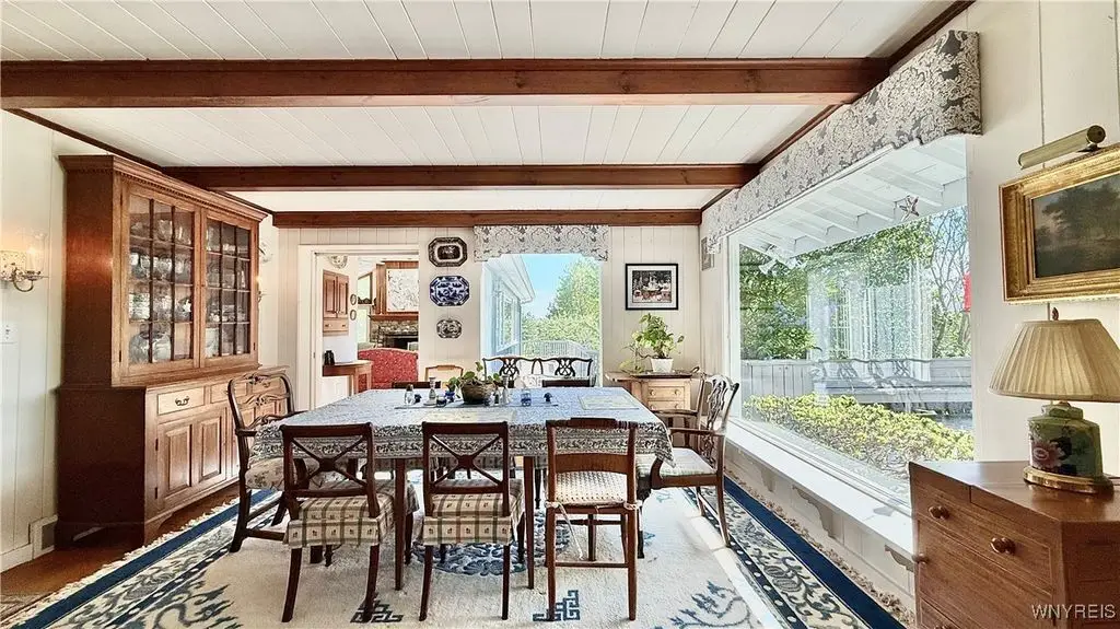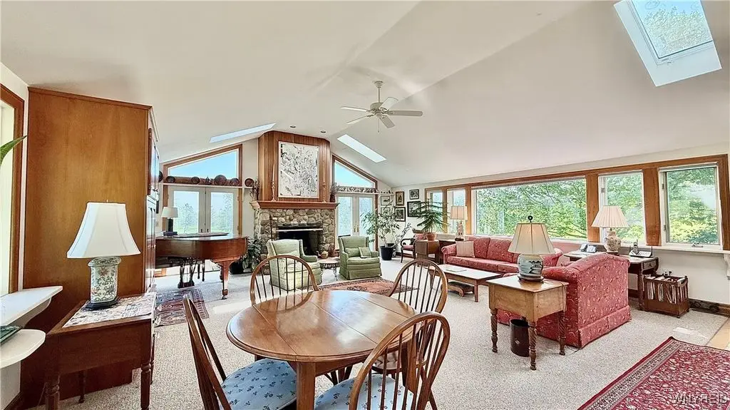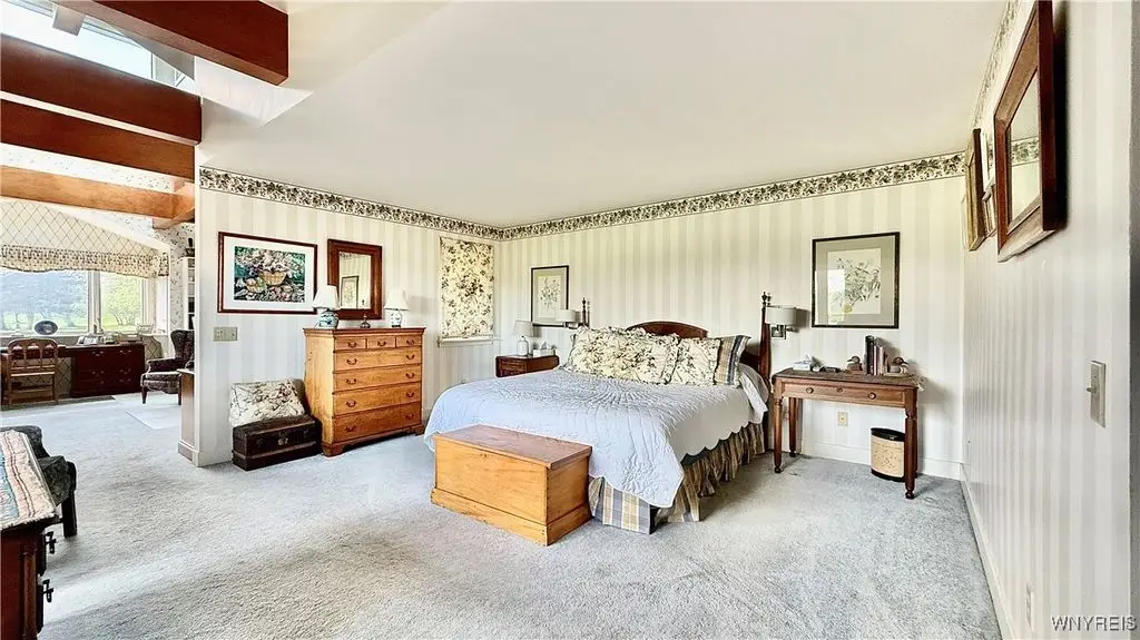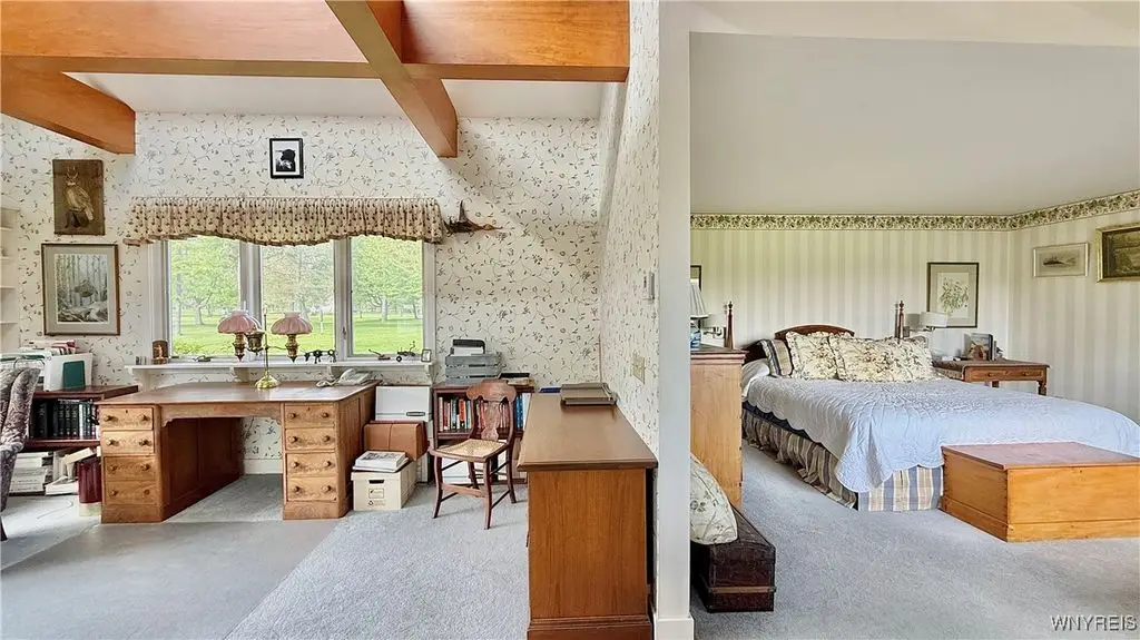 October House is a special property nestled near Lake Erie on 65.81 acres. The main house offers expansive living spaces that bring the outdoors inside. The home features a huge great room with soaring ceilings, a stone fireplace, and views to die for! The large kitchen has beautiful cherry cabinetry, complete with stainless steel appliances, and a breakfast nook which flows into a formal dining room with beamed ceilings, and wide plank oak flooring. The primary suite includes a huge bedroom with private bath, an attached sitting area, ample storage, and direct access to the pool. The main home also includes two additional living spaces with fireplaces, two large secondary bedrooms, two full baths, a half bath, small office, some flex space, two car garage and wine cellar. Outside, you can enjoy the views of nature from the decks, patio and pool. You will even find your own stocked pond, walking trails and a creek. This listing includes a total of four parcels (seller will NOT divide) with two homes (3200 SF main home and 2324 SF farmhouse), 2 large and 2 small barns/detached garage/studio loft apartment (totaling 6324 SF). Information provided includes all land and improvements.