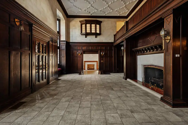 Two-story great hall with fireplace