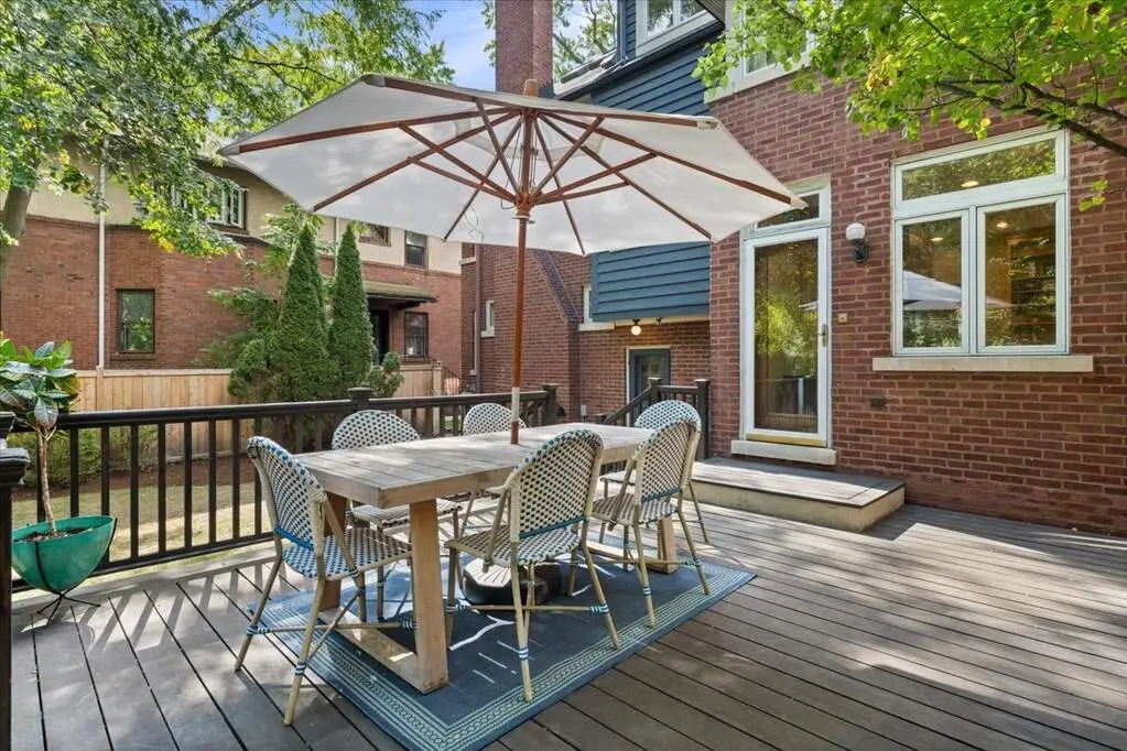 Located just one block from the lake in southeast Evanston's sought-after Lakeshore Historic District, this classic brick Colonial blends vintage character with everyday comfort. The home offers 5 bedrooms across the second and third floors, along with 3.5 bathrooms-including a spacious primary suite with a walk-in closet and private bath. Throughout the home, original features like leaded glass windows, hardwood floors, an oversized gas fireplace, and well-preserved vintage tile bathrooms add charm and warmth. The galley-style kitchen includes 42" maple cabinets and high-end appliances, with room to personalize or expand. The third floor includes two additional bedrooms plus a separate study or home office - ideal for remote work, creative space, or quiet retreat. A large deck off the back overlooks a deep, landscaped yard with mature trees-perfect for outdoor living. Just blocks from Main Street shops, restaurants, Metra, and CTA-this is a rare opportunity in one of Evanston's most walkable and scenic neighborhoods. City-approved, architectural plans are available to show how the home can be expanded or reimagined to suit modern needs, while maintaining its historic character.