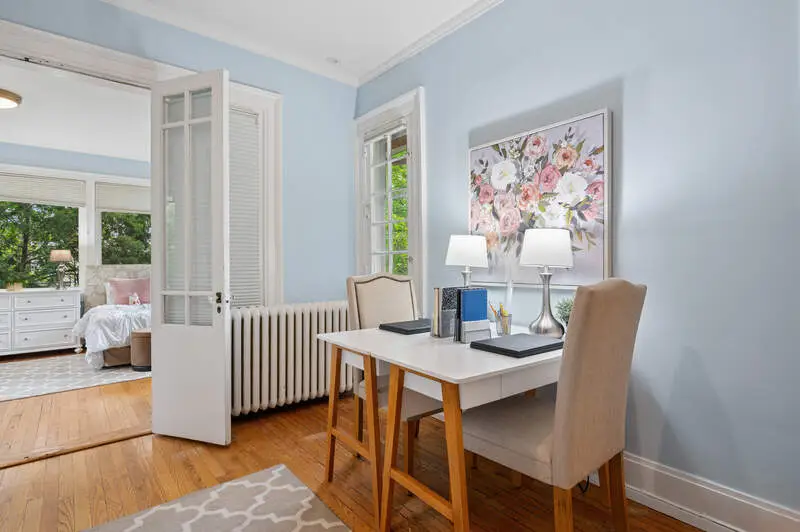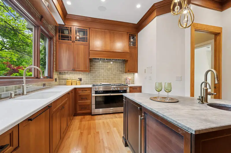 Don't miss this beauty! With 12' ceilings and beautiful original wood molding and hardwood floors throughout, this stunning home is move in ready. The layout of the house is such that rooms can be repurposed based on your lifestyle. The entry with its arched doorway steps leads up to a foyer with a stunning staircase. On one side you will find the immense living room complete with wood burning fireplace and windows on two sides. French doors flank the fireplace leading out to the sun porch. The dining room, which is large enough to hold a large dinner party, sits outside the homes pretty kitchen and flows into a generous sitting room - perfect for a casual conversation after dining. The three season sunroom is off the sitting area and overlooks a small courtyard. The kitchen overlooks the bluestone patio and has beautiful wood cabinetry and high-end appliances. Between the kitchen and garage is a fantastic mudroom convenient for unloading daily purchases. Upstairs you will be overwhelmed by the large and sunny primary bedroom complete with another wood burning fireplace, beautiful window line and walk in closet. The primary en suite bath features a separate shower and whirlpool bath and an additional custom closet. All three remaining bedrooms on the second floor have plenty of closet space and one includes a tandem sleeping porch. The third-floor family room is spacious with plenty of light and tree top views. Off the family room is a full kitchenette to save time from heading downstairs for refreshments and snacks. There is also an additional bedroom and full bath on this level. Outdoors enjoy the huge patio along with a large lawn bordered by gorgeous perennials and mature trees. Convenient parking with an attached two car garage and exterior parking spaces. Walk to downtown, the lake, trains, shops and restaurants. This home has everything one needs to call it their own!