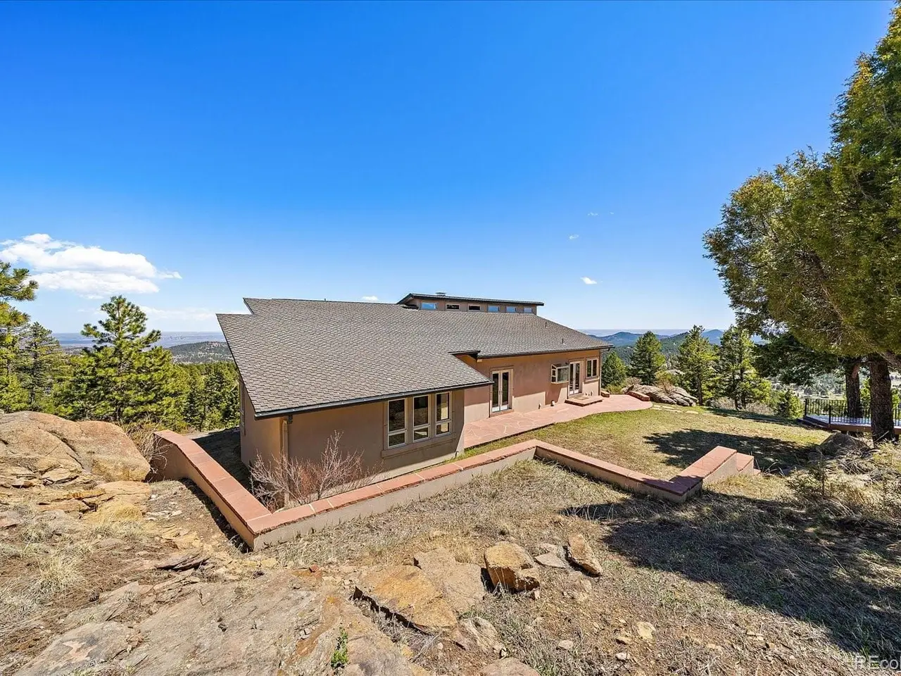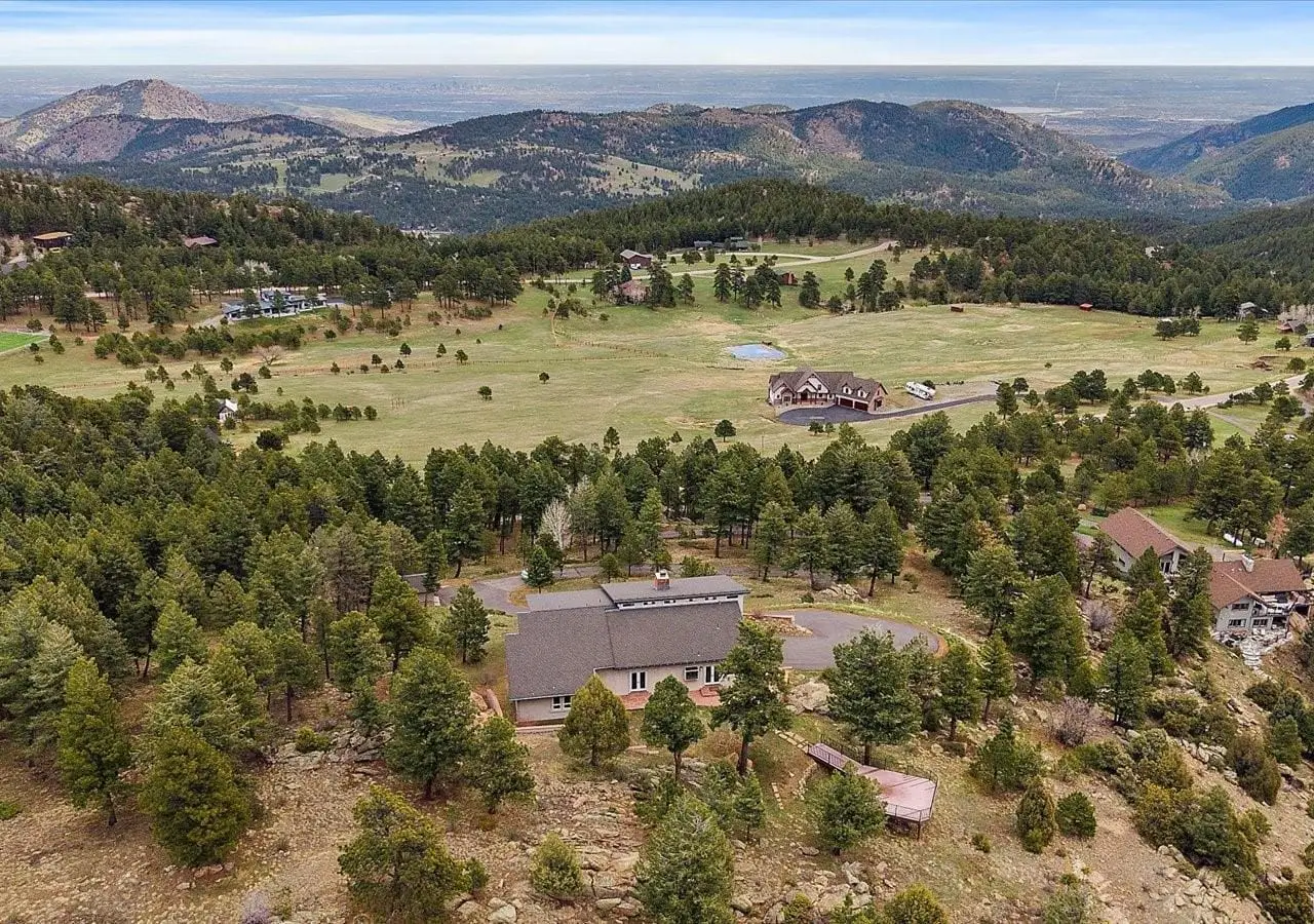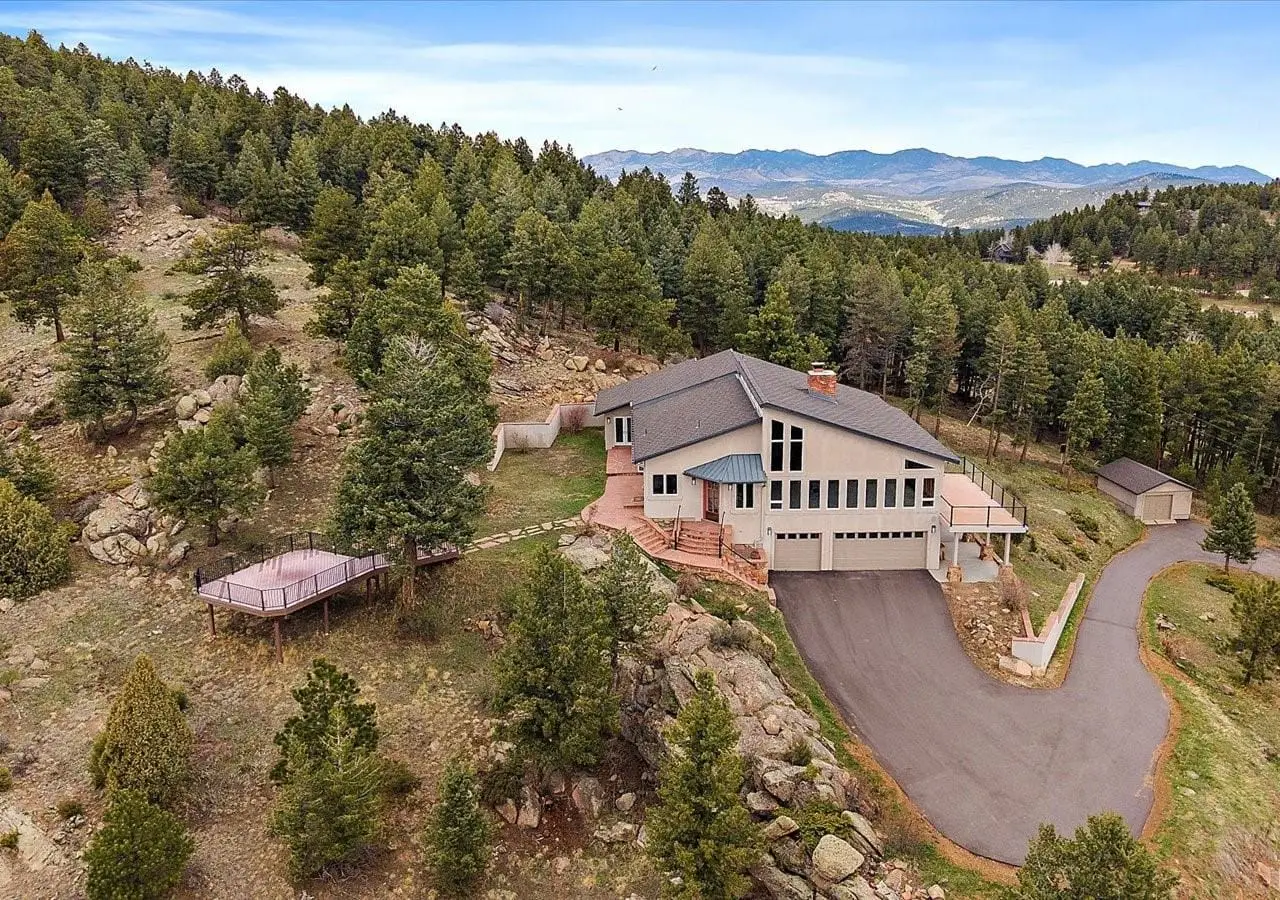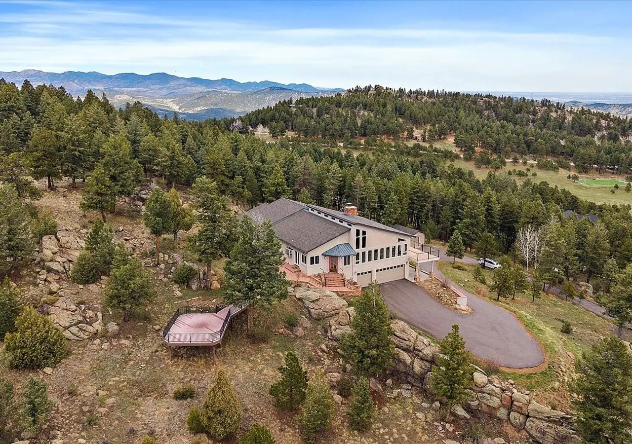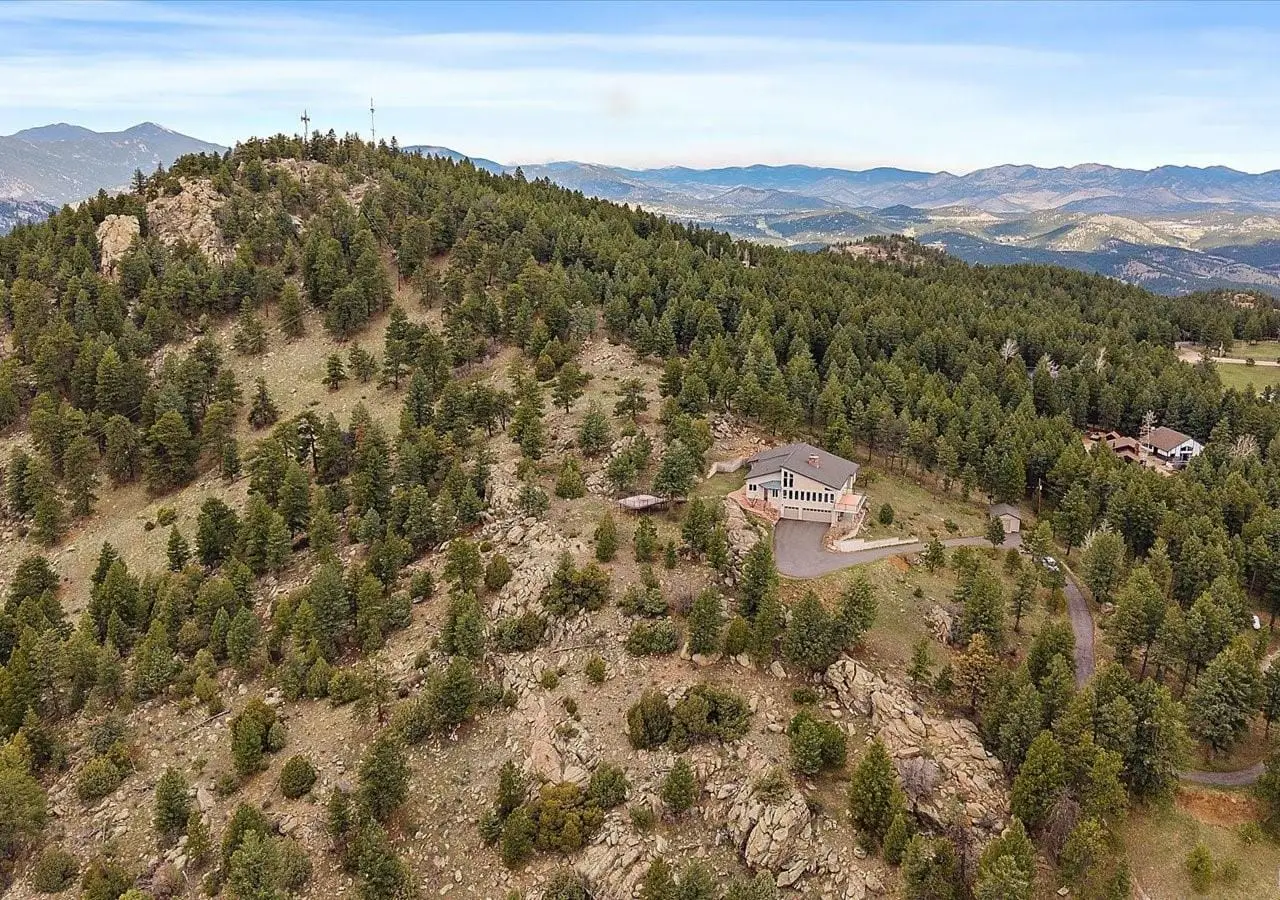 A true mountain-top experience! 5197 S. Bear Mountain Dr. is a luxurious 6-bedroom, 4-bathroom mountain retreat located in Evergreen. Perched in the trees atop an 11.32-acre lot, this property offers stunning 360-degree views of the Denver valley and the mountains to the west, including a clear view of Pikes Peak from the south side. The home features four bedrooms on the main floor, including a spacious walk-out primary bedroom with a beautiful en-suite five-piece bathroom. The basement includes two additional bedrooms and a bathroom, as well as a wet bar and built-in shelving, making it an ideal space for entertainment. Updated in 2015, this secluded mountain getaway features new carpet, fresh paint, and a remodeled kitchen and bathrooms. The in-floor electric heating system is more efficient than traditional electric baseboard heating, providing warmth during the winter months, along with excellent passive solar heat from the large windows that encase the main floor. The landscaping has been carefully designed to mitigate fire danger, with trees thinned around the home and rock gardens installed around the perimeter. The stucco exterior finish also enhances fire resistance. Additional features of the home include a security system, three 300-gallon water storage tanks, a new sewer line and septic tank installed in 2020, a 50-gallon water heater, and a new furnace installed in 2012.