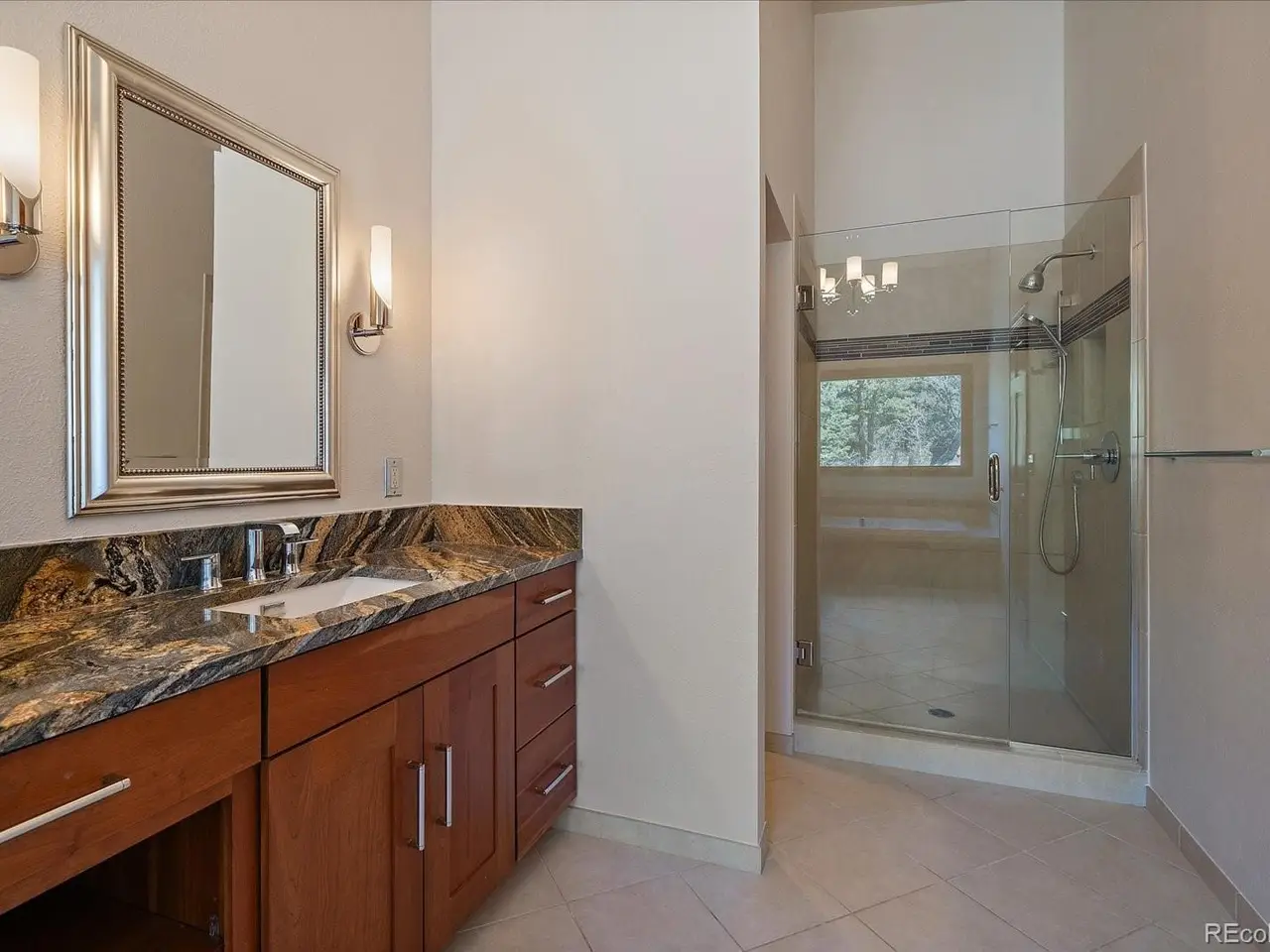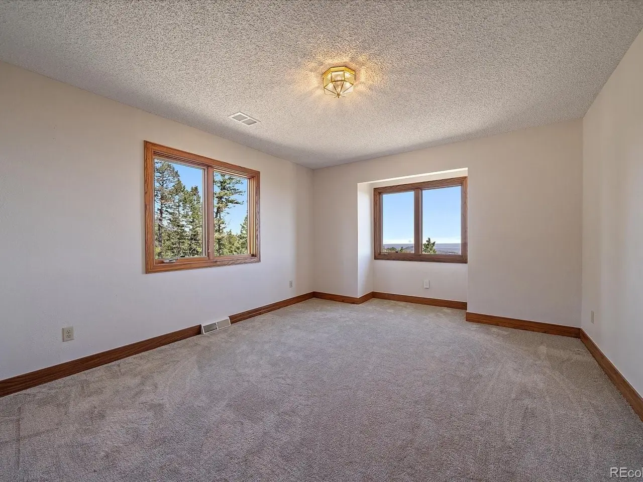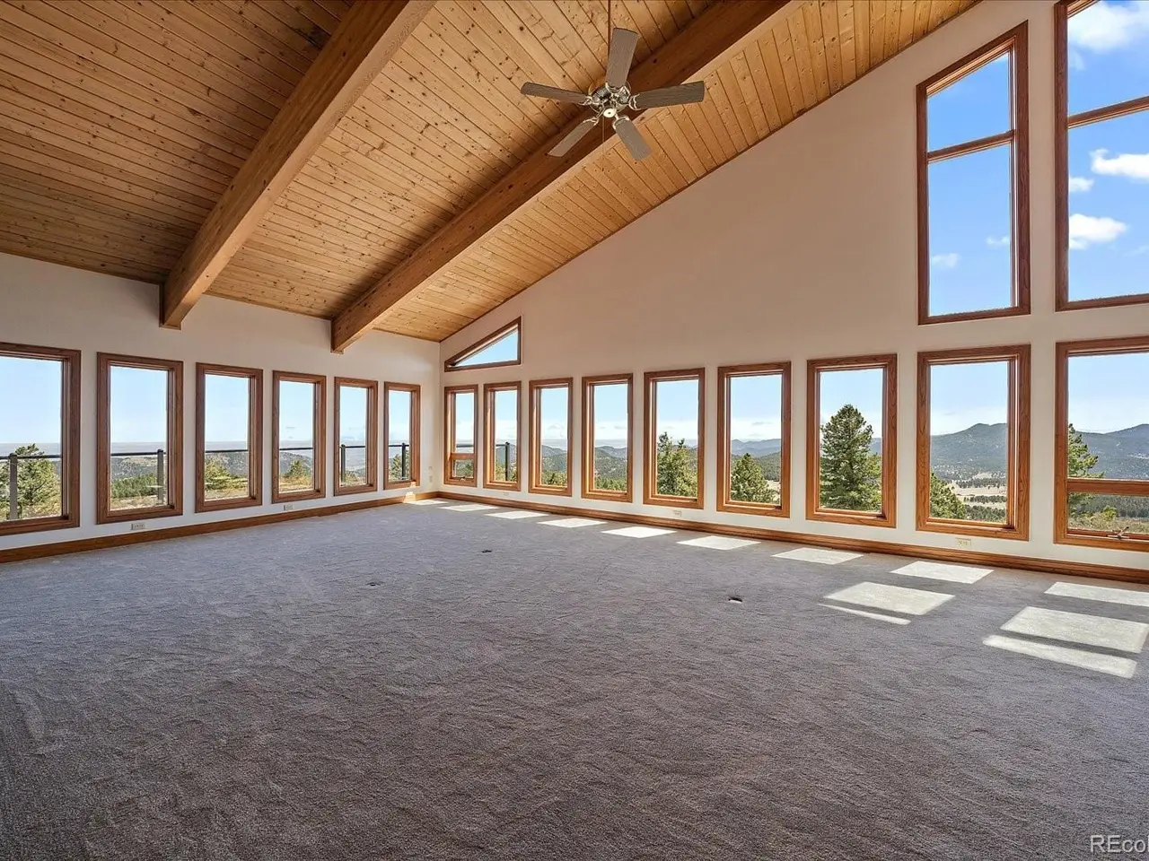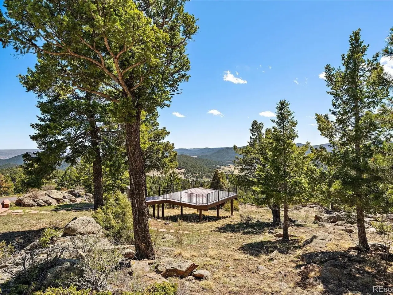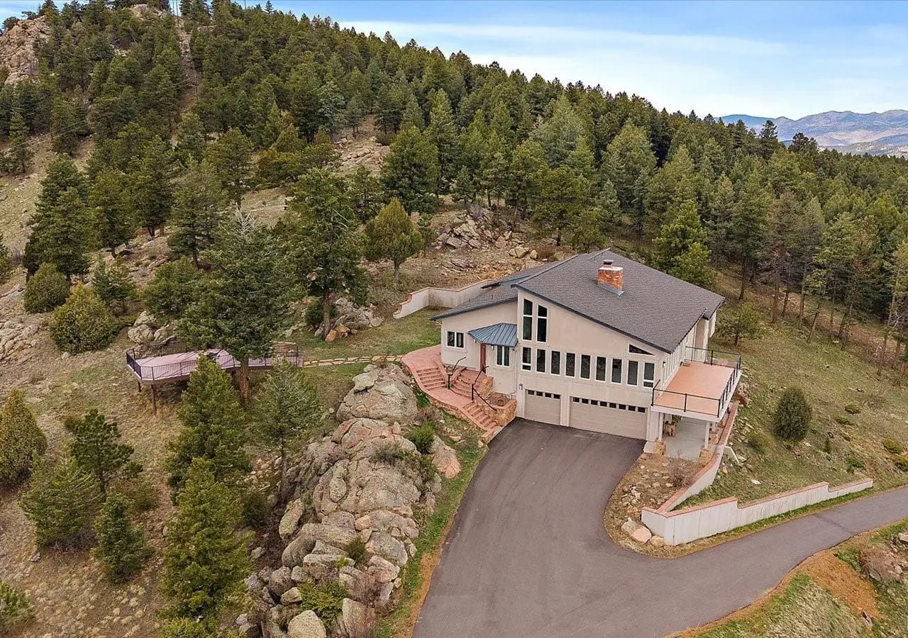 A true mountain-top experience! 5197 S. Bear Mountain Dr. is a luxurious 6-bedroom, 4-bathroom mountain retreat located in Evergreen. Perched in the trees atop an 11.32-acre lot, this property offers stunning 360-degree views of the Denver valley and the mountains to the west, including a clear view of Pikes Peak from the south side. The home features four bedrooms on the main floor, including a spacious walk-out primary bedroom with a beautiful en-suite five-piece bathroom. The basement includes two additional bedrooms and a bathroom, as well as a wet bar and built-in shelving, making it an ideal space for entertainment. Updated in 2015, this secluded mountain getaway features new carpet, fresh paint, and a remodeled kitchen and bathrooms. The in-floor electric heating system is more efficient than traditional electric baseboard heating, providing warmth during the winter months, along with excellent passive solar heat from the large windows that encase the main floor. The landscaping has been carefully designed to mitigate fire danger, with trees thinned around the home and rock gardens installed around the perimeter. The stucco exterior finish also enhances fire resistance. Additional features of the home include a security system, three 300-gallon water storage tanks, a new sewer line and septic tank installed in 2020, a 50-gallon water heater, and a new furnace installed in 2012.