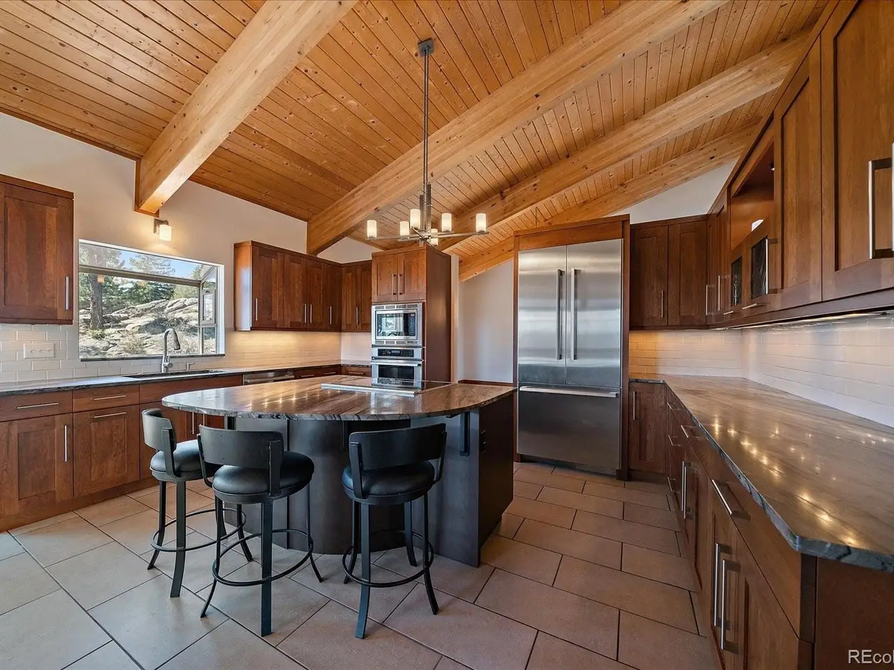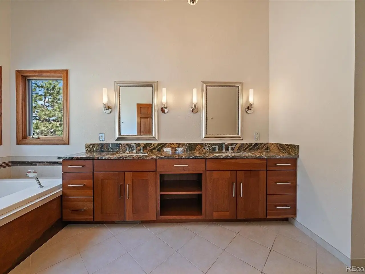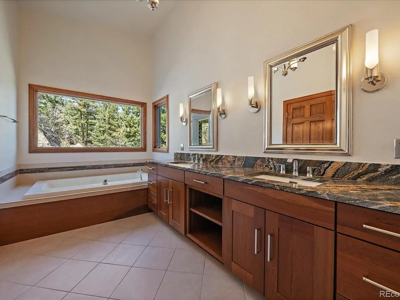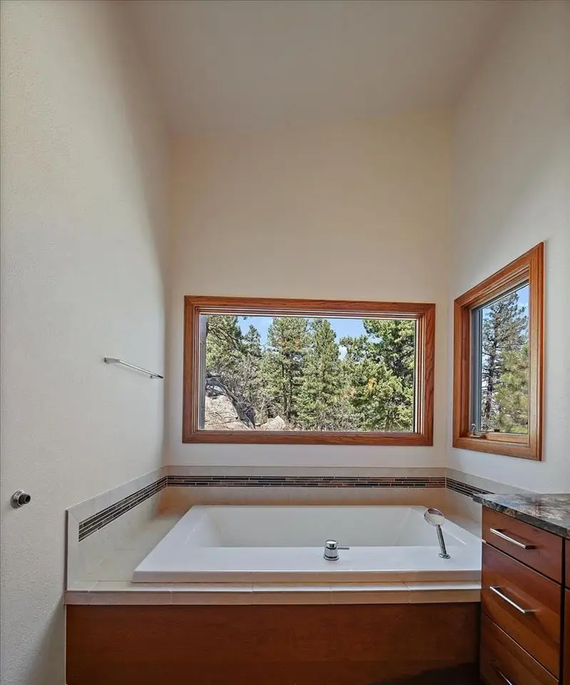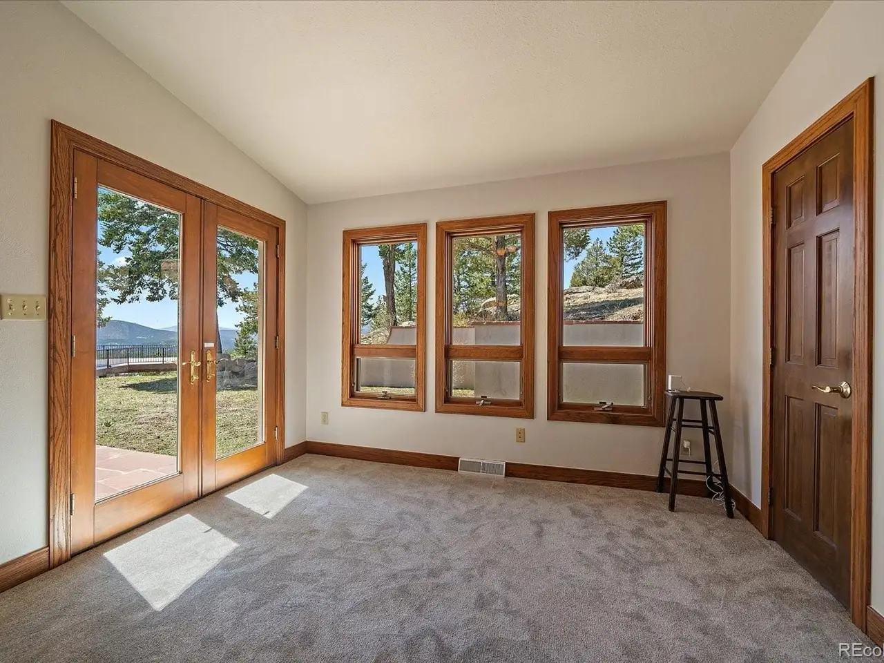 A true mountain-top experience! 5197 S. Bear Mountain Dr. is a luxurious 6-bedroom, 4-bathroom mountain retreat located in Evergreen. Perched in the trees atop an 11.32-acre lot, this property offers stunning 360-degree views of the Denver valley and the mountains to the west, including a clear view of Pikes Peak from the south side. The home features four bedrooms on the main floor, including a spacious walk-out primary bedroom with a beautiful en-suite five-piece bathroom. The basement includes two additional bedrooms and a bathroom, as well as a wet bar and built-in shelving, making it an ideal space for entertainment. Updated in 2015, this secluded mountain getaway features new carpet, fresh paint, and a remodeled kitchen and bathrooms. The in-floor electric heating system is more efficient than traditional electric baseboard heating, providing warmth during the winter months, along with excellent passive solar heat from the large windows that encase the main floor. The landscaping has been carefully designed to mitigate fire danger, with trees thinned around the home and rock gardens installed around the perimeter. The stucco exterior finish also enhances fire resistance. Additional features of the home include a security system, three 300-gallon water storage tanks, a new sewer line and septic tank installed in 2020, a 50-gallon water heater, and a new furnace installed in 2012.