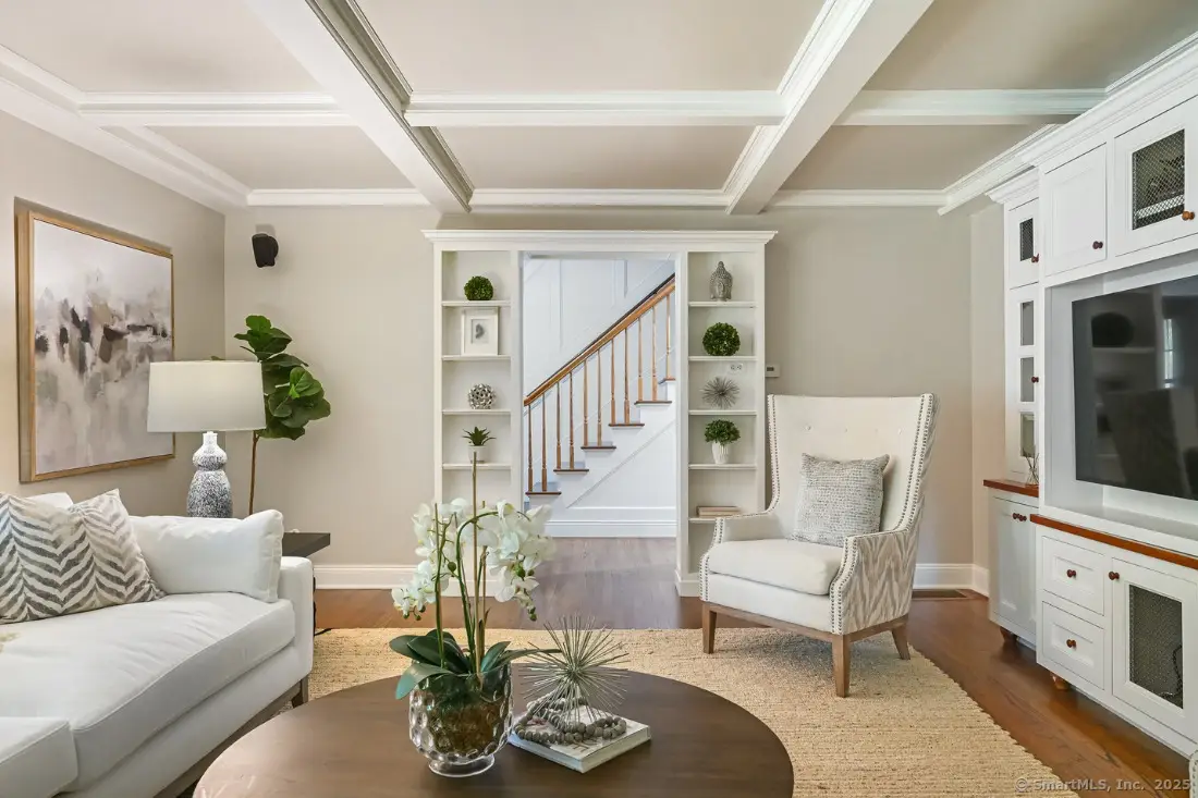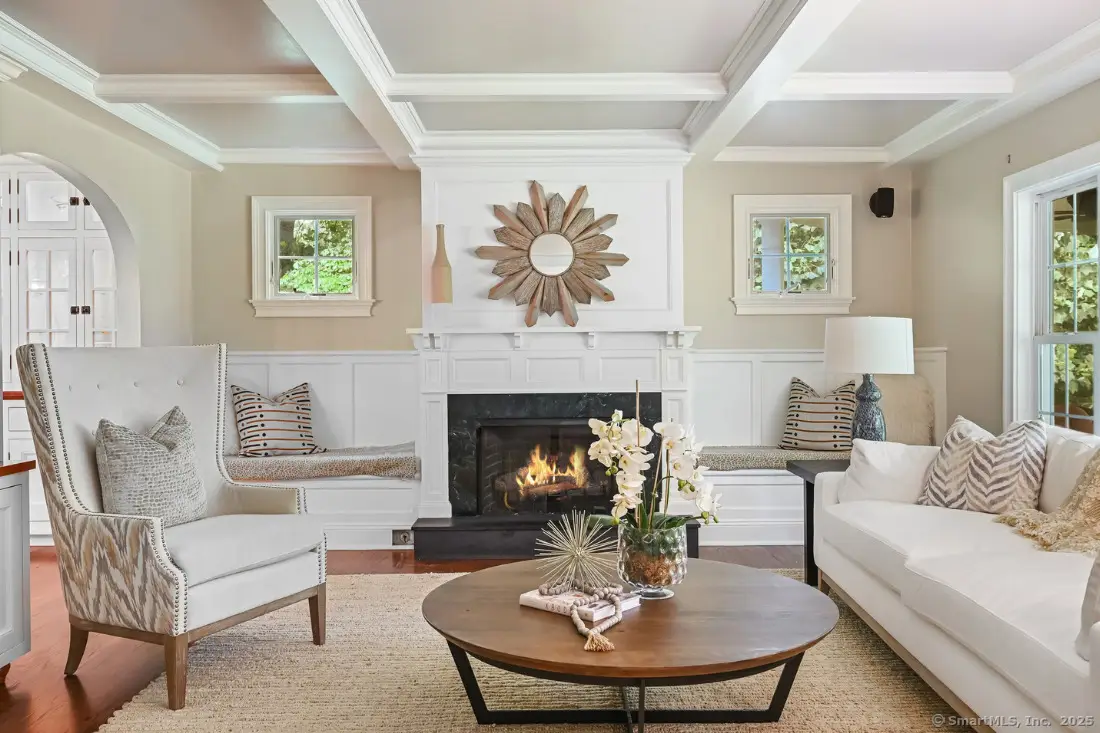 A gracious front porch welcomes you to this sophisticated colonial where comfort and luxury abound. The entry hall with striking floor to ceiling picture frame molding, setting the tone for the refined details found throughout the home. The family room greets you with many carefully curated features including book shelves framing the entry, coffered ceiling, gas fireplace flanked by built in window seats and an entertainment cabinet. The paneled den/library offers a cozy retreat with a wood burning fireplace, exposed beams, custom built ins and inset desk. Relax in the sunroom with barn door style trim and a wall of windows overlooking the private yard. The kitchen is a masterpiece with its bespoke cabinetry including a wall of glass front upper cabinets and walnut trim, curved island with walnut top, bar sink, and wine frig, granite countertops, high end appliances with pot filler at the cooktop, oil rubbed bronze hardware and built in desk area with walnut top, recessed cabinetry and framed bulletin board backsplash. The kitchen opens into the dining room featuring a tray ceiling, built in hutch and buffet, wall of windows, and french door leading to a stone patio and yard, as well as family and sun room providing great flow for entertaining. The primary suite features a cedar lined walk in closet, fireplace, balcony, a wall of custom built ins with vanity and mirror, and two wardrobes and a sitting area with vaulted ceiling and sliders to a covered balcony. (see addendum) The primary bath features travertine tile flooring, corner seat, floor to ceiling subway tile and glass enclosure in the shower, hand crafted vanity with inset doors and granite top. A built in linen closet with pull out hamper, shelving and oil rubbed bronze plumbing fixtures complete the picture. There are 5 additional second floor bedrooms all with hardwood floors two with built in cabinetry and desks, two full baths and a bonus wing to the left of the stairs. This area would make a great in law, au pair, guest or office suite. Currently used as an exercise room it features hardwood flooring, oversized windows overlooking the front yard, vaulted ceiling, ceiling fan a wall of built in cabinetry and a bedroom. The lower level accessed through hidden door, consists of a pub room with hand made bar and wall cabinet with mirror and open shelving, picture frame wall molding, ceiling beams, stucco walls and wide board reclaimed wood floor from a Vermont barn, a wine tasting room also with stucco walls and custom made shelving and bluestone flooring. The home theater has seating for six, picture frame and sound proofing walls, wide movie screen with projector and luxury vinyl plank flooring All lower level furniture and movie equipment are included in the sale. There is a oversized side loading garage with built in shelving and the second door to the lower level and door leading to a generous mudroom with six built in cubbies, hanging area with hooks, drawers and centered window seat with two long casement windows, a glass door leading to the side yard and driveway and a glass door to the sunroom. The level rear yard with a beautiful bluestone patio, sitting wall and barn with electric service is the perfect place for leisure activities. The peaceful retreat offered by scenic Greenfield Hill while being minutes from School, Merritt Parkway and Black Rock dining and shopping experiences make for the perfect house in the perfect location, Welcome home.