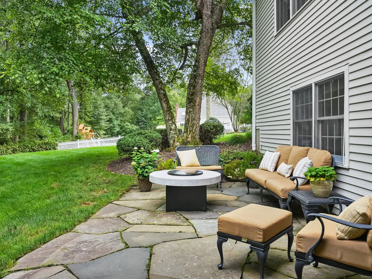 Welcome to this beautifully updated 4+ bedroom Colonial in a sought-after Greenfield Hill neighborhood, surrounded by rolling lawns and tree-lined streets. Offering over 3,000 sq. ft. of elegant living space plus 1,000+ sq. ft. in the spacious finished walk-out lower level, this home provides exceptional versatility and comfort. The grand entryway opens to a formal living and dining room with custom built-ins. The inviting family room, with vaulted ceilings and a natural stone fireplace, flows seamlessly into the impeccably updated eat-in kitchen. From here, sliding doors lead to an expansive Trex deck with a built-in gas grill, perfect for indoor/outdoor entertaining against the backdrop of a serene, private wooded yard. A mudroom, laundry area, and powder room complete the first floor. Upstairs, the tranquil primary suite features a walk-in closet and a spa-like bath with soaking tub, stall shower, and double vanity. Three additional bedrooms and a full bath complete the second level. The finished lower level includes a bedroom/office/potential au pair suite with full bath, ample storage, and walk-out access. Notable upgrades include fresh interior and exterior paint (2025), new roof (2024), remodeled kitchen and primary bath (2023), refinished hardwood floors (2023), and driveway sealing (2023). Meticulously maintained mechanicals and thoughtful updates make this home truly move-in ready.