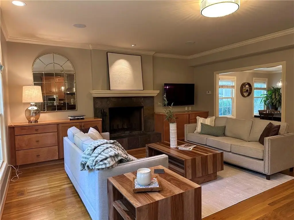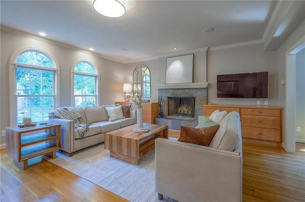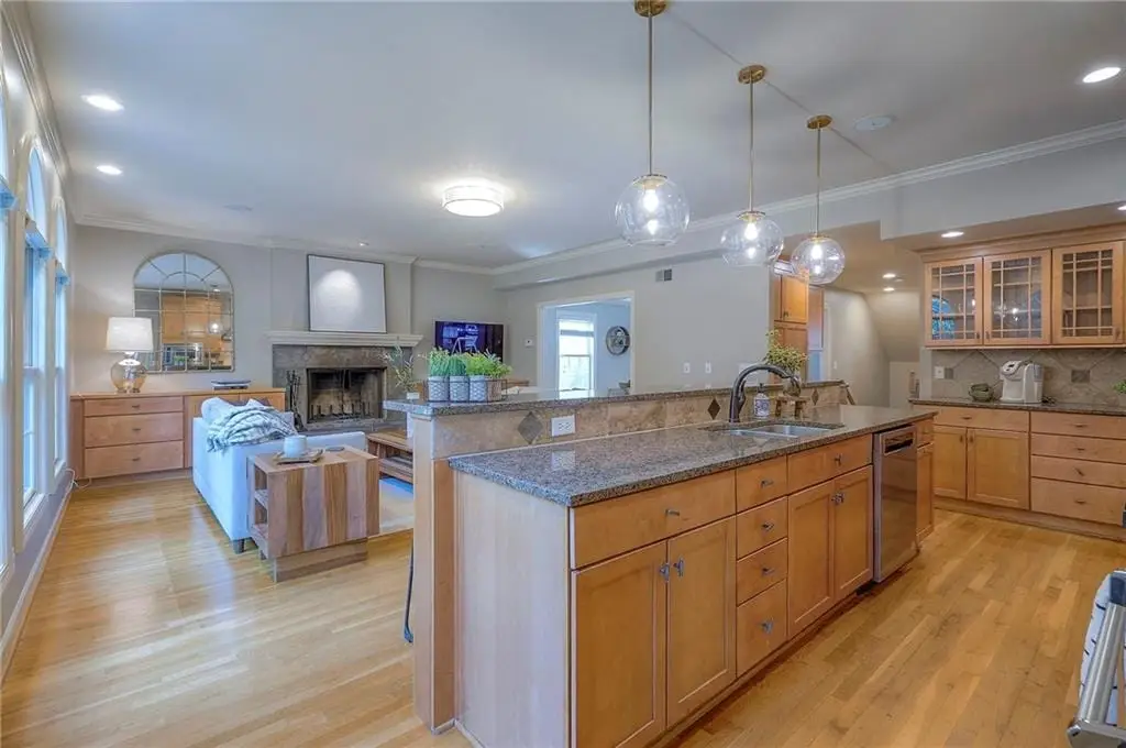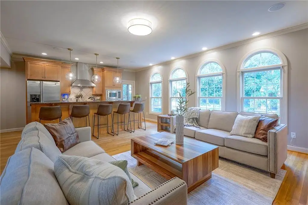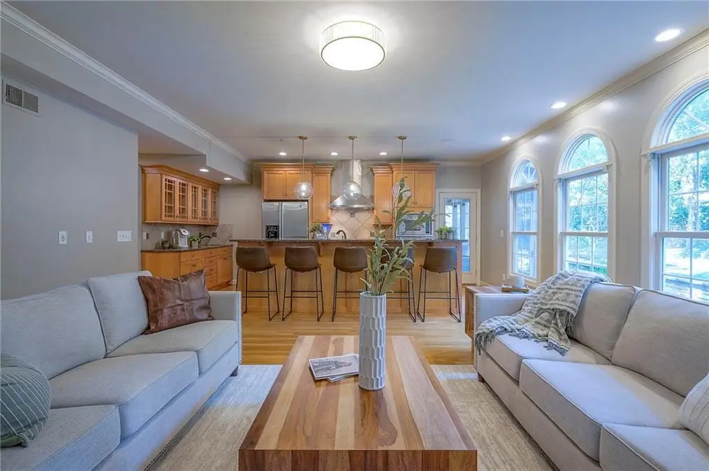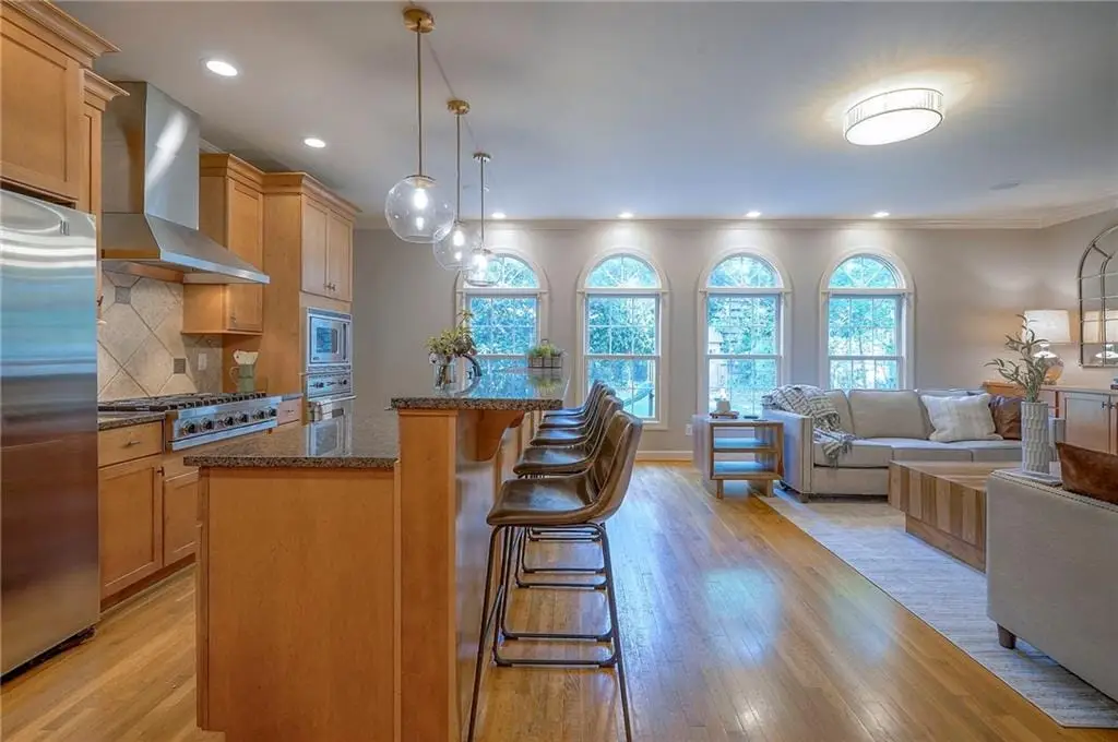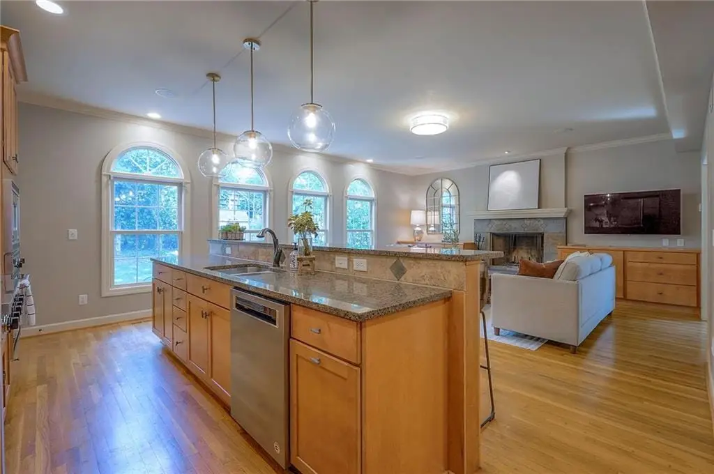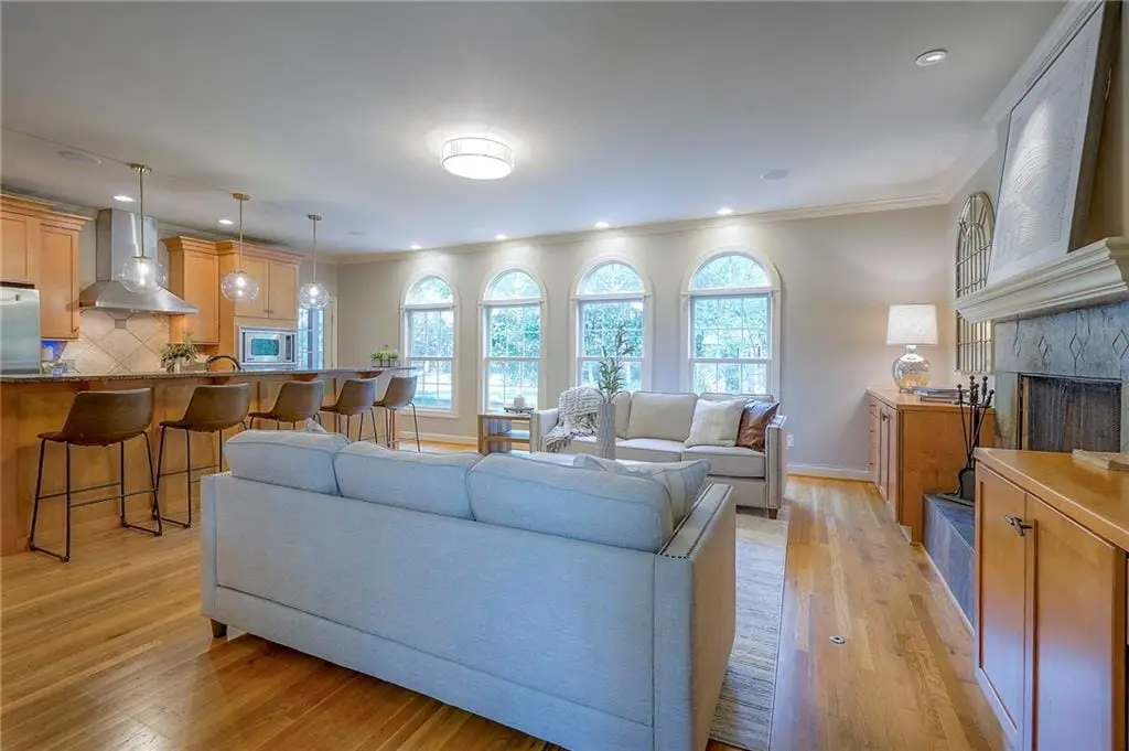 Sunlit hearth room overlooking landscaped backyard