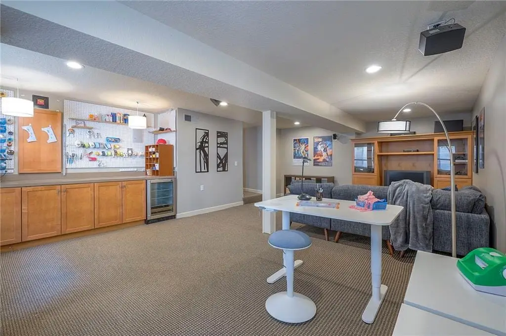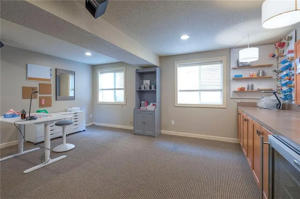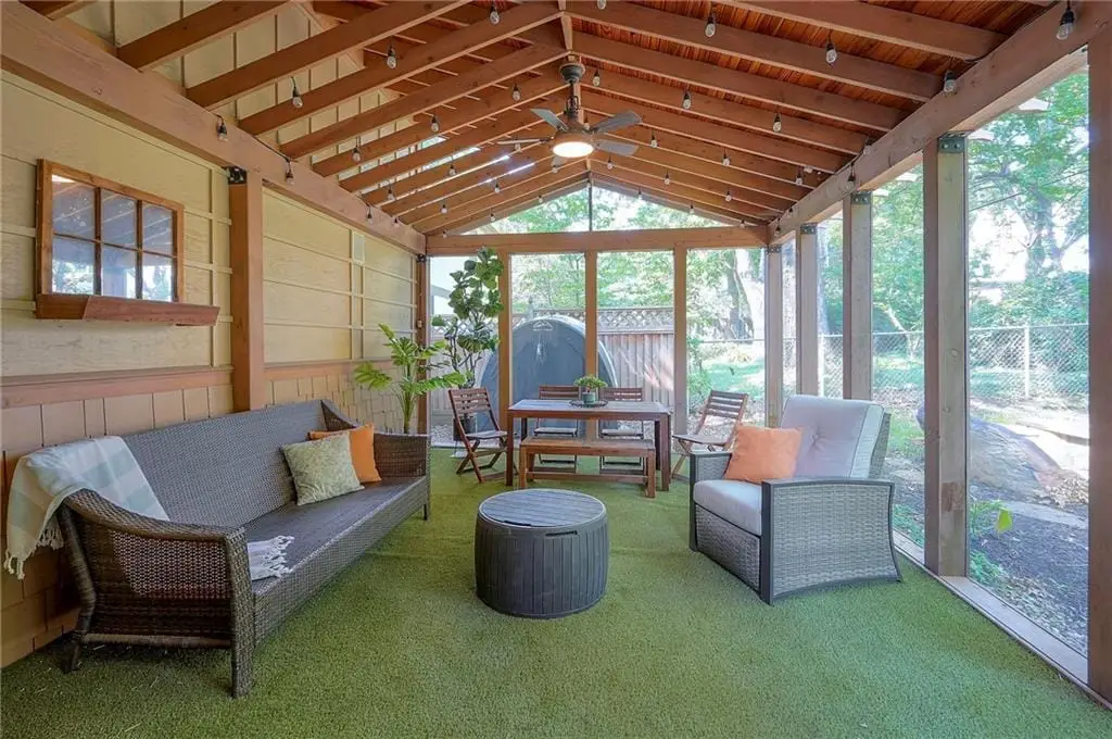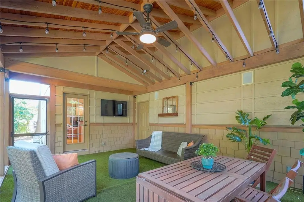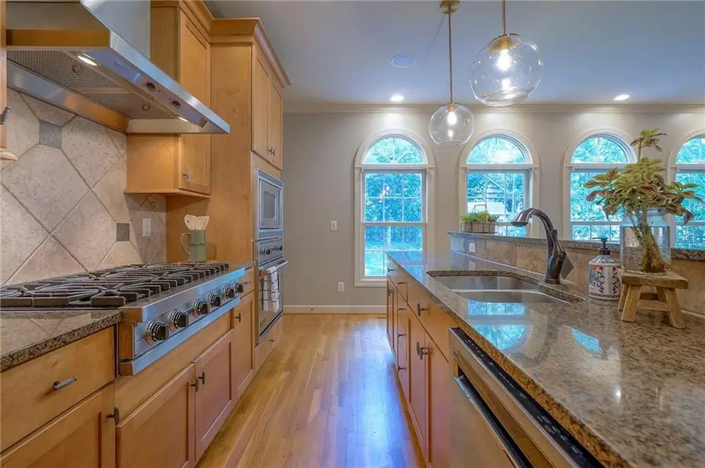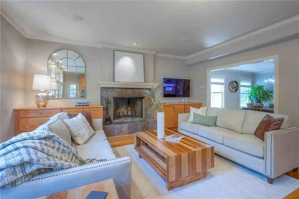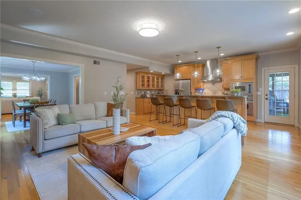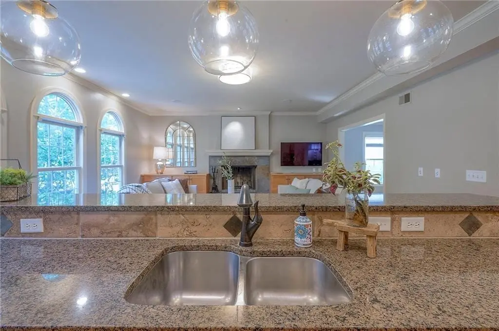 Sunlit hearth room overlooking landscaped backyard
