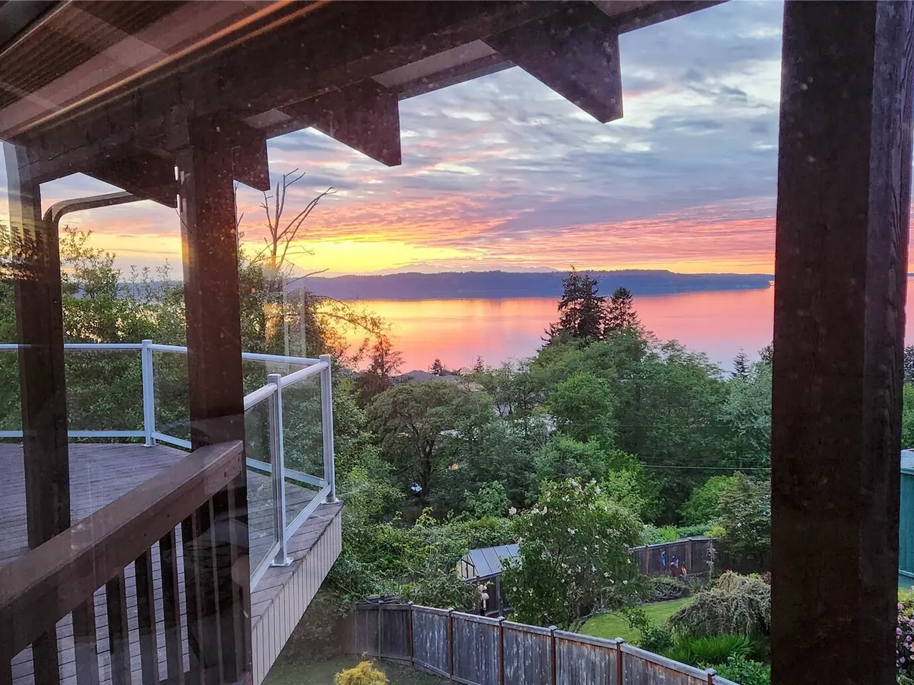 Rare find--offering panoramic Puget Sound views from nearly every room. Kitchen features solid oak upper cabinets, granite tile counters, tile floors, eating nook & a built-in pantry. Formal dining & an expansive family room w/fireplace & freestanding wood stove create a space ideal for entertaining. Primary suite boasts 3 closets & a en-suite bath w/heated floors, dual vanities, & a soaking tub. Second bedroom suite offers its own private entrance, a large open balcony, & direct access to a full bath w/heated floors & tiled tub/shower. Step onto the elegant deck to relax, dine, or simply soak in the view. Outdoor storage, deep 2-car garage, & a terraced yard complete this thoughtfully designed home--offering a lifestyle few others can match.