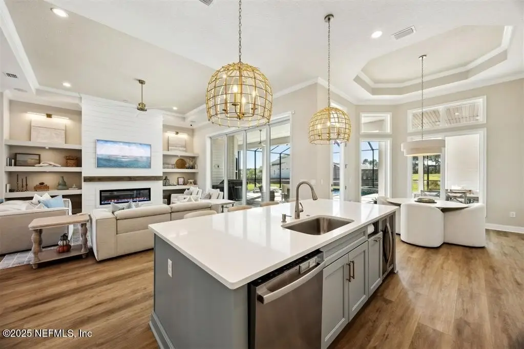 Step inside this stunning Egret V by ICI Homes, offering 4 bedrooms, 4.5 baths, and 3,395 sq. ft. of refined living space in Amelia National Golf & Country Club. A bright open layout features trey ceilings, a gas fireplace with custom built-ins, and waterfall sliders leading to a saltwater pool & spa overlooking the 15th green. The gourmet kitchen impresses with an island, breakfast nook, upgraded cabinetry, wine fridge, and hidden pantry. Each bedroom has its own en-suite bath, while the primary suite offers two walk-in closets and a spa-like bath. Additional highlights include a private office, casita with Murphy bed & full bath, and a three-car garage. Outdoor living shines with a screened lanai, grilling area, and heated spa-perfect for entertaining or relaxing in style. CDD paid off.