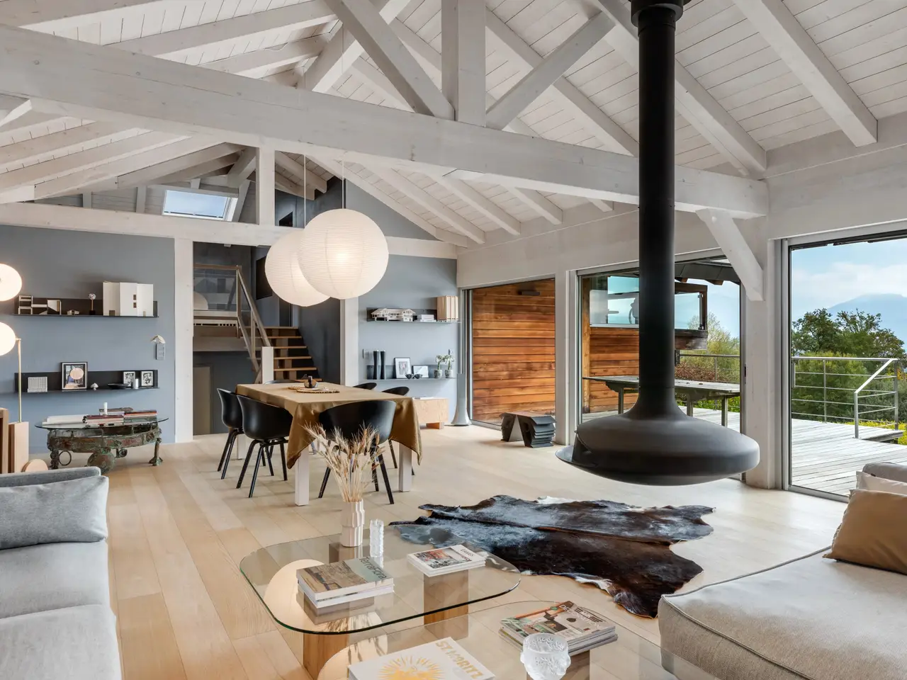 Ideally located just 30 minutes from Geneva and 15 minutes from Annecy, this contemporary architect-designed villa enjoys a rare setting with breathtaking views over the lake and mountains, in a peaceful environment with complete privacy. Nestled in the heart of a beautifully landscaped and tree-filled garden, the property offers top-of-the-range amenities and outdoor spaces designed for relaxation: a heated swimming pool, a large south-facing terrace, and a covered lounge area to the west, all opening onto a truly exceptional panorama. Every room in the house has been carefully oriented to make the most of the view, with optimal exposure towards the lake and surrounding peaks. The fully fitted and recently renovated kitchen opens onto a bright dining and relaxation area. The spacious living room, complete with fireplace, extends seamlessly onto the terrace, blurring the lines between indoor and outdoor living. The villa features four bedrooms, including a master suite with dressing room and private bathroom, a luminous office, and a charming winter lounge on the mezzanine. On the lower level, you’ll find a laundry room, boiler room, wine cellar, storage space, a double garage, and a large workshop opening onto the garden — easily convertible into a separate apartment if desired. This exceptional property will enchant you with its prime location, absolute tranquillity, natural light, and stunning panoramic views.