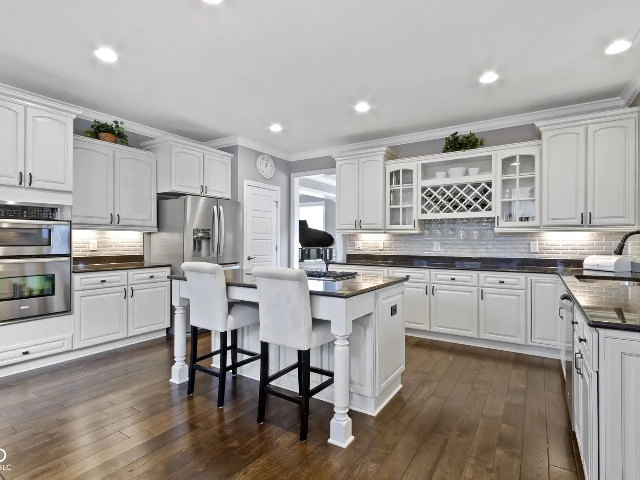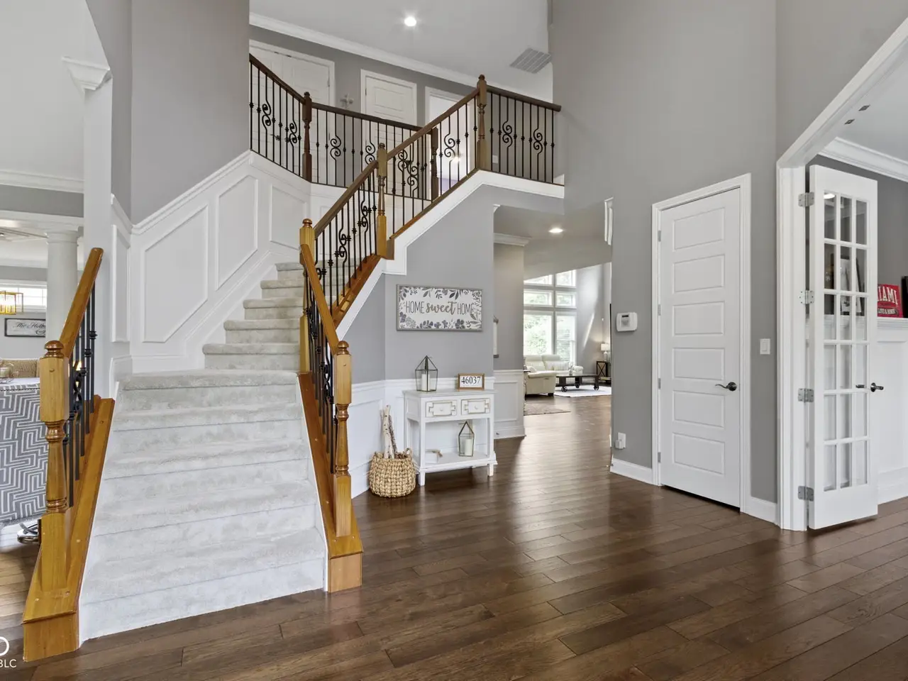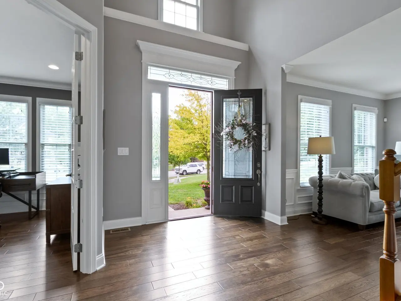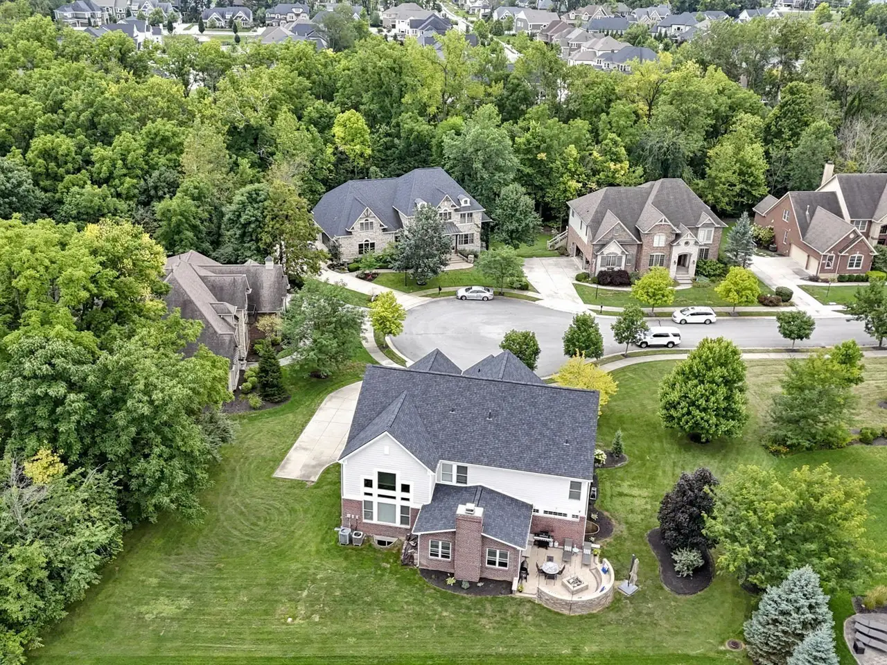Nestled at the end of a culdesac on a premier lot, this timeless 5 bedroom/4.5 bath home awaits you in one of Fishers most desirable neighborhoods-the WOODS of THORPE CREEK! Upon arrival, you are greeted with gleaming hardwood floors and soaring 2 story foyer with detailed trim work. French double doors lead to your private office with beautiful wainscotting. A thoughtfully designed floor plan offers a separate living room and a formal dining room complete with new lighting. Large eat in kitchen is a chef's delight offering an abundance of updated white shaker cabinets, tile backsplash, granite, gas cooktop in the center island, and all stainless steel appliances ready to entertain! Speaking of entertaining, directly off the kitchen enjoy intimate gatherings in the ADDED three season room with cozy gas fireplace perfect for many months of the year! Two story great room is drenched in natural light by a wall of windows with coffered ceilings, stone gas fireplace and family friendly staircase. Upstairs find your owner's suite, three addt'l bedrooms with BRAND NEW carpet. Owner's suite includes a large sitting room, raised dual sinks, w/in shower, soaking tub, and WIC with adjustable wood shelving. Don't miss the Andersen wood core windows with detailed casings. Open walkway leads to 3 additional bedrooms that are generously sized and one with private bath. All bedrooms offer walk in closets! ESCAPE downstairs to your full finished basement with a wet bar, beverage fridge, billiard area, family/rec room and an additional bedroom with full bath. A true extension of the home with storage and closets. OUTSIDE is your amazing backyard with paver patio and firepit not to mention a large wooded side lot for added privacy, a space perfect for playset or a future pool! Home is situated on .47 acre and includes 3 car side load garage. Separate family entrance into laundry and mudroom! NEW Roof 2025 and HVAC 2023. Perfect location, don't miss this one!