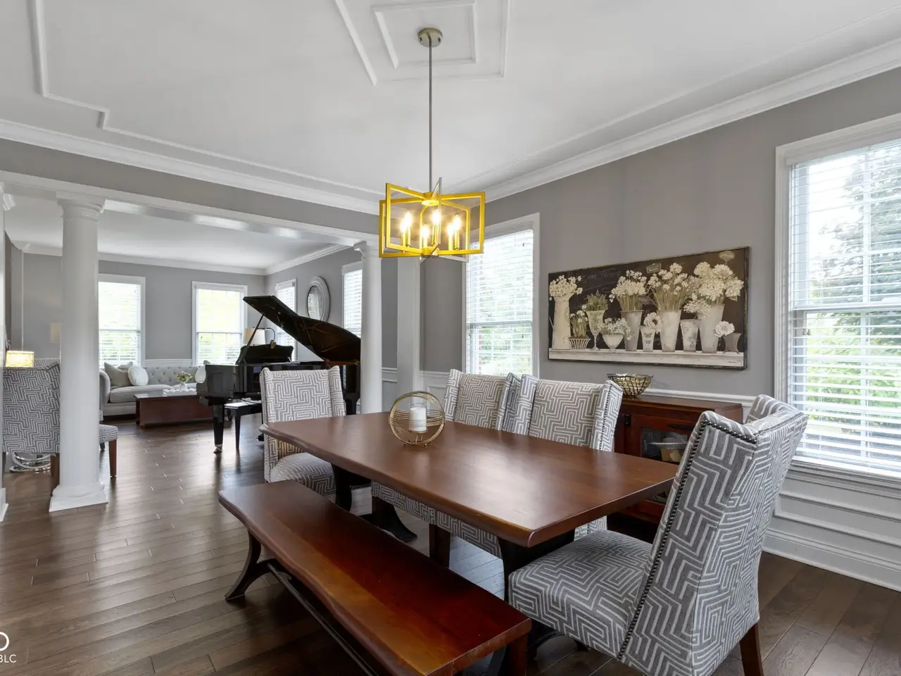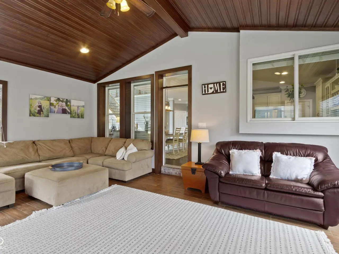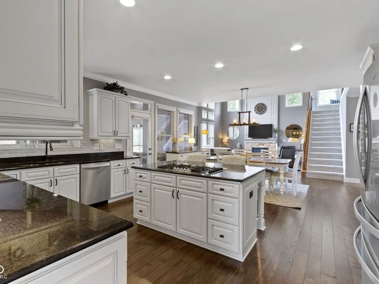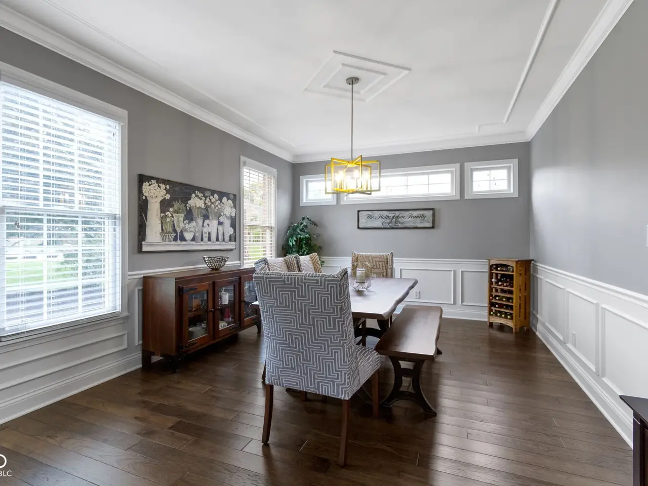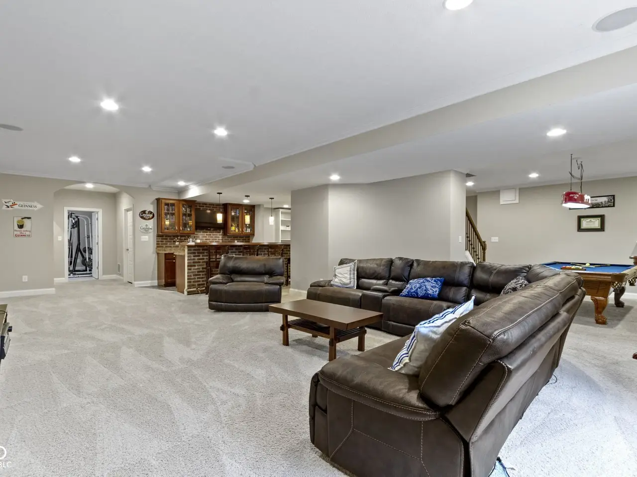 Nestled at the end of a culdesac on a premier lot, this timeless 5 bedroom/4.5 bath home awaits you in one of Fishers most desirable neighborhoods-the WOODS of THORPE CREEK! Upon arrival, you are greeted with gleaming hardwood floors and soaring 2 story foyer with detailed trim work. French double doors lead to your private office with beautiful wainscotting. A thoughtfully designed floor plan offers a separate living room and a formal dining room complete with new lighting. Large eat in kitchen is a chef's delight offering an abundance of updated white shaker cabinets, tile backsplash, granite, gas cooktop in the center island, and all stainless steel appliances ready to entertain! Speaking of entertaining, directly off the kitchen enjoy intimate gatherings in the ADDED three season room with cozy gas fireplace perfect for many months of the year! Two story great room is drenched in natural light by a wall of windows with coffered ceilings, stone gas fireplace and family friendly staircase. Upstairs find your owner's suite, three addt'l bedrooms with BRAND NEW carpet. Owner's suite includes a large sitting room, raised dual sinks, w/in shower, soaking tub, and WIC with adjustable wood shelving. Don't miss the Andersen wood core windows with detailed casings. Open walkway leads to 3 additional bedrooms that are generously sized and one with private bath. All bedrooms offer walk in closets! ESCAPE downstairs to your full finished basement with a wet bar, beverage fridge, billiard area, family/rec room and an additional bedroom with full bath. A true extension of the home with storage and closets. OUTSIDE is your amazing backyard with paver patio and firepit not to mention a large wooded side lot for added privacy, a space perfect for playset or a future pool! Home is situated on .47 acre and includes 3 car side load garage. Separate family entrance into laundry and mudroom! NEW Roof 2025 and HVAC 2023. Perfect location, don't miss this one!