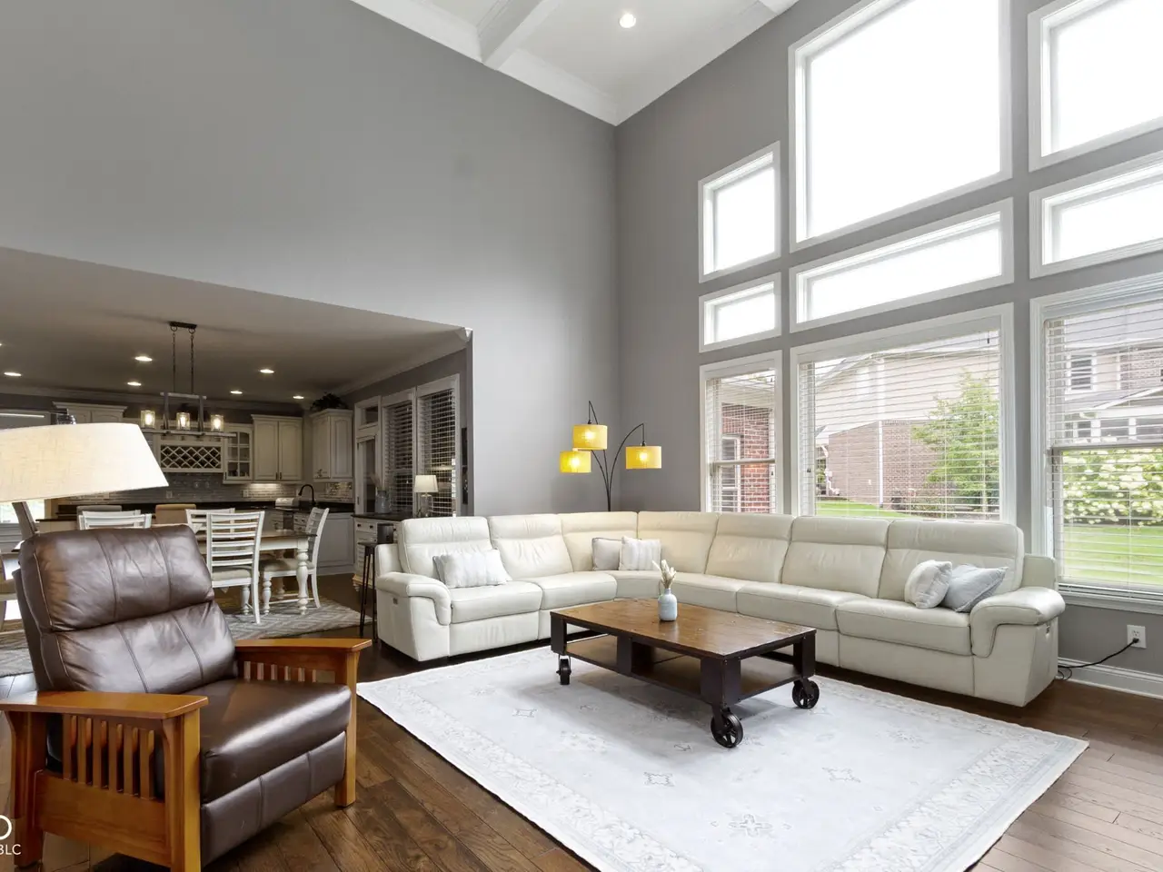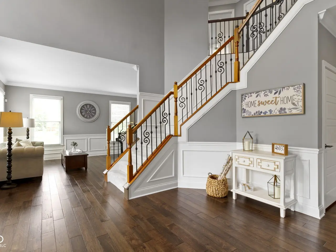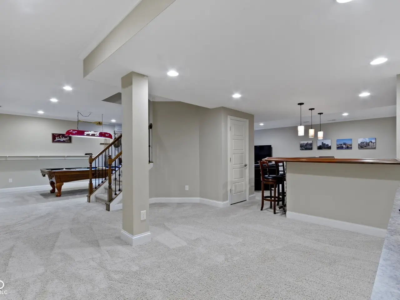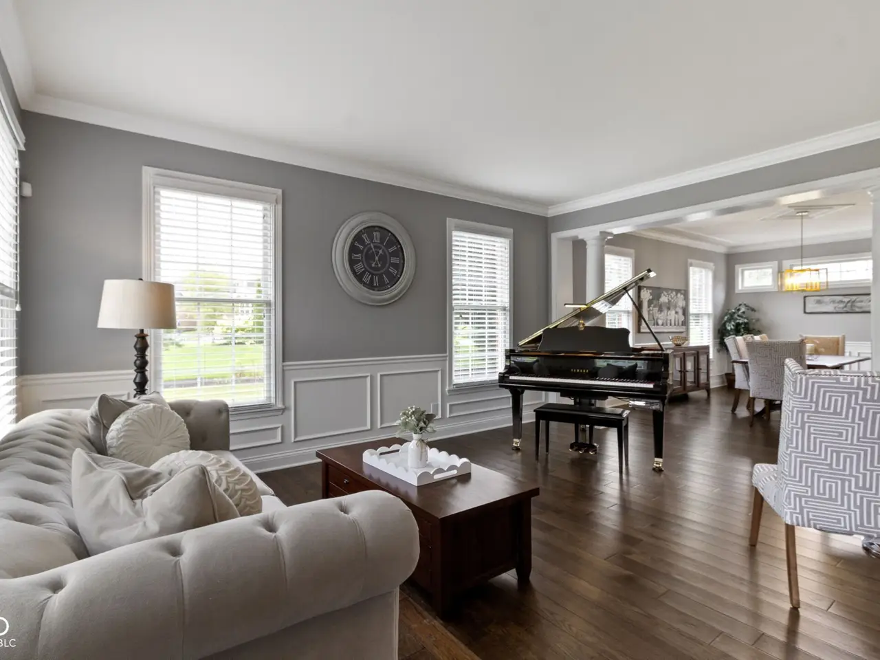 Nestled at the end of a culdesac on a premier lot, this timeless 5 bedroom/4.5 bath home awaits you in one of Fishers most desirable neighborhoods-the WOODS of THORPE CREEK! Upon arrival, you are greeted with gleaming hardwood floors and soaring 2 story foyer with detailed trim work. French double doors lead to your private office with beautiful wainscotting. A thoughtfully designed floor plan offers a separate living room and a formal dining room complete with new lighting. Large eat in kitchen is a chef's delight offering an abundance of updated white shaker cabinets, tile backsplash, granite, gas cooktop in the center island, and all stainless steel appliances ready to entertain! Speaking of entertaining, directly off the kitchen enjoy intimate gatherings in the ADDED three season room with cozy gas fireplace perfect for many months of the year! Two story great room is drenched in natural light by a wall of windows with coffered ceilings, stone gas fireplace and family friendly staircase. Upstairs find your owner's suite, three addt'l bedrooms with BRAND NEW carpet. Owner's suite includes a large sitting room, raised dual sinks, w/in shower, soaking tub, and WIC with adjustable wood shelving. Don't miss the Andersen wood core windows with detailed casings. Open walkway leads to 3 additional bedrooms that are generously sized and one with private bath. All bedrooms offer walk in closets! ESCAPE downstairs to your full finished basement with a wet bar, beverage fridge, billiard area, family/rec room and an additional bedroom with full bath. A true extension of the home with storage and closets. OUTSIDE is your amazing backyard with paver patio and firepit not to mention a large wooded side lot for added privacy, a space perfect for playset or a future pool! Home is situated on .47 acre and includes 3 car side load garage. Separate family entrance into laundry and mudroom! NEW Roof 2025 and HVAC 2023. Perfect location, don't miss this one!