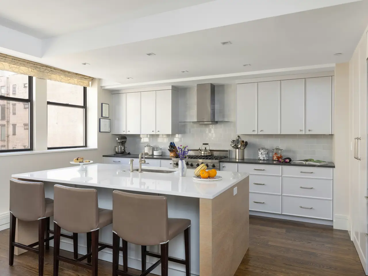 Snow quartz countertops and floor-to-ceiling white Bilotta cabinets