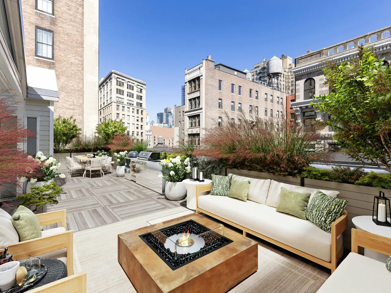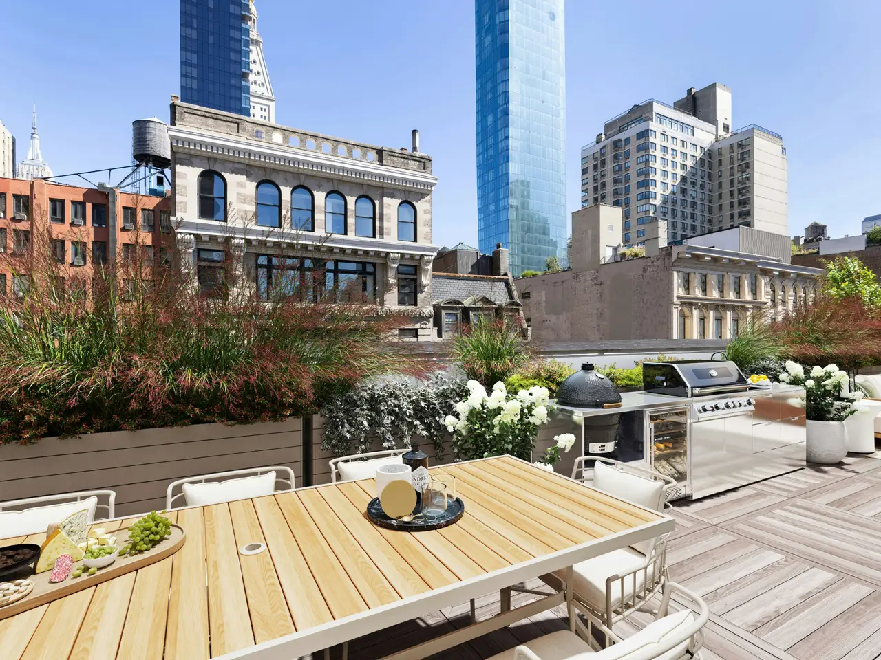 Located in the heart of the Flatiron district - on 21st Street between Broadway and Park Avenue South - moments from both Madison Square Park and Union Square Park and surrounded by the most esteemed dining in the city, this extraordinary mint condition 4100+ SF Penthouse is a rare combination of space, light, dramatic views, and flawless design. The Penthouse at 24 East 21, a discreet 8 unit boutique condo with virtual doorman, is a fabulous full floor, triple mint 4 bedroom/4.5 bath stunning, one of a kind home featuring a huge private outdoor oasis with dramatic open city views. Upon entering the Penthouse from the private keyed elevator you are greeted by an expansive 40+ foot long living/dining room flooded with light from striking skylights and north and south-facing windows with dramatic architectural views; it showcases a working gas fireplace with a 12 foot high feature wall visible as soon as one arrives from the private elevator, 15 foot ceilings, walnut-stained wide plank solid white oak floors, and a Juliet balcony. It feels more like the great room of a Hamptons house than a New York apartment. The brand new oversized windowed eat-in kitchen features a large center island, snow quartz counter tops, floor-to-ceiling white Bilotta cabinets, and a large walk-in pantry. Top of the line appliances include a Sub-Zero side-by-side refrigerator/freezer, a Viking Professional 6 burner stove with a hood that vents out, and both Fisher Paykel and Bosch dishwashers. Directly adjacent to the kitchen is a home office/staff room that contains a full bathroom and is an ideal home gym or sauna A stone paved powder room ideally located for guest access completes the public wing of this truly spectacular home. The private domain of this vast home is reached by a breathtaking gallery with 12 foot high, exceptionally bright, floor to ceiling glass panes, peaked by an expanse of soaring skylights. The great hall leads to the private wing where you first encounter an enormous media/family lounge, the much coveted and impossible to find additional gathering place for movie nights, cocktails for guests in the fully stocked bar, or a massive home office or boardroom that is truly the height of elegance and style. To the south is the immense and opulent primary bedroom domain, sun-flooded from soaring ceilings and expansive skylights that perfectly frame stunning panoramas of spires, architecture and sky. This decadently large oversized suite is whisper quiet and features a southern-facing bank of windows with electric blinds, custom walk-in closet, second fitted closet, and a luxurious en-suite marble bathroom with a double vanity, deep soaking tub, and a separate walk-in shower. There are two additional queen sized bedrooms - both of ample proportions - with one containing an en-suite windowed bath. Finally, off the gallery, there is a full bathroom with a Miele washer and potentially vented dryer that serves the third bedroom; both bedrooms offer generous custom closets. This grand apartment has three zone central air conditioning and private elevator access from two key locked elevators. Pristinely painted, finished and maintained to the highest standard. The piece-de-resistance is the private outdoor oasis. Over 700 square feet of private, landscaped, irrigated terracing - 25" wide by 47" long - with a three season cabana for luxurious lounging, and decked in exotic weather-proof solid hardwood that requires no maintenance and begs for grand-scale entertaining, equally inviting for intimate gatherings, with glorious views of the Met Life Tower and the Empire State Building. It is the ideal quiet refuge - insulated from the sounds of the city - and you will feel as if you're on vacation without ever having to leave the city. Infinity Flats, a boutique pet-friendly building containing 8 full-floor apartments, and features private key-lock elevators, a 24 hour virtual doorman for guest and delivery access, and secure lobby lockers for all of your valuable packages. Perfectly located in the heart of the vibrant Flatiron district, Gramercy, Madison Square and Union Square at your doorstep with world class restaurants and shopping at your feet, on a distinguished residential and elegant block, this is an opportunity to enjoy a grand New York City lifestyle: truly a private home in the heart of the city and the epitome of luxurious indoor/outdoor living. Look no more! Please note: taxes listed are for a primary resident with the STAR rebate.