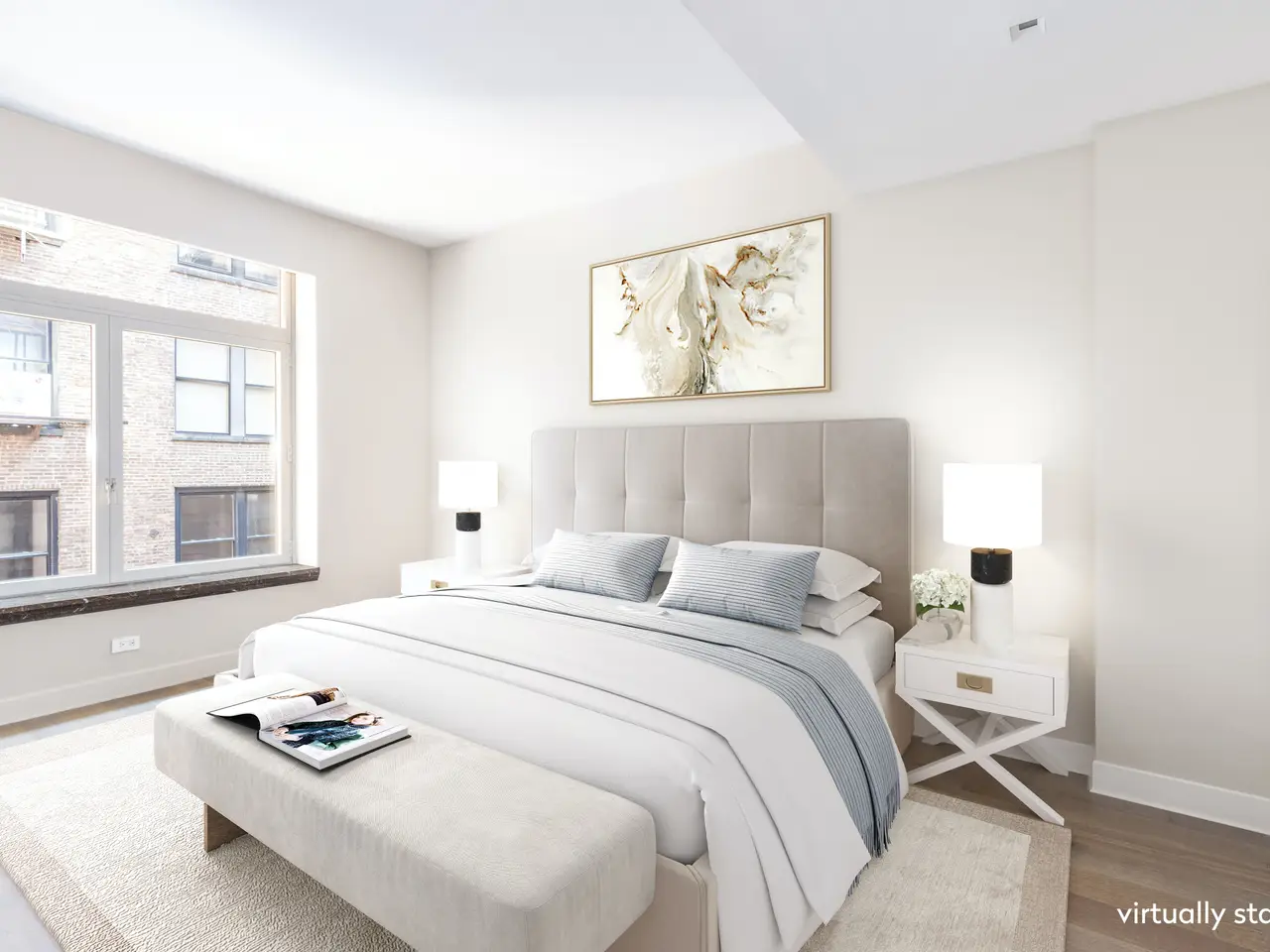 This stunning, near-mint condition 2-bedroom 2-bathroom apartment occupies a full-floor in a boutique, designer doorman building in prime and coveted Flatiron area. Residence 5 at 21 West 20th Street is the pinnacle of luxury living with a vast array of high-end finishes, modern conveniences throughout, and low taxes thanks to a 421a abatement. Enter directly off of the elevator and be drawn toward the open living area with enormous floor-to-ceiling windows and picturesque vistas of West 20th Street and the gorgeous prewar architecture across the street. Light pours in from the South, bathing the room in sun. The living/dining area has been outfitted with an elaborate array of built-ins that provide an abundance of storage space as well as a murphy bed that has been thoughtfully concealed in the entertainment center. An immaculate chef's eat-in kitchen has seen minimal use and is clad in a beautiful mix of white oak and stainless steel custom cabinetry, olive marone marble countertops and a stainless steel backsplash. The top-of-the-line Miele appliance suite offers a 4-burner gas stove and oven that vents to the exterior, integrated 36" refrigerator with double freezer drawer and ice maker, dishwasher and concealed integrated microwave. Rounding out the kitchen is a Julien sink with Grohe fixtures including an instant hot/cold purified water faucet as well as garbage disposal. The adjacent dining area features an additional Marvel wine fridge and custom storage. The bedrooms are secluded and in the northern wing of this immaculate residence. The primary suite is well-proportioned with all custom closetry and en-suite full bath finished in Novelda Cream Limestone flooring and driftwood marble surround on the oversized vanity and glass-enclosed soaking tub. The second bedroom features a custom walk-in closet with sliding barn door and utilizes the second full bathroom located in the hallway. The second bathroom is beautifully appointed with glass tiles in the second glass-enclosed soaking tub, Caesarstone quartz vanity countertop and off-white porcelain tiled floor. Additional conveniences include central AC, in-unit washer/dryer by Bosch, in-unit refuse chute, a robust AV system by Cave Group and gorgeous rift-cut white oak floors that run throughout the apartment. Consisting of 13 full-floor residences, 21 West 20th Street is a sleek and handsome boutique luxury condominium designed by famed interior architect David Mann of MR Architecture Dcor and WELL and LEED certified. Residents enjoy the service of a 24-hour doorman, gorgeous resident lounge, and spacious outdoor garden with seating areas. There is refrigerated storage for grocery deliveries as well as central laundry, pet wash room, and bike storage. Perfectly situated between Fifth and Sixth Avenue, 21 West 20th Street is close to the finest in Flatiron shopping, entertainment and dining experiences, and minutes away from Union Square and a plethora of transportation options. Pets are welcome. 421a tax abatement in place until July 2023.