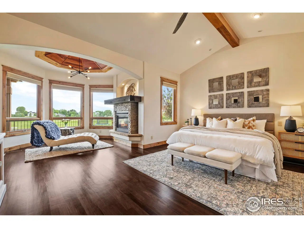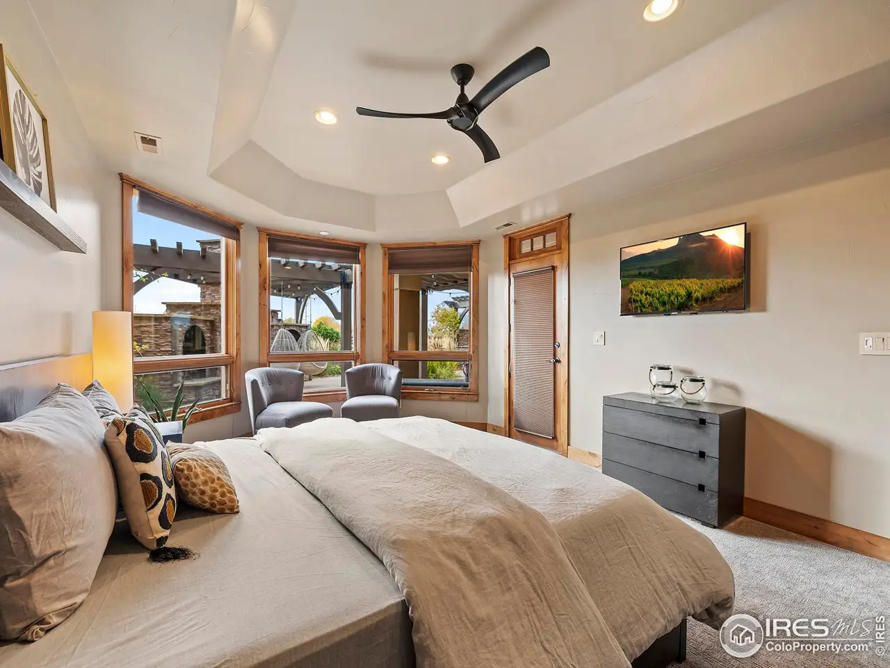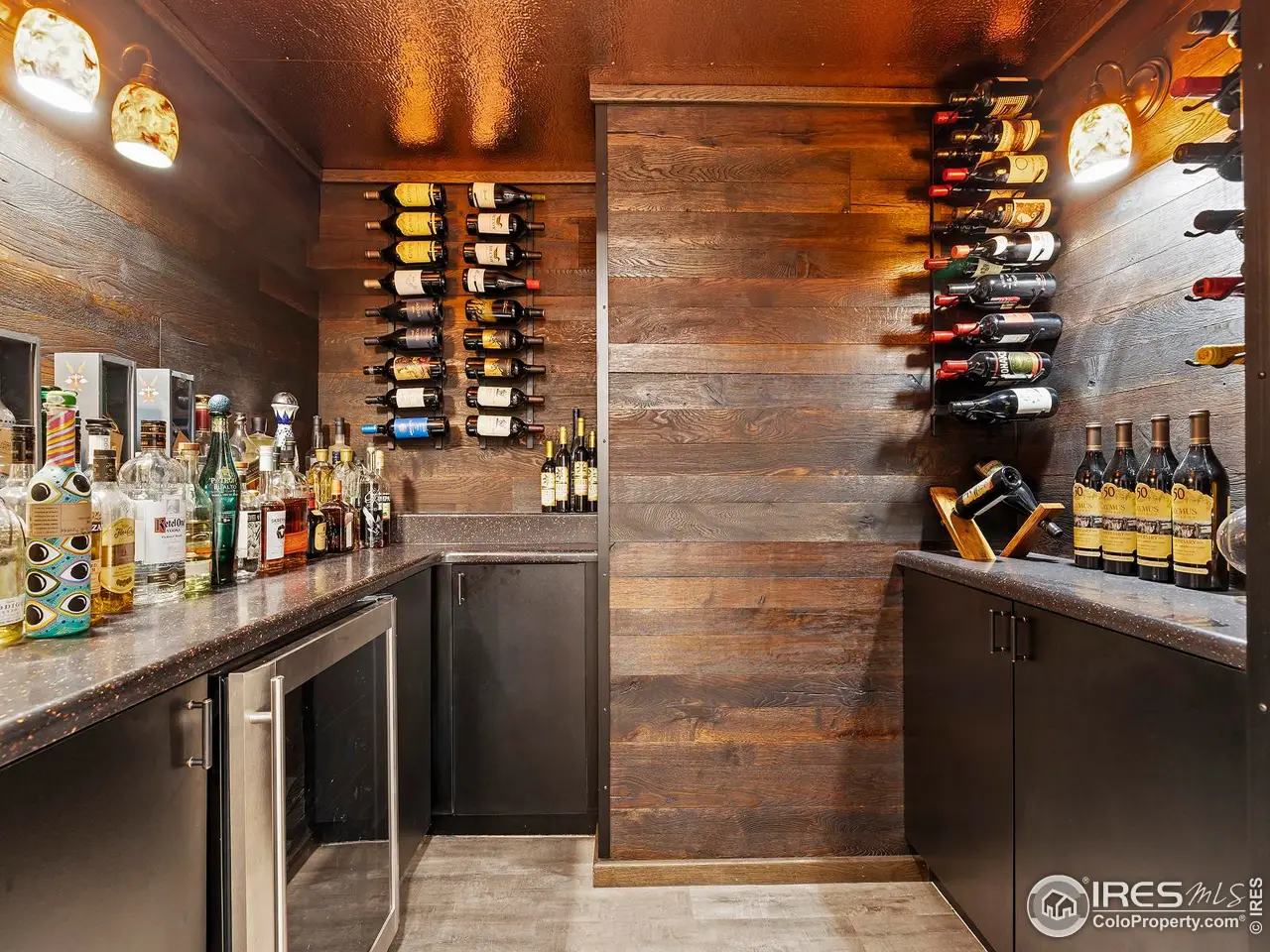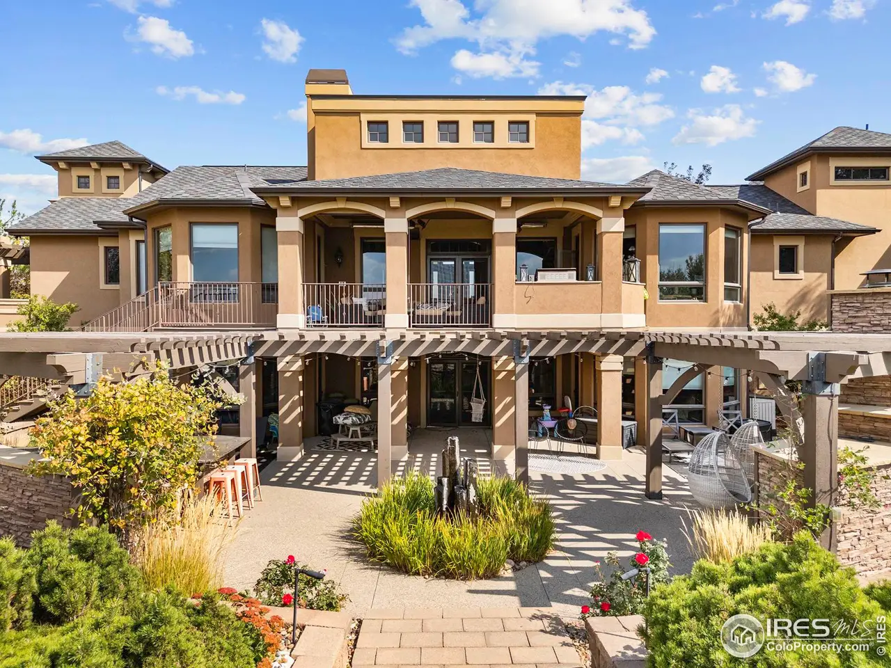 This luxury home at 863 Riparian Way in Fort Collins is a modern masterpiece. The gourmet kitchen includes granite countertops, a spacious island, and premium appliances: six-burner Viking range, double oven, wine fridge, ice maker, Samsung Smart Refrigerator, and pot filler. With under-cabinet lighting and a large walk-in pantry, breakfast nook with a custom wood-lined ceiling and bay window offers panoramic foothill views. The formal dining room has a 12' coffered ceiling, designer lighting, and a pass-through buffet perfect for entertaining. In the great room, 23' ceilings, hand-troweled walls, and a stone fireplace framed by reclaimed wood shelves create a stunning focal point. The primary suite features a gas fireplace, coffee bar, walk-in closet, bathroom with steam shower, heated floors, and access to a private patio wired for a hot tub. The main floor study doubles as a fifth bedroom with vaulted ceilings, built-in cabinetry, and an adjacent 3/4 bath. Upstairs, the ensuite has a gas fireplace, wet bar, vaulted ceilings, and 3/4 bath. Secondary bedrooms have new carpet (2022), walk-in closets, and remodeled ensuites with custom cabinets and designer fixtures. The remodeled basement (2022) includes a wet bar with quartz counters, luxury vinyl flooring, a wine cellar with copper ceiling, a theater room with projector, and ample storage. A stone gas fireplace and built-in shelving add warmth to the game room. From coffered ceilings to high-end finishes, this home showcases impeccable craftsmanship. Enjoy Colorado foothill views from the upper Trex deck with a built-in grill, heaters, sun shades, and fans. The walkout lower level has a wood-burning fireplace, water feature, and outdoor kitchen with grill, mini fridge, sink, granite island, and beverage sink. An aggregate patio leads to a garden, horseshoe pit, and fire pit. This property backs to HOA open space, with forever views and a temperature-controlled 4-car garage with electric car charger hookups.