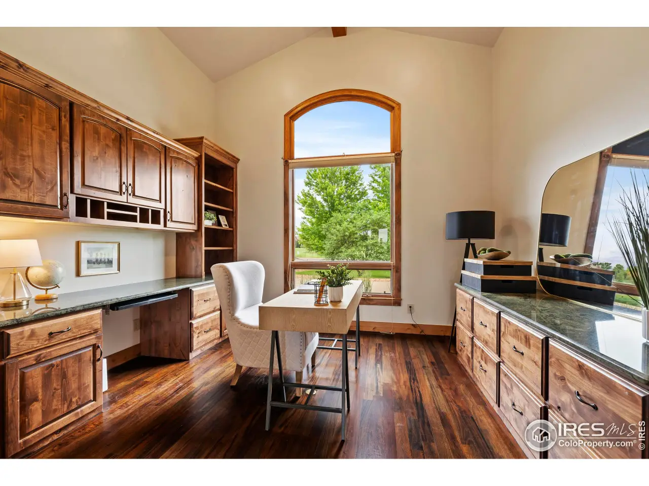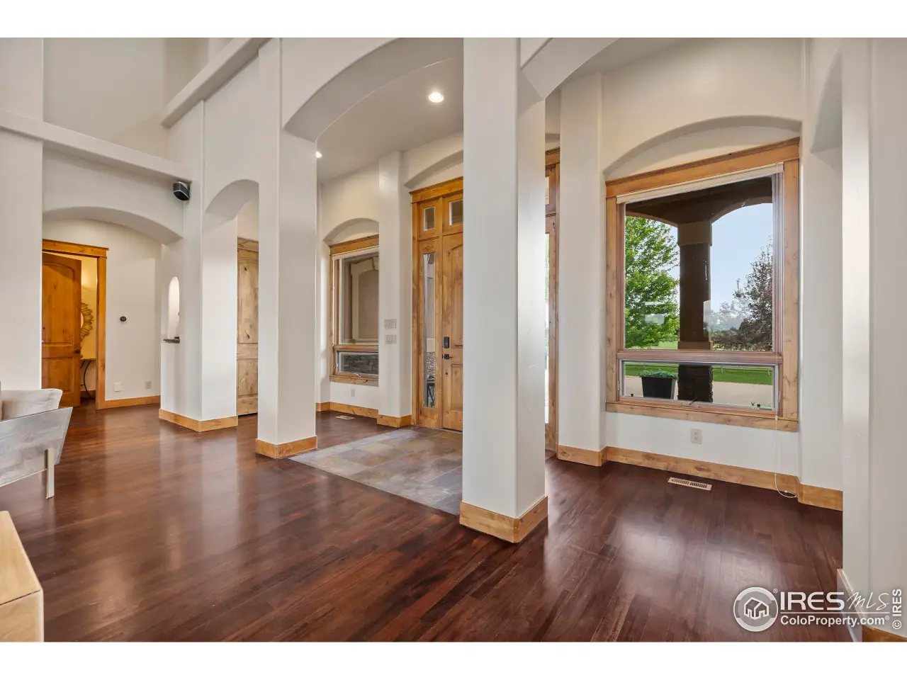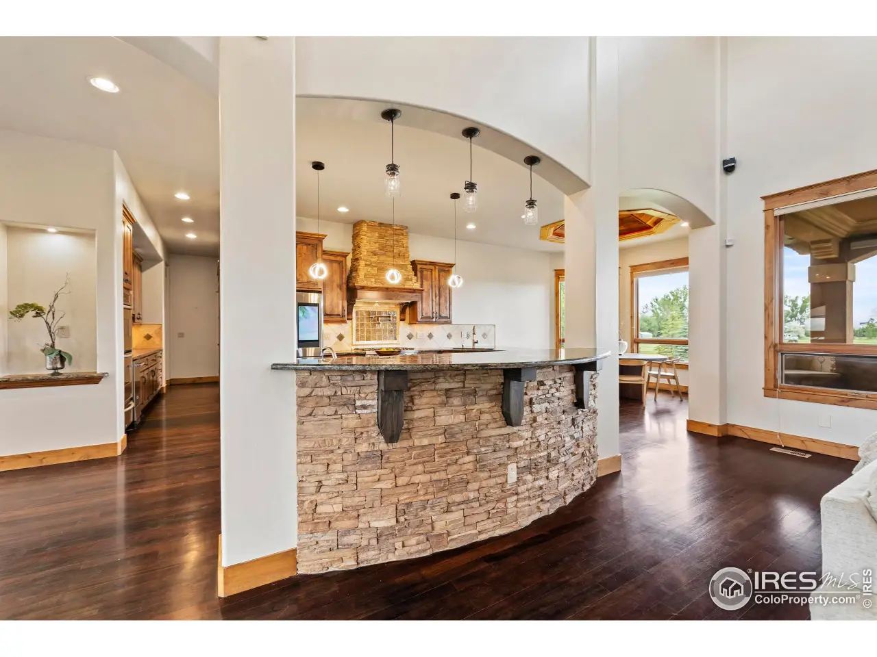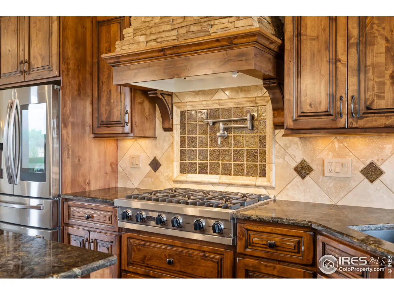 This luxury home at 863 Riparian Way in Fort Collins is a modern masterpiece. The gourmet kitchen includes granite countertops, a spacious island, and premium appliances: six-burner Viking range, double oven, wine fridge, ice maker, Samsung Smart Refrigerator, and pot filler. With under-cabinet lighting and a large walk-in pantry, breakfast nook with a custom wood-lined ceiling and bay window offers panoramic foothill views. The formal dining room has a 12' coffered ceiling, designer lighting, and a pass-through buffet perfect for entertaining. In the great room, 23' ceilings, hand-troweled walls, and a stone fireplace framed by reclaimed wood shelves create a stunning focal point. The primary suite features a gas fireplace, coffee bar, walk-in closet, bathroom with steam shower, heated floors, and access to a private patio wired for a hot tub. The main floor study doubles as a fifth bedroom with vaulted ceilings, built-in cabinetry, and an adjacent 3/4 bath. Upstairs, the ensuite has a gas fireplace, wet bar, vaulted ceilings, and 3/4 bath. Secondary bedrooms have new carpet (2022), walk-in closets, and remodeled ensuites with custom cabinets and designer fixtures. The remodeled basement (2022) includes a wet bar with quartz counters, luxury vinyl flooring, a wine cellar with copper ceiling, a theater room with projector, and ample storage. A stone gas fireplace and built-in shelving add warmth to the game room. From coffered ceilings to high-end finishes, this home showcases impeccable craftsmanship. Enjoy Colorado foothill views from the upper Trex deck with a built-in grill, heaters, sun shades, and fans. The walkout lower level has a wood-burning fireplace, water feature, and outdoor kitchen with grill, mini fridge, sink, granite island, and beverage sink. An aggregate patio leads to a garden, horseshoe pit, and fire pit. This property backs to HOA open space, with forever views and a temperature-controlled 4-car garage with electric car charger hookups.