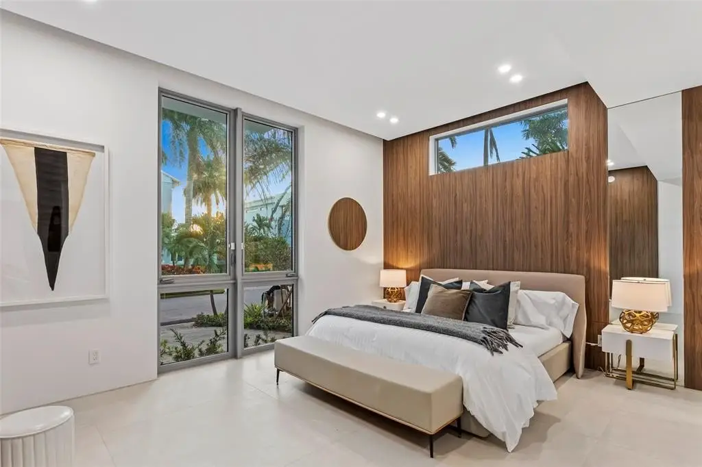 Chic New Construction 7-Bedroom Residence Sited on 85' of Deepwater in Las Olas Isles. Defined by clean lines and a bright open ambience offering water views from every major room, this Las Olas Modern 8,116 ± total sq ft waterfront home encapsulates a sophisticated elegance for a ‘Now’ style of living. Dramatic two-story foyer, faced by wrap-around walls of glass, flows out past the elevator vestibule & main living room to a true Chef's kitchen and waterside formal dining room. Opposite the private loggia is an intimate club room featuring impressive book matched stones, wood paneling, and large-format porcelain tile floors complete the first level. Beautiful white-oak wood floors and integrated LED wall displays lead to a huge upstairs Master Suite, 4 VIP Bedrooms, and a Sunset facing terrace.