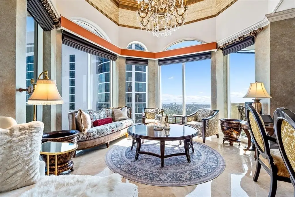 Elegantly Re-Imagined Corner Penthouse, offered fully furnished, boasts 4,200 +/- total sqft of European refinement with sweeping views of the Ocean, New River, and Cityscape. Atop Las Olas Grand, the premier address of downtown, this sophisticated split-plan residence was refitted with the finest materials & finishes across 3 Bedrooms plus an Office/Den, and 3 Full & 1 Half Bathrooms. Features include a handsome Poggen-Pohl kitchen with luxe Appliances, Control4 Smart Home automation for lighting, shades, HVAC, scenes, video and Bowers & Wilkins audio, Swarovski Crystal Chandeliers & fixtures, and volume 10’ – 16’ ceilings with inlaid mother of pearl accents and imported stones. Other amenities include 3 convenient Garage Bays and a huge 8’x24’+/- climate-controlled storage/hobby room.
