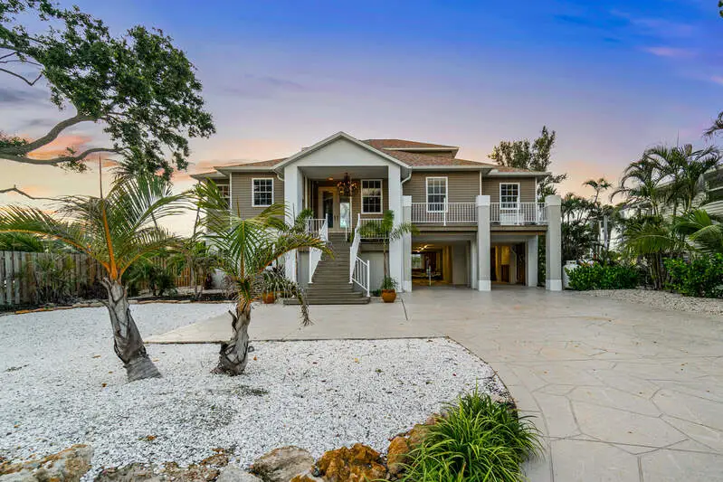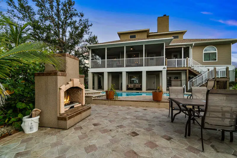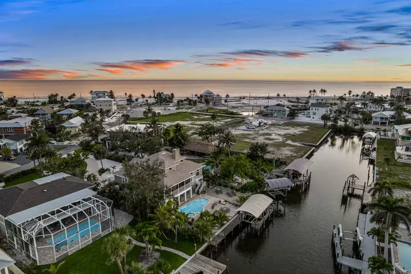 Stunning coastal retreat with breathtaking water views, nestled on an oversized lot on Fort Myers Beach. Just a short 5-minute walk to the beach, it's a true sanctuary for beach lovers and boating enthusiasts alike-complete with direct Gulf-access from your private dock featuring a 10,000 lb lift and canopy. The resort-style backyard is designed for both relaxation and entertaining, with a spacious screened-in second-floor balcony, large pool, spa, and multiple lounge areas-including your own private beach oasis. Inside, the open-concept floor plan is equally impressive with 3 bedrooms & a den, soaring 21-foot ceilings, beautiful wood-look flooring, and a charming wood-burning fireplace. The chef's kitchen has a unique modern design featuring wood-paneled ceilings, sleek steel accents, stainless-steel appliances, and a professional-grade 8-burner gas stove. The expansive primary suite is a true retreat with its own attached den/seating area and a spa-like bathroom offering dual rainfall shower heads, dual vanities, and a deep soaking tub. Upstairs, you'll find a spacious loft area that makes for the perfect media lounge. Additional highlights include versatile ground-floor flex space, a whole-house generator, and room to add a private elevator. Ideally situated on a quiet stretch of Estero Island, this extraordinary home is just minutes from fantastic restaurants and offers easy access to Lovers Key and Bonita Beach.