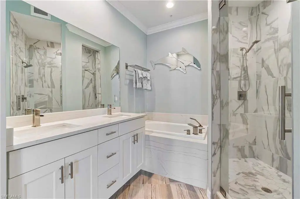 Spa-like bathroom with dual vanities