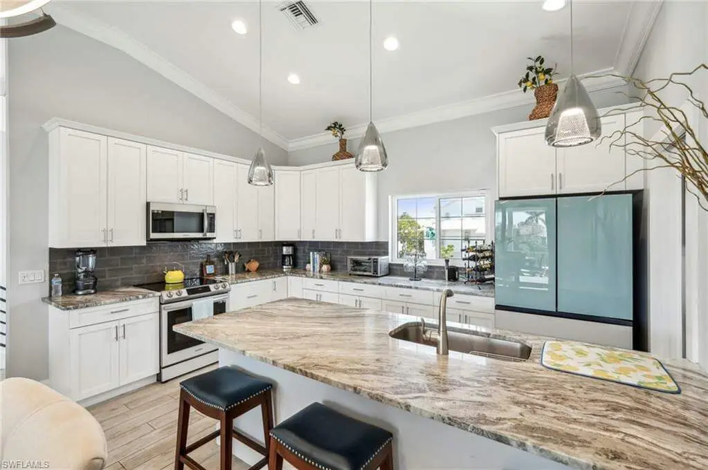 Welcome home to this gorgeous, elevated TURNKEY FURNISHED 3/2/2 direct gulf access pool home only steps to the white sands of the Gulf via your deeded Beach access. As you enter through the front doors you will be immediately wowed by the two-story entry way. The interior of this home features porcelain wood plank tile, soaring ceilings and an open floor plan. The beautiful white shaker kitchen with stainless appliances and stunning granite counter tops overlooks the main living area, great for entertaining. The ample sized master bedroom with walk in closet space also boasts an en-suite bath with dual sinks and a custom tiled walk-in shower. The second story enclosed balcony directly off the main living area is perfect for enjoying the serene canal views. In addition to the large 2 car garage on the main level there is an additional huge bonus area with so many possibilities. Step outside to your Florida oasis and enjoy relaxing by the pool, amazing fishing, or jump on your boat with your own private boat dock with a 14K lift to explore all SW Florida has to offer. Don't wait for new construction, you can move right into this 6-year young home! Huge price reduction!