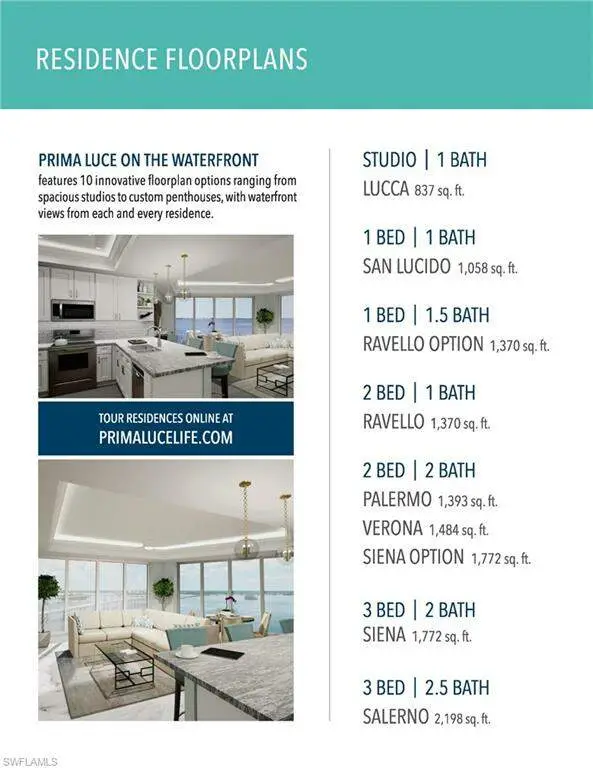 CENTER PENTHOUSE Stunning sunrise views of the Caloosahatchee River Estuary from your two private expansive balconies and floor to ceiling windows of the living area. This Pet- Friendly pre construction 22nd floor penthouse offers unobstructed views, high ceilings, 8 interior doors paired with upgraded cabinets, crown moulding, plumbing fixtures and appliances. Work directly with our architect for complete customization. Prima Luce’s resort-inspired amenities include a zero-entry heated swimming pool, whirlpool, yoga studio and fitness center, library and business center & a community social space complete with catering kitchen. Each residence includes one lobby-level storage locker and one covered parking space in the secured private parking garage with additional parking spaces available for purchase. Prima Luce is located on the shores of the Caloosahatchee in the Historic River District of Downtown Fort Myers, Florida, and is only a short walk, trolley or bike-ride from fine dining and shopping, a vibrant arts and entertainment scene, numerous local festivals and events, boating and nature activities, and so much more! Sales office located at 2235 First Street