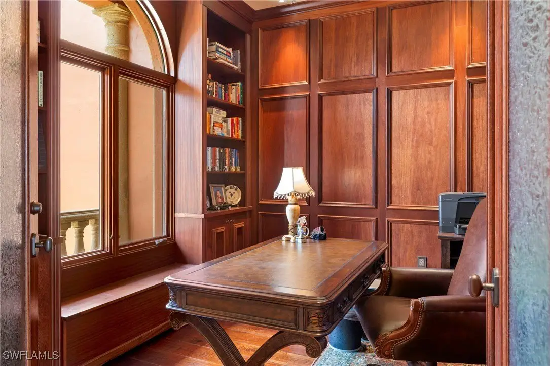 Welcome to a Masterpiece of Mediterranean Elegance, Incredible Craftmanship, and Commercial-Grade Construction. Designed by esteemed architect W.A. Bud Lawrence, this estate is nestled on the widest canal in Town & River, offering direct deep-water access to the Gulf. A true boater's paradise, the expansive dock accommodates multiple vessels-your yacht, go-fast boat, and sportfishing craft. Every element of this home speaks to superior design and performance, from the newly installed roof and artisan stonework to the lush landscaping and grand entry courtyard. All entries are secured with custom iron doors, blending beauty with security. Auto lovers will appreciate the garage with two car lifts. The open-concept interior centers around a stunning family room and gourmet kitchen, complete with luxury stone surfaces, a companion island, walk-in pantry, and top-tier appliances. An in-home theater with a 176" screen, motion seating, and kitchenette offers a private cinema experience. The VIP suite on the main floor is a tranquil retreat featuring a fireplace, dual closets, spa-style bath, and private porch. A cherrywood-wrapped den and a versatile fitness room round out the main level. Step outside to your private resort: an infinity-edge pool with spa, lighting, and fire features, plus a summer kitchen, outdoor shower, and full pool bath. Additional highlights include stone flooring, digital shower jets, ceiling-integrated linear A/C diffusers, three laundry stations, and upstairs guest rooms with private balconies. A separate entrance leads to a private guest suite. Smart-wired and impeccably appointed, this estate defines elevated living in one of Southwest Florida's premier boating communities-just minutes from dining, golf, fitness, medical care, shopping, and world-class beaches.