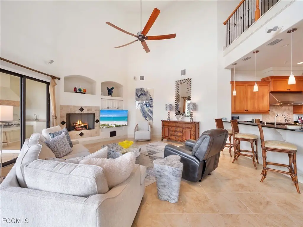 TURNKEY with exceptions and nestled in the exclusive, gated community of Catalpa Cove, this stunning 5,426 sq. ft. waterfront home offers unparalleled luxury, an exceptional value, breathtaking views of the river and recent updates to the family room, master bedroom and Foyer. Just minutes from the pristine beaches of Sanibel and Captiva Islands, this property is a boater's dream with quick access to open waters and a newer boat dock with 16,000lb. lift and low maintenance free decking. The home features soaring ceilings and an open floor plan, ideal for entertaining and letting natural light into the home. Large bedroom suites with private baths, plus separate guest quarters, ensure comfort and privacy for all. Enjoy a huge lower-level bonus area offering an additional 2,344 sq/ft, perfect for a variety of uses. Step outside to an expansive lanai with a pool, 2 outdoor kitchens and plenty of deck space, or relax on the rooftop sun deck with panoramic water views. Additional highlights include an elevator, fireplace, three-car garage with option of additional stalls, solid construction, and all the premium upgrades you'd expect from a home of this caliber. Whether as a family retreat or a vacation getaway, this property combines spacious living, exceptional waterfront access, and the perfect blend of privacy and luxury. For those wanting additional land with a second dock measuring 60' long and newly installed seawall the adjacent lot can be purchased with the house.