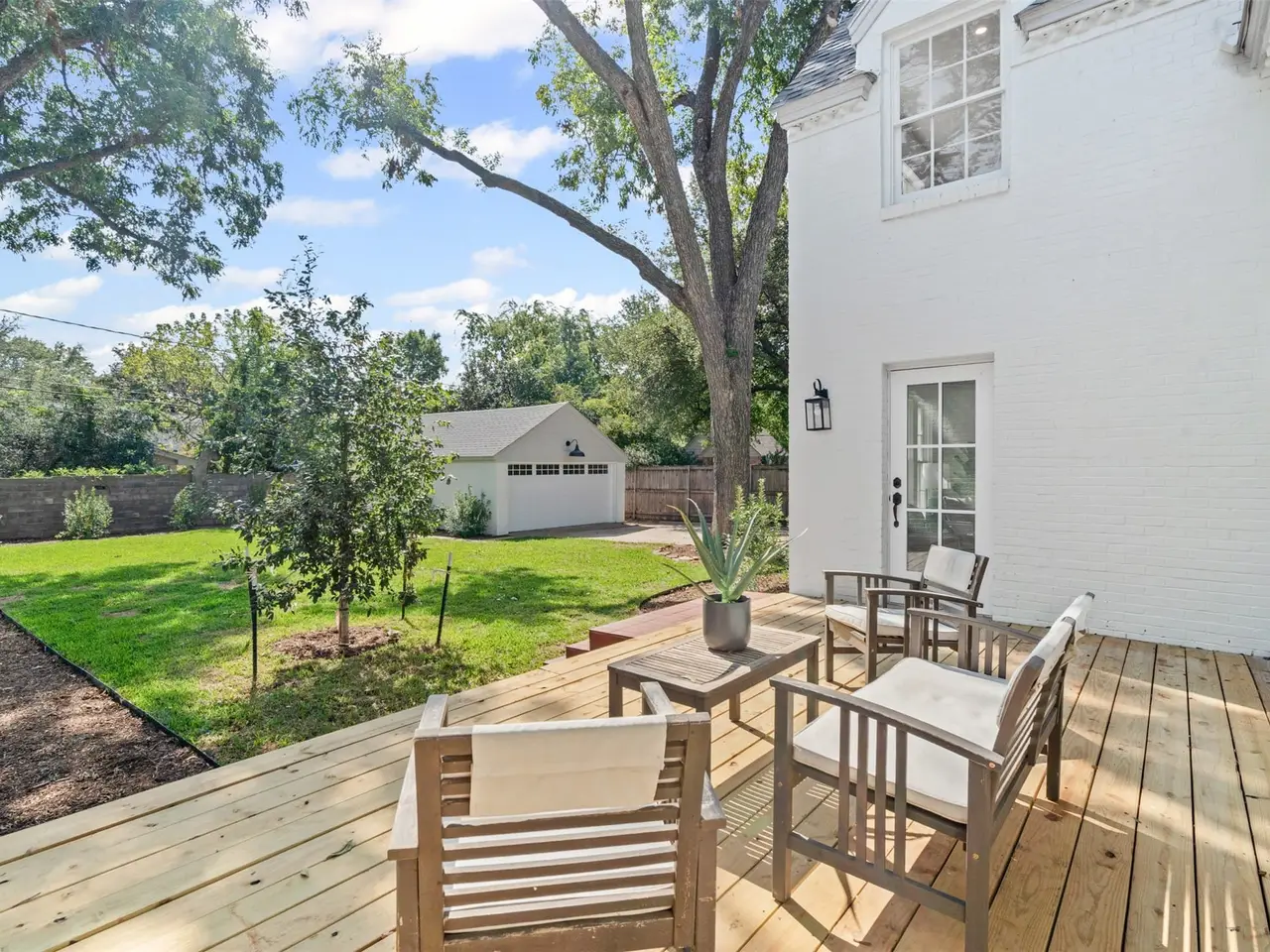 Large deck overlooking lush backyard