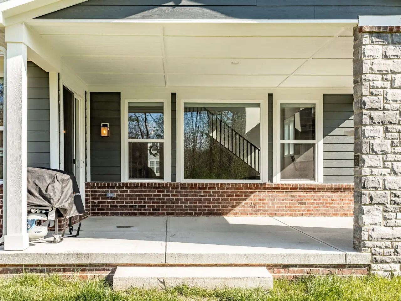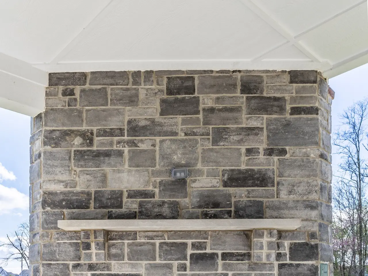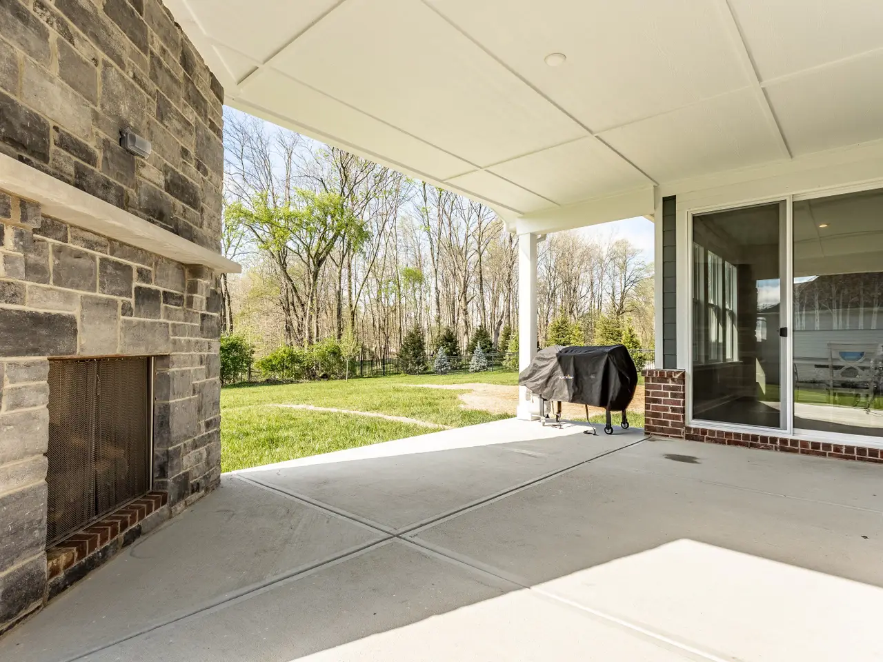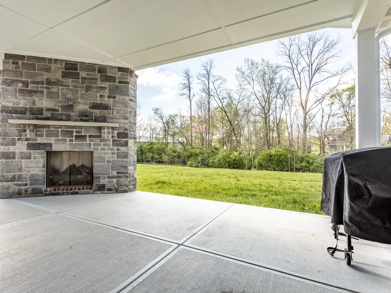 Outdoor fireplace on covered patio