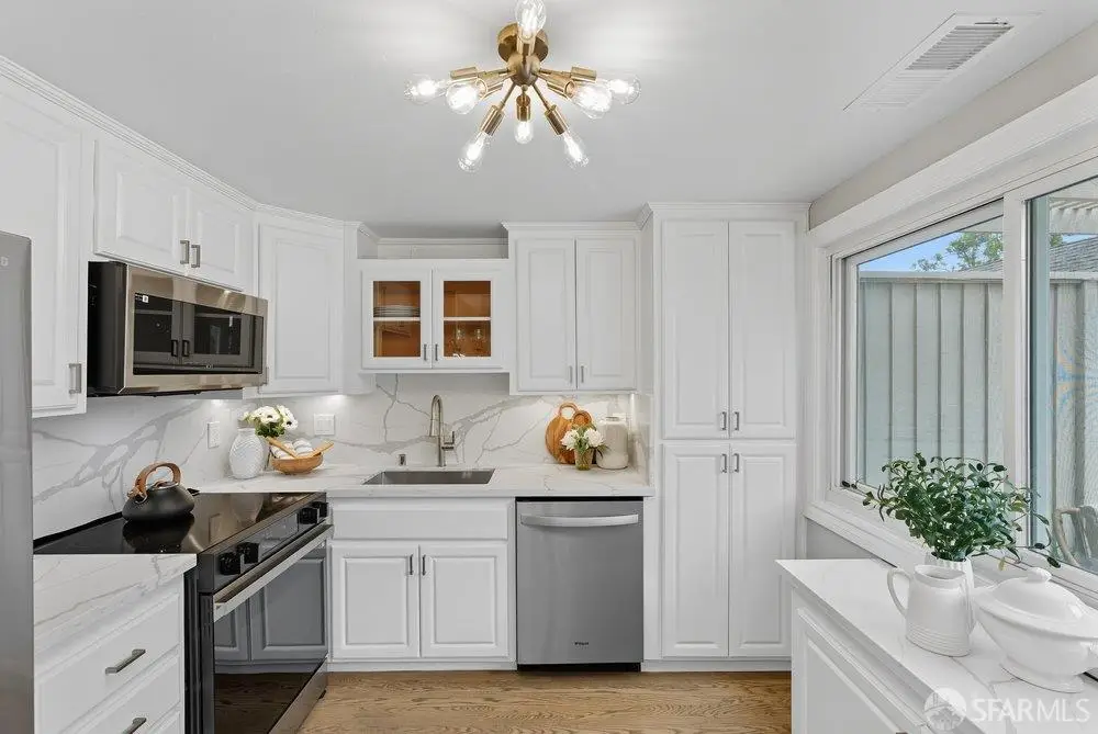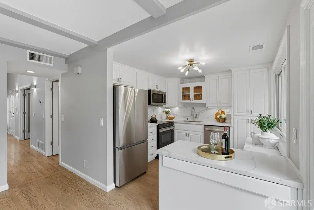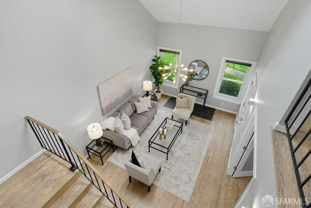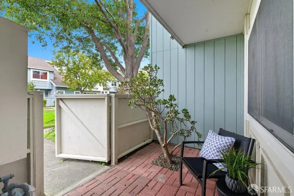 Tastefully remodeled, this residence blends modern upgrades with everyday comfort. Offering 3 bedrooms, 2.5 bathrooms, and a private side-by-side 2-car garage, it sits within one of Foster City's most desirable communities. The bright living room features dramatic double-height ceilings, skylights, and windows overlooking the serene greenbelt. A versatile main-level bedroom doubles as a home office or guest room. Luxury wood flooring flows through the open layout to a private landscaped patio with pergolaideal for morning coffee, entertaining, or evening relaxationwith direct access to the garage for added convenience. The remodeled chef's kitchen boasts marble-style quartz counters, sleek cabinetry, and new stainless-steel appliances, complemented by a spacious dining area. A half bath and side-by-side washer/dryer complete the main level. Upstairs, the primary suite and guest room are enhanced by upgraded bathrooms, plush carpeting, and custom closet shelving. Tucked at the quiet end of the community near the pool and guest parking, this home offers exceptional privacy and easy access to scenic trails, open greenbelts, community parks, and Highways 101 & 92, perfectly nestled between SF & Silicon Valley tech hubs.